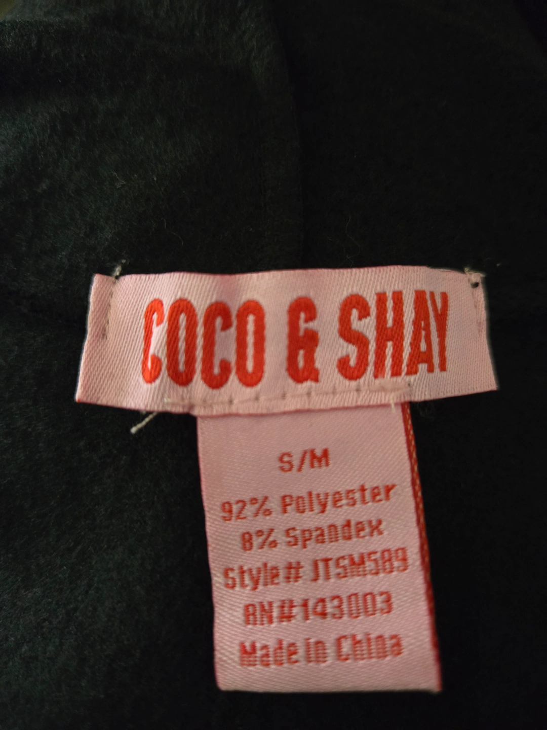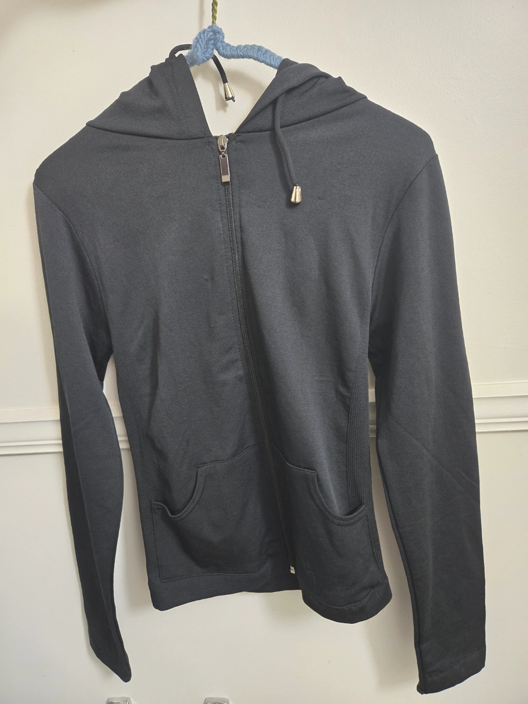 Women's black zip-up hoodie. Small. Features a drawstring hood and kangaroo pockets. 92% polyester, 8% spandex. Made in China.