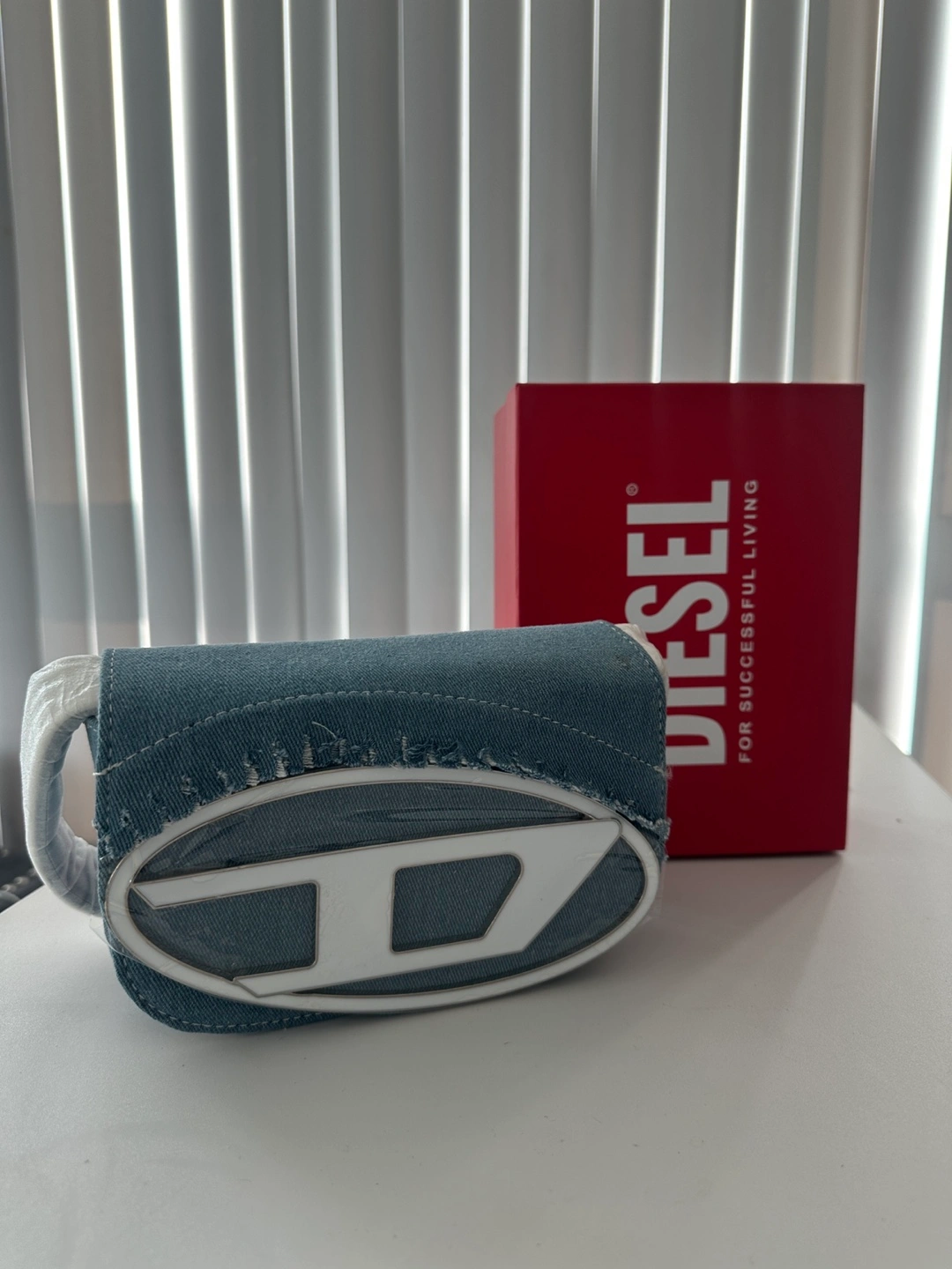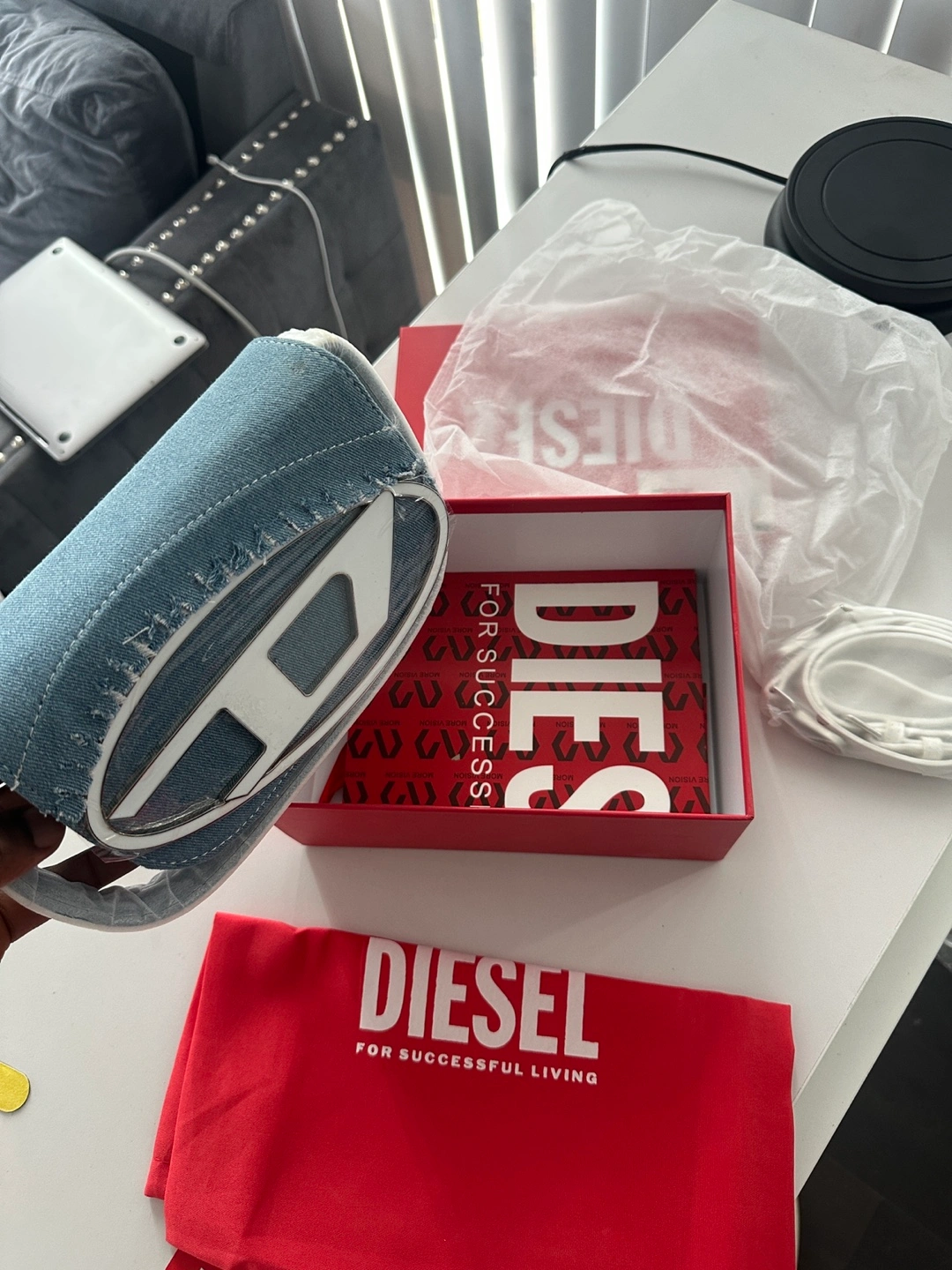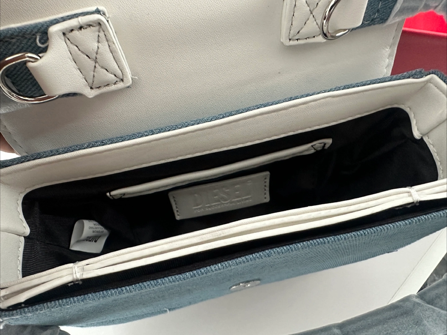 Blue denim crossbody bag. Features white accents and a distinctive Diesel logo. Comes with original box and dust bag.