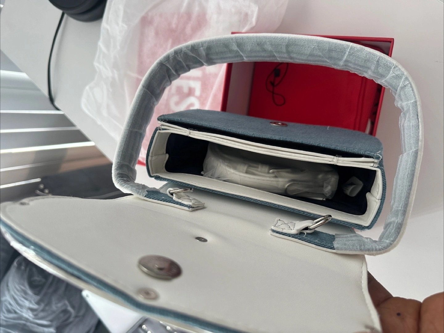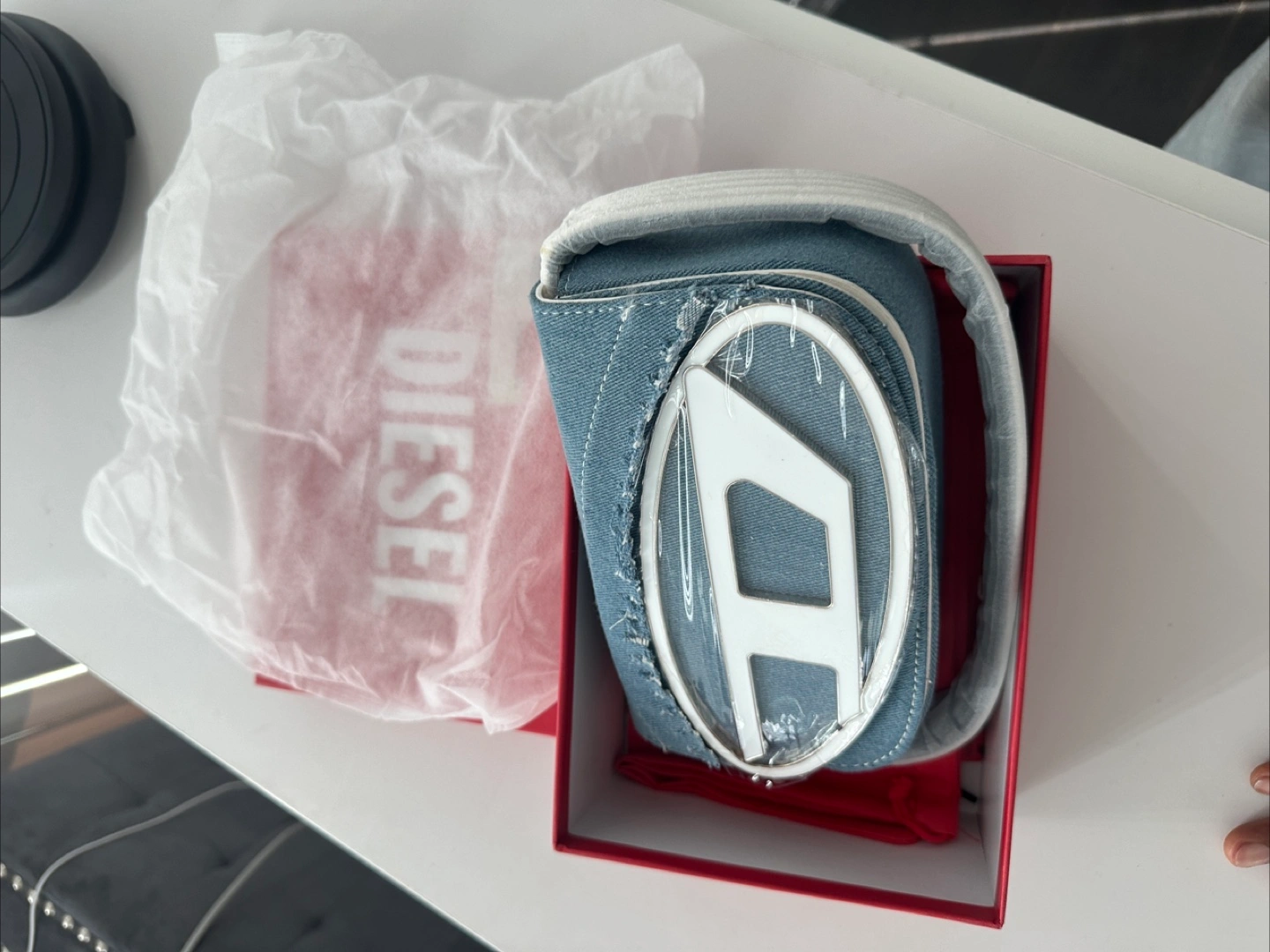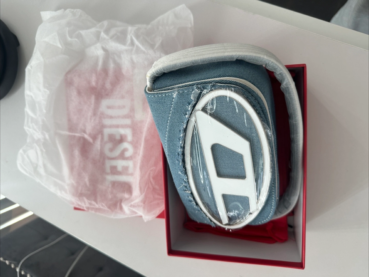 Blue denim crossbody bag. Features white accents and a distinctive Diesel logo. Comes with original box and dust bag.
