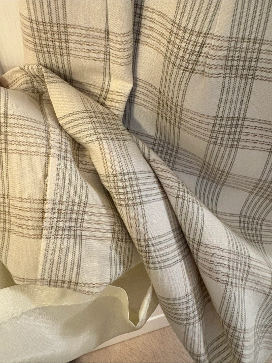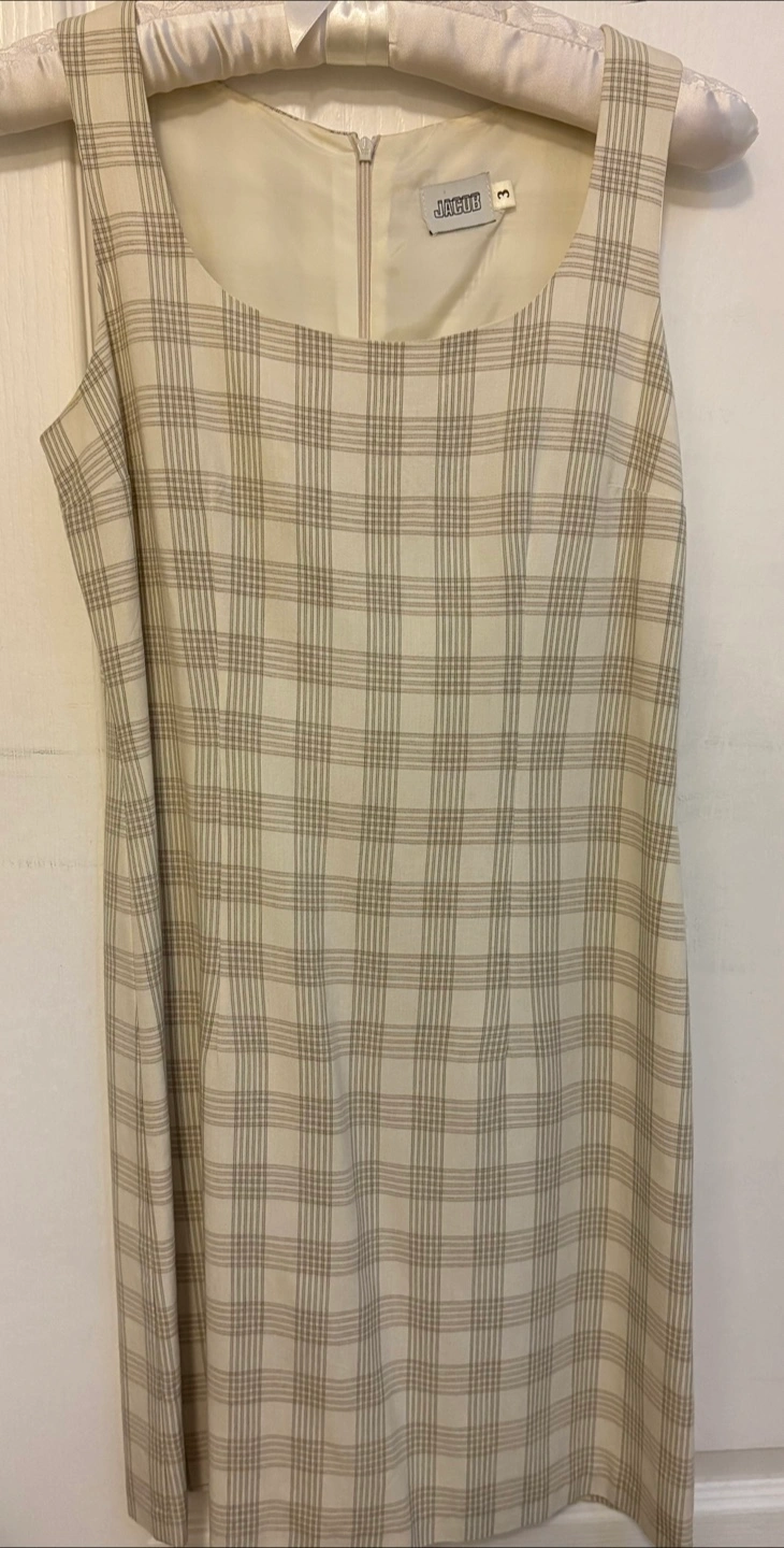 Cream and brown plaid sleeveless mini dress. Back zipper closure. Simple, classic style. Perfect for a summer event.