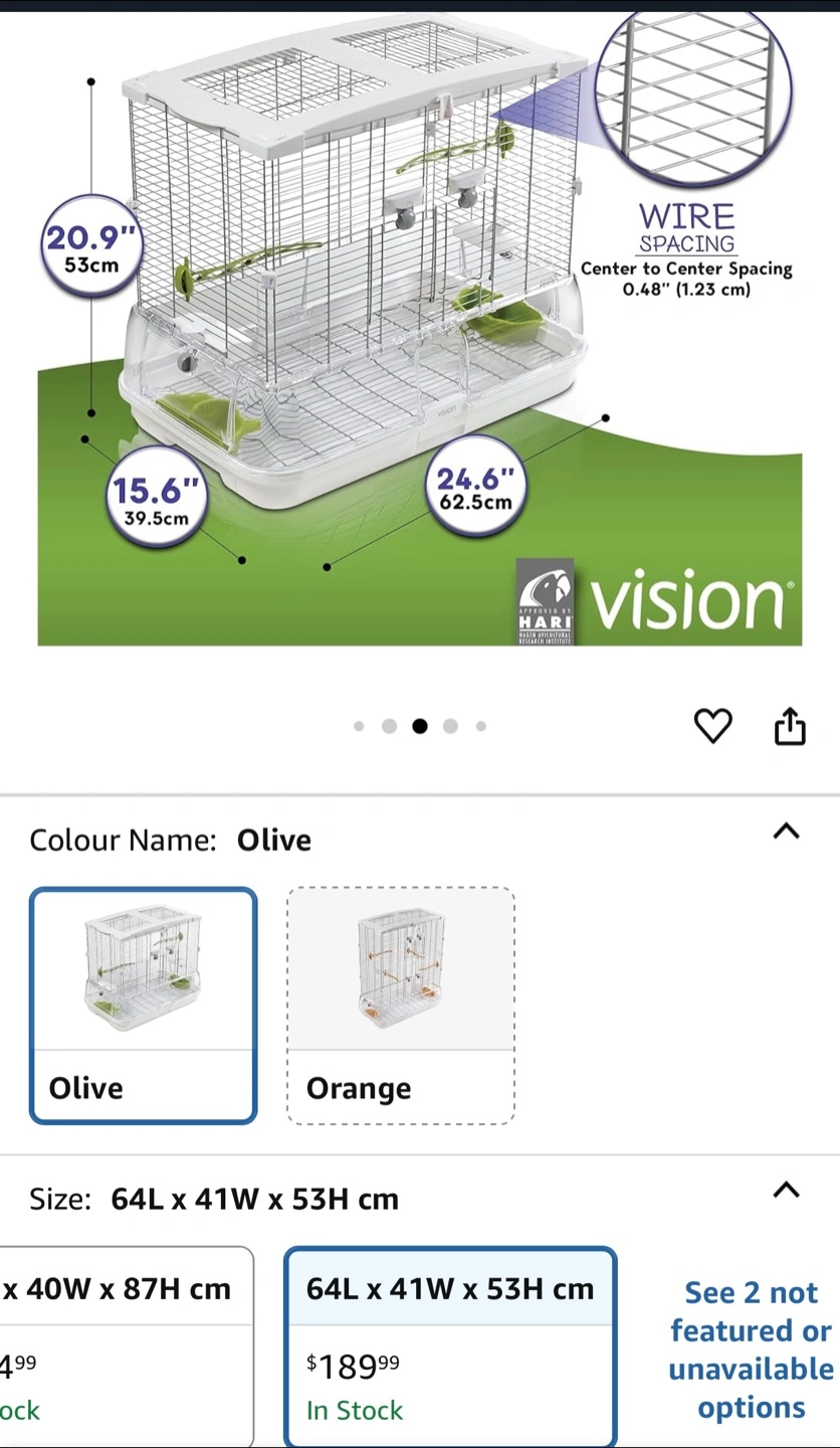 Spacious bird cage. Measurements: 64L x 41W x 53H cm. Olive colour. Includes pull-out tray and food/water dishes. Great for small to medium-sized birds.