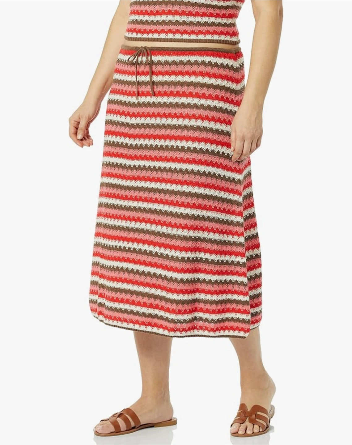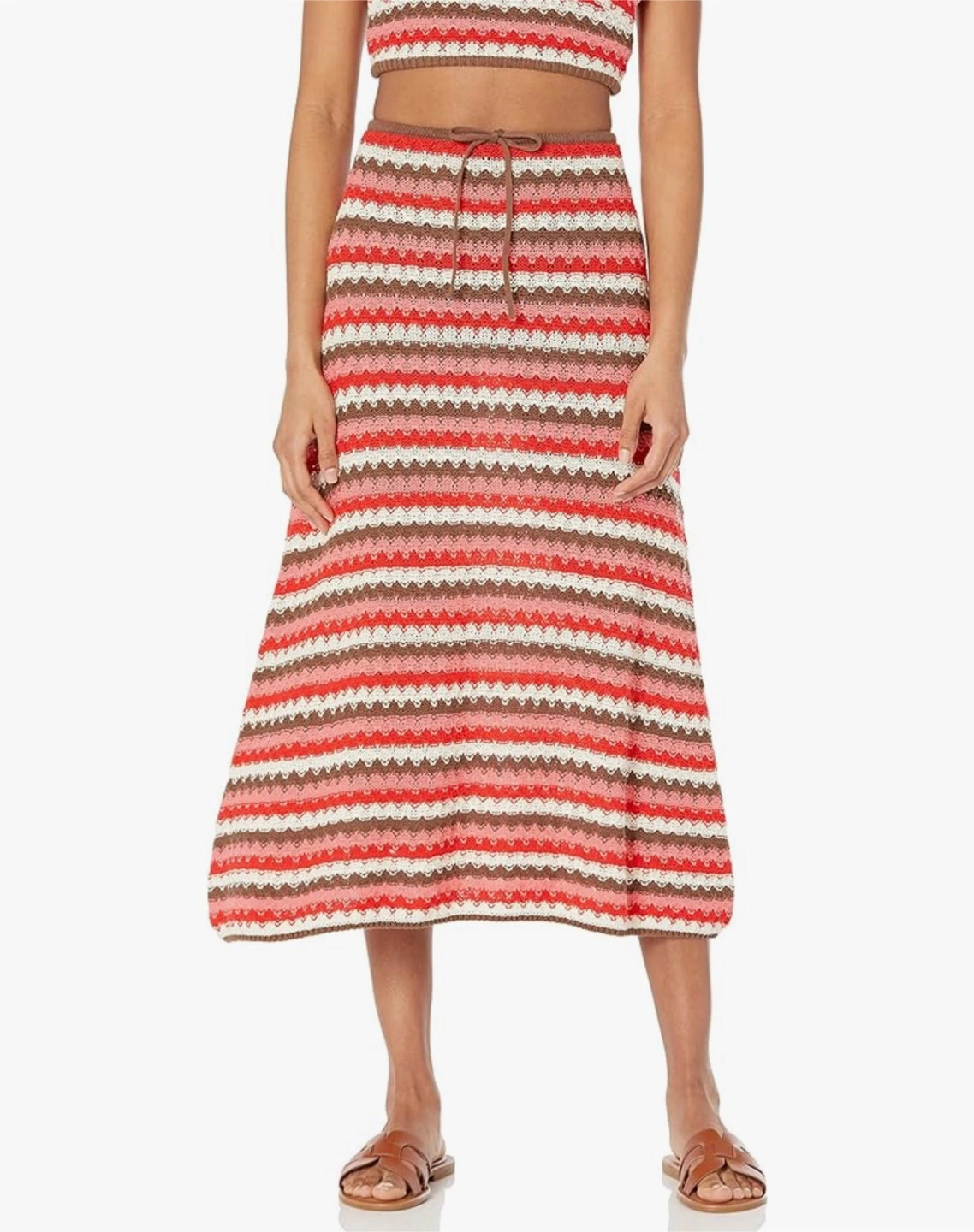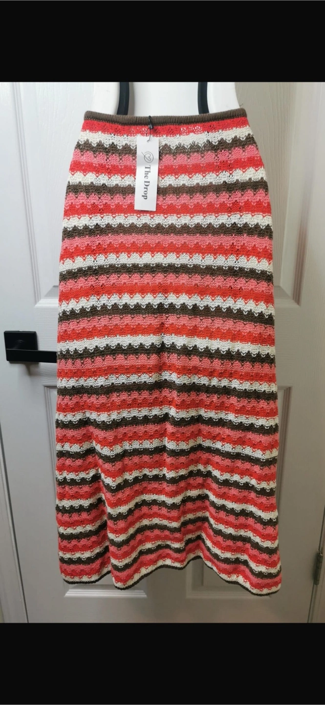New with tag! Retails for $69 This skirt is 30"/76 cm long Fit: Regular- designed to follow the body - neither loose nor clingy Cotton Crochet Unlined The Drop is your inside source for must-have style inspiration from global influencers. Shop limited-edition collections and discover chic wardrobe essentials from Staples by the Drop. Look out for trend inspiration, exclusive brand collaborations, and expert styling tips from those in the know. Women's midi skirt. Features horizontal stripes in red, brown, and cream. Knit fabric. Elastic waistband with drawstring. A-line silhouette. Looks great with a matching top.