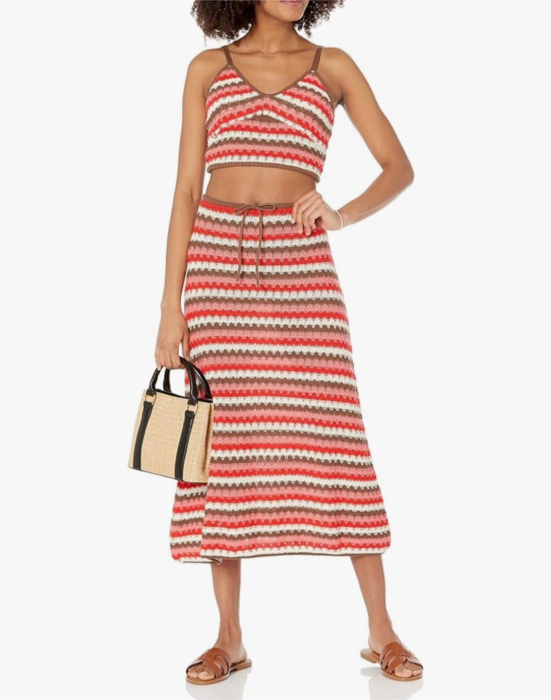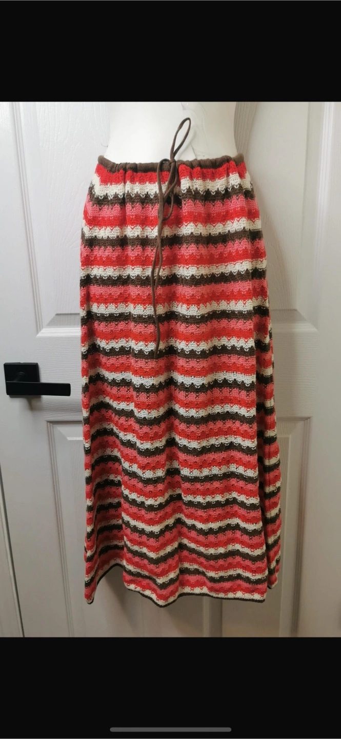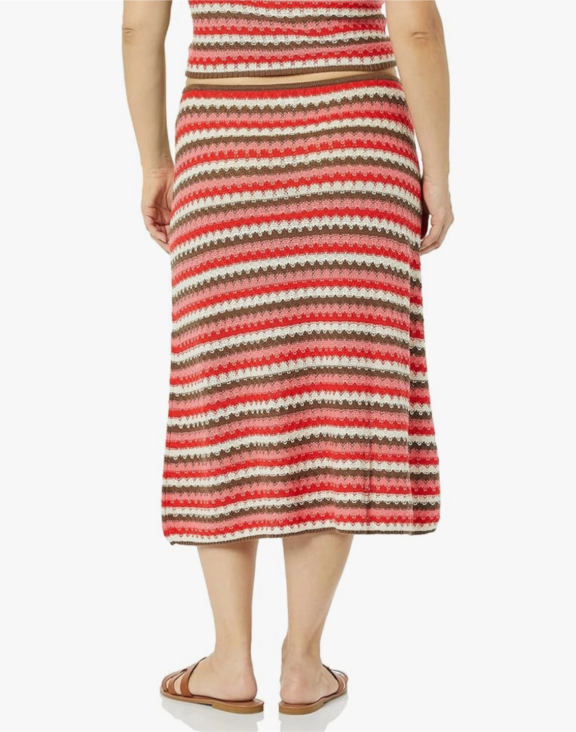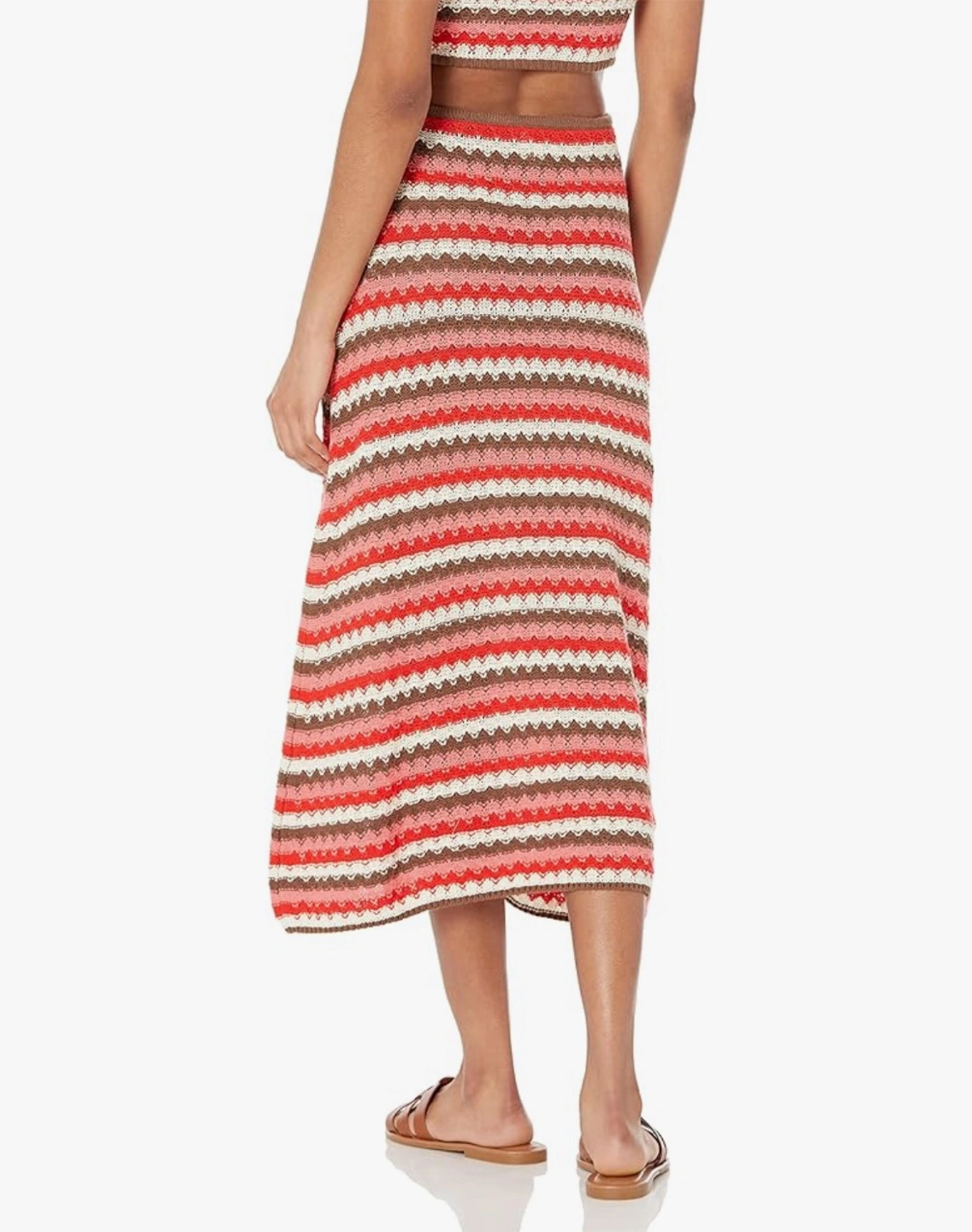 New with tag! Retails for $69 This skirt is 30"/76 cm long Fit: Regular- designed to follow the body - neither loose nor clingy Cotton Crochet Unlined The Drop is your inside source for must-have style inspiration from global influencers. Shop limited-edition collections and discover chic wardrobe essentials from Staples by the Drop. Look out for trend inspiration, exclusive brand collaborations, and expert styling tips from those in the know. Women's midi skirt. Features horizontal stripes in red, brown, and cream. Knit fabric. Elastic waistband with drawstring. A-line silhouette. Looks great with a matching top.