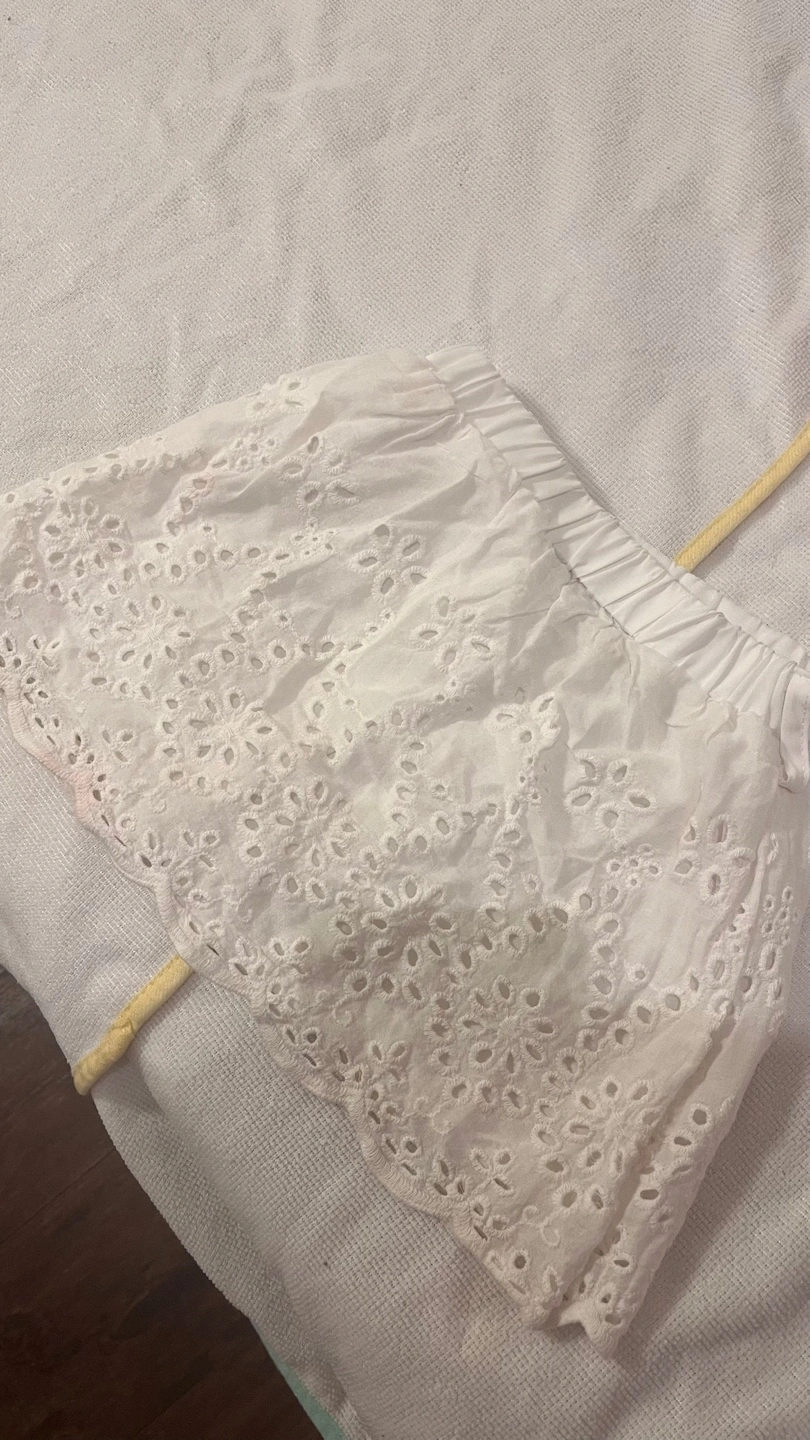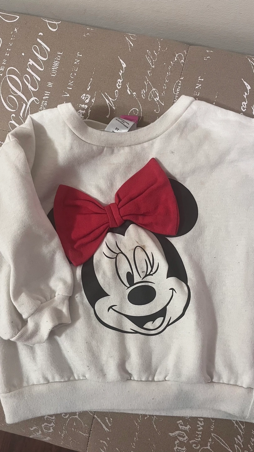 Both of them for 4$ Adorable toddler girl's outfit. Features a cream-coloured sweatshirt with a Minnie Mouse graphic and a matching red bow. Also includes a white eyelet skirt. Great for spring or summer.