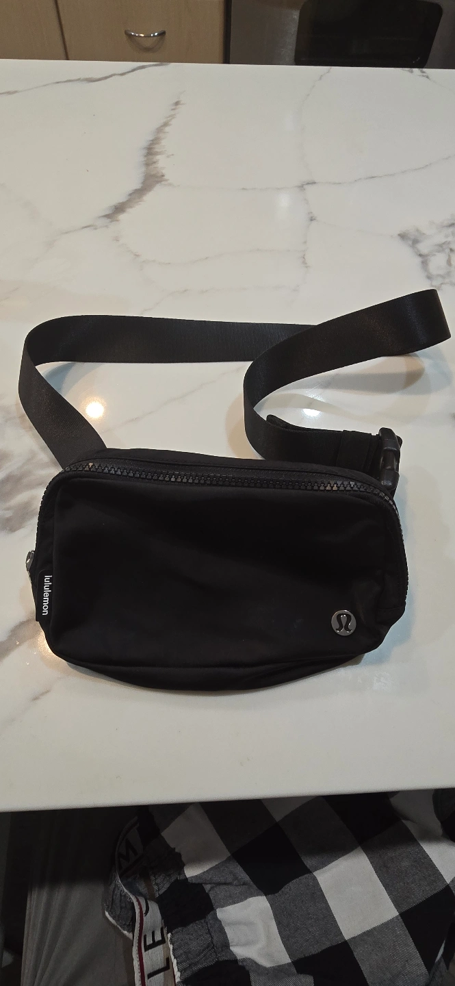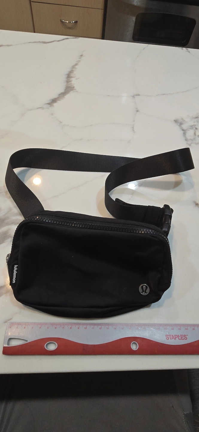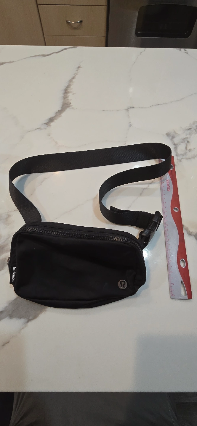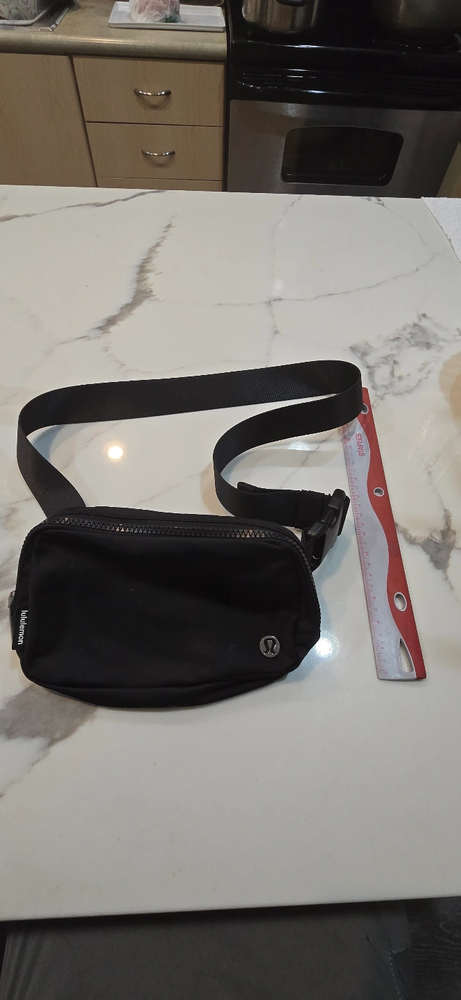 Small black waist bag. Adjustable strap. Zipper closure. Great for carrying essentials.