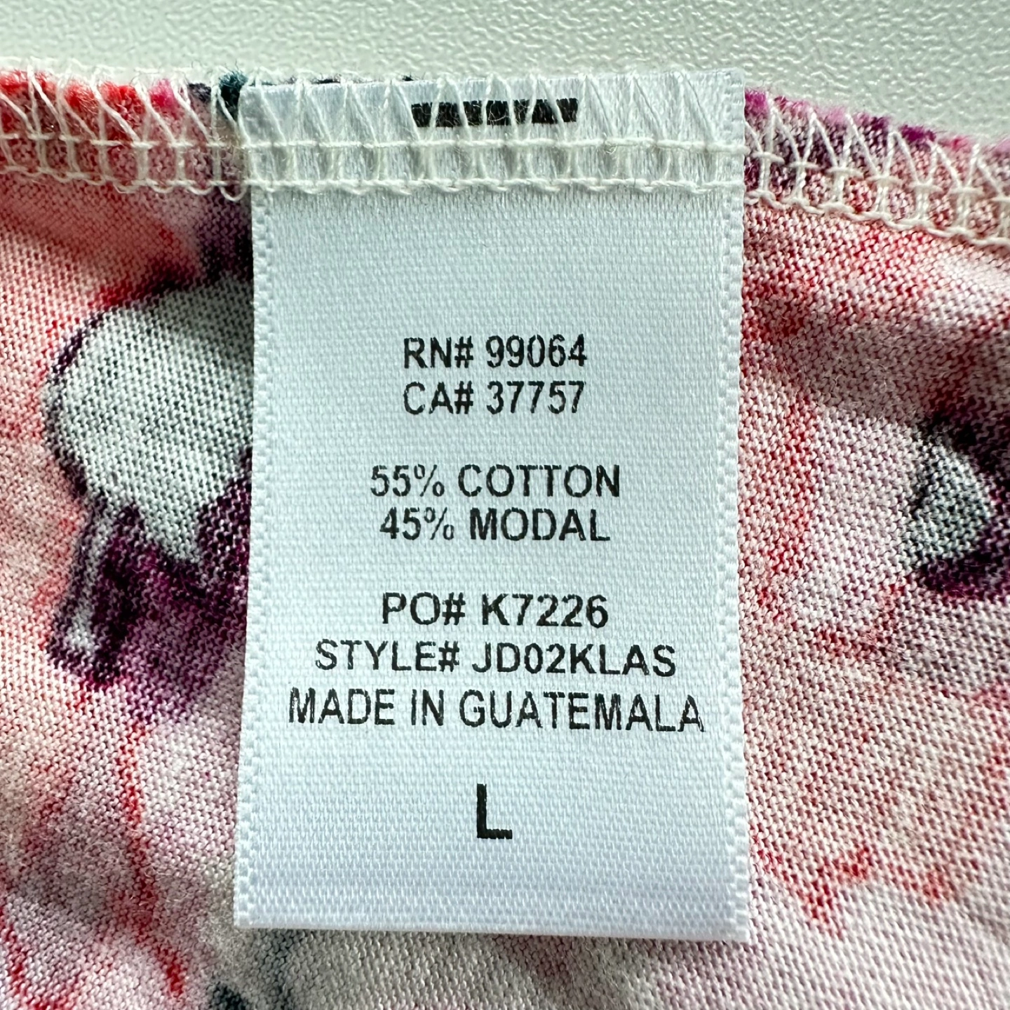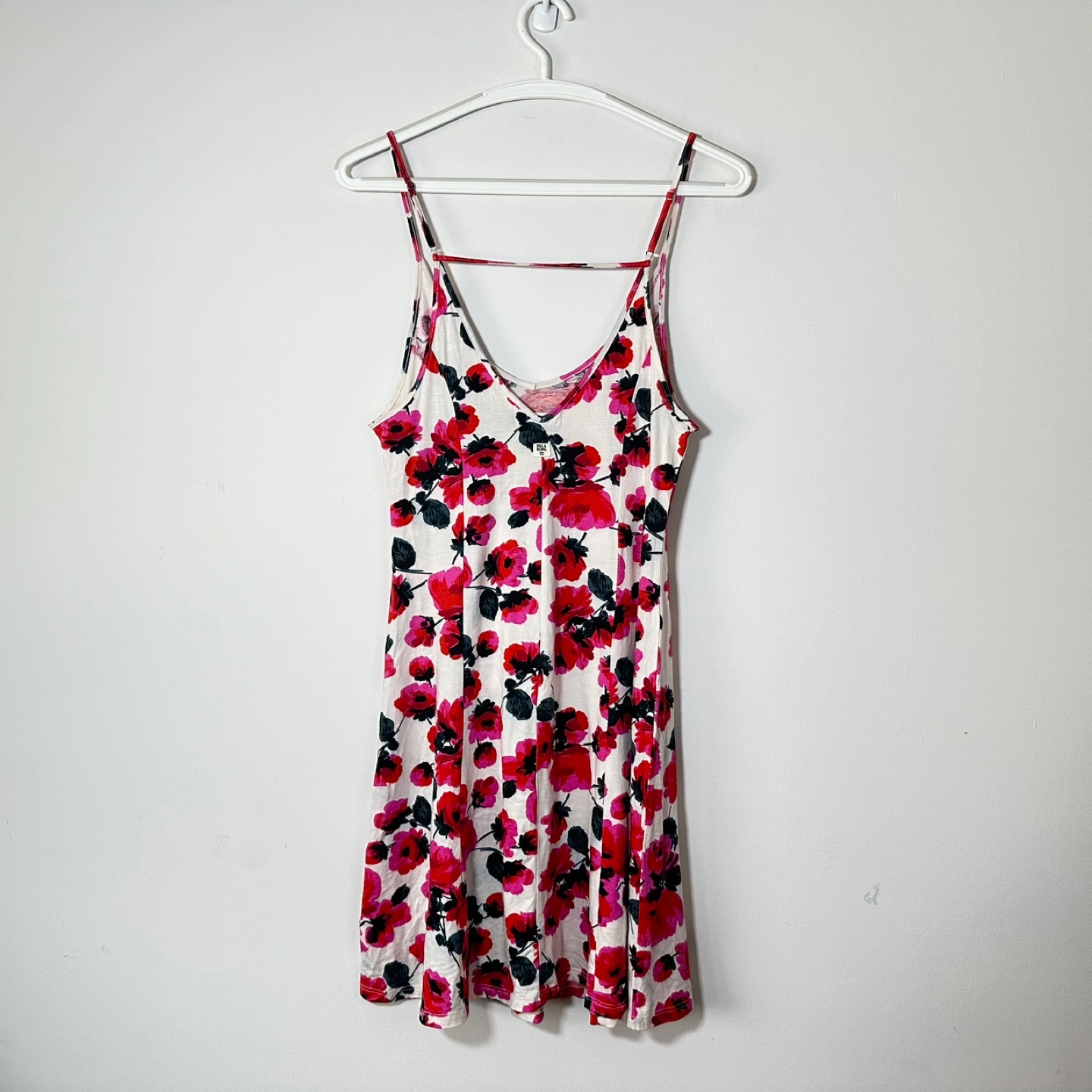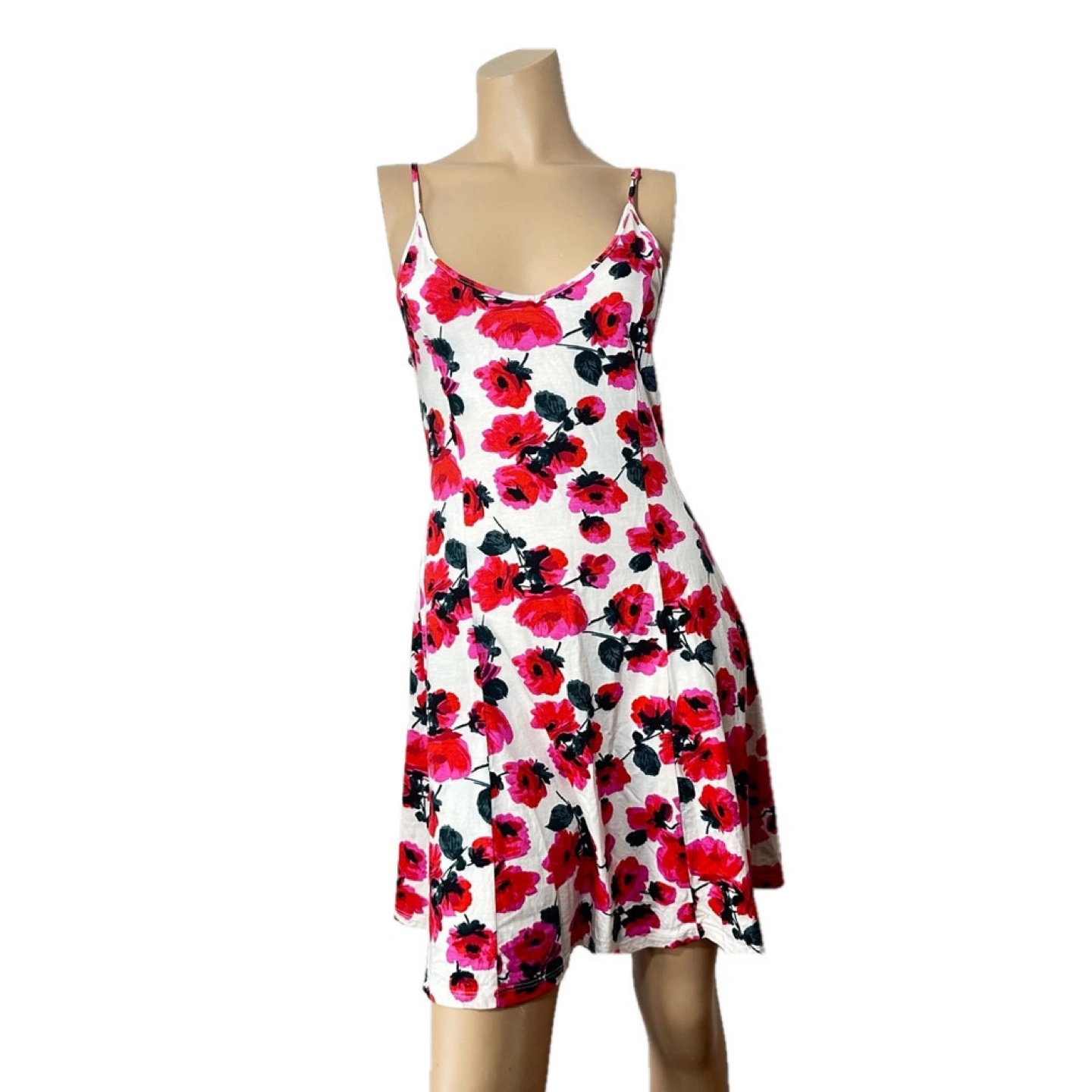 Red and pink floral print. White background. Spaghetti straps. Open back. A-line silhouette. Summer dress. Lightweight material.