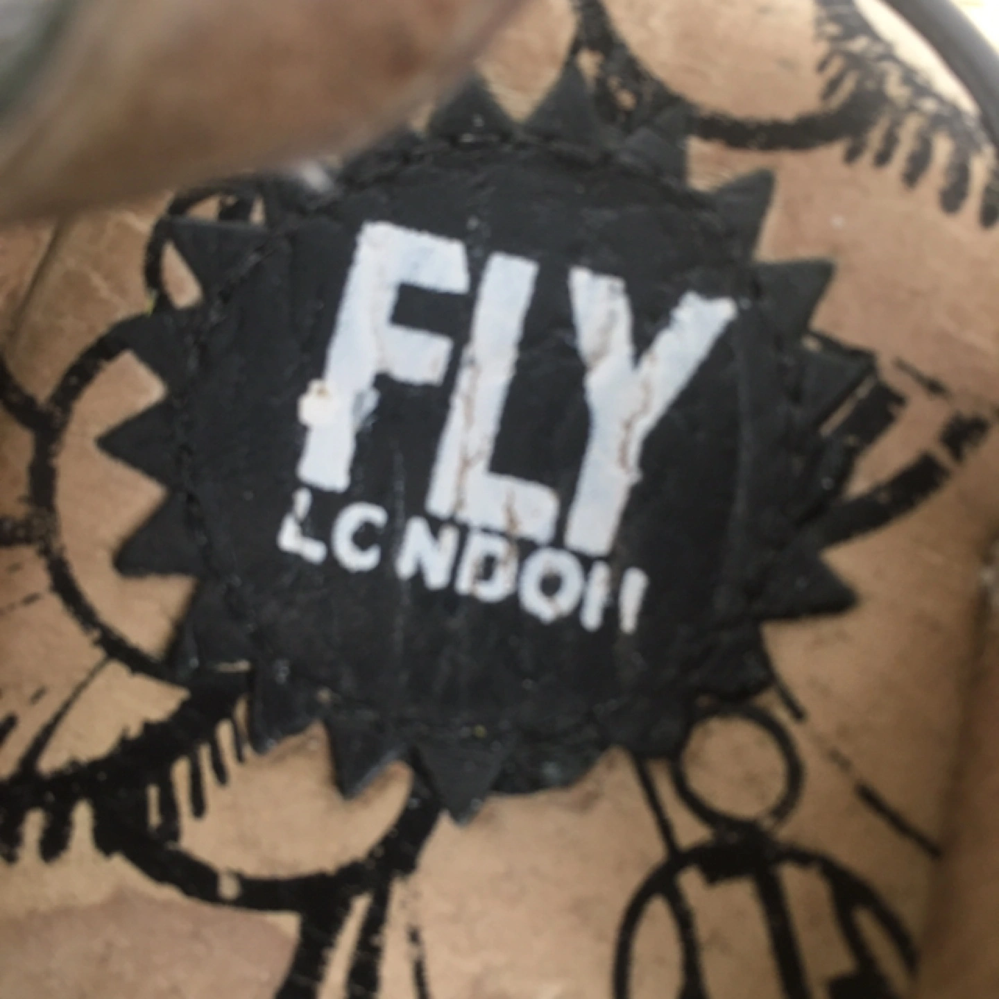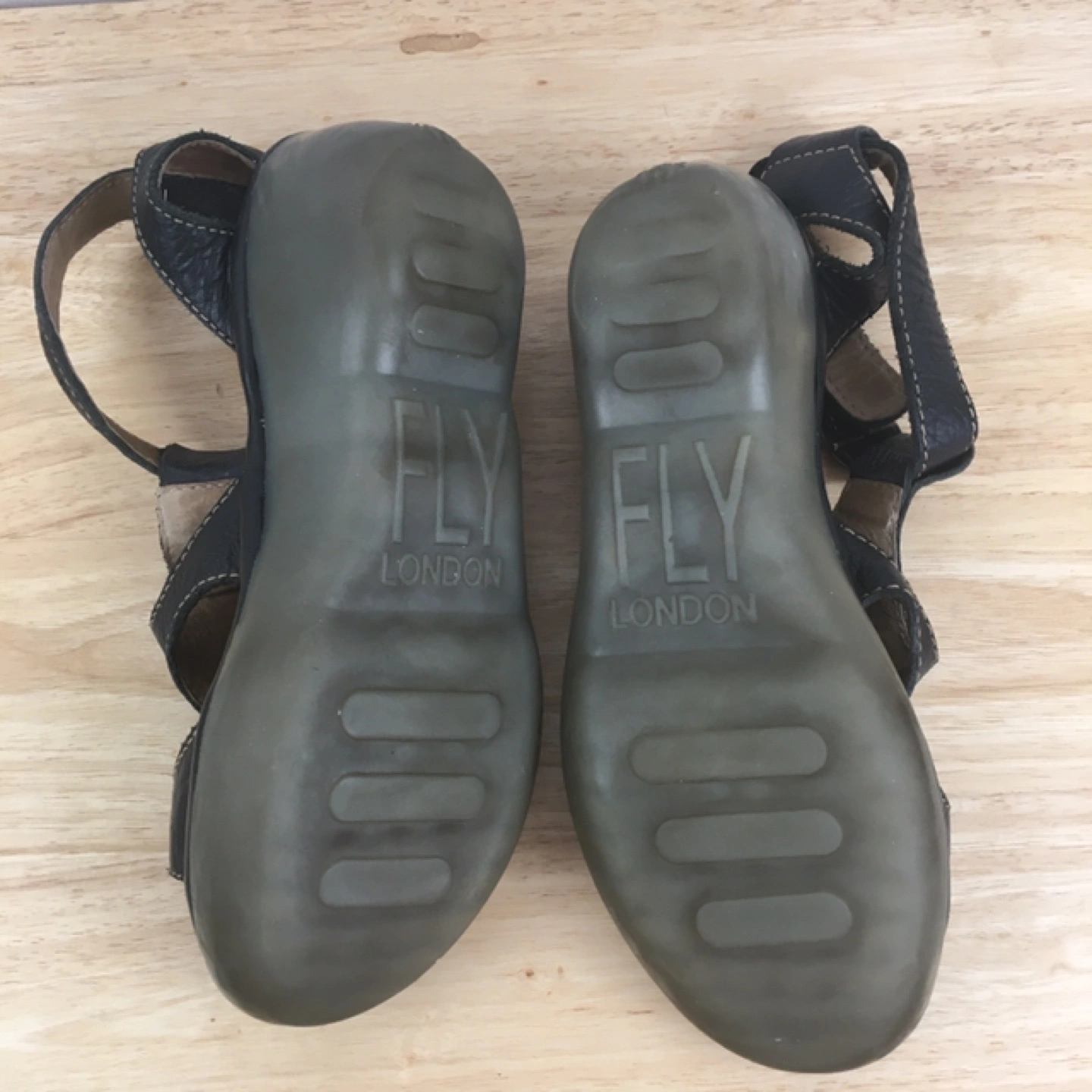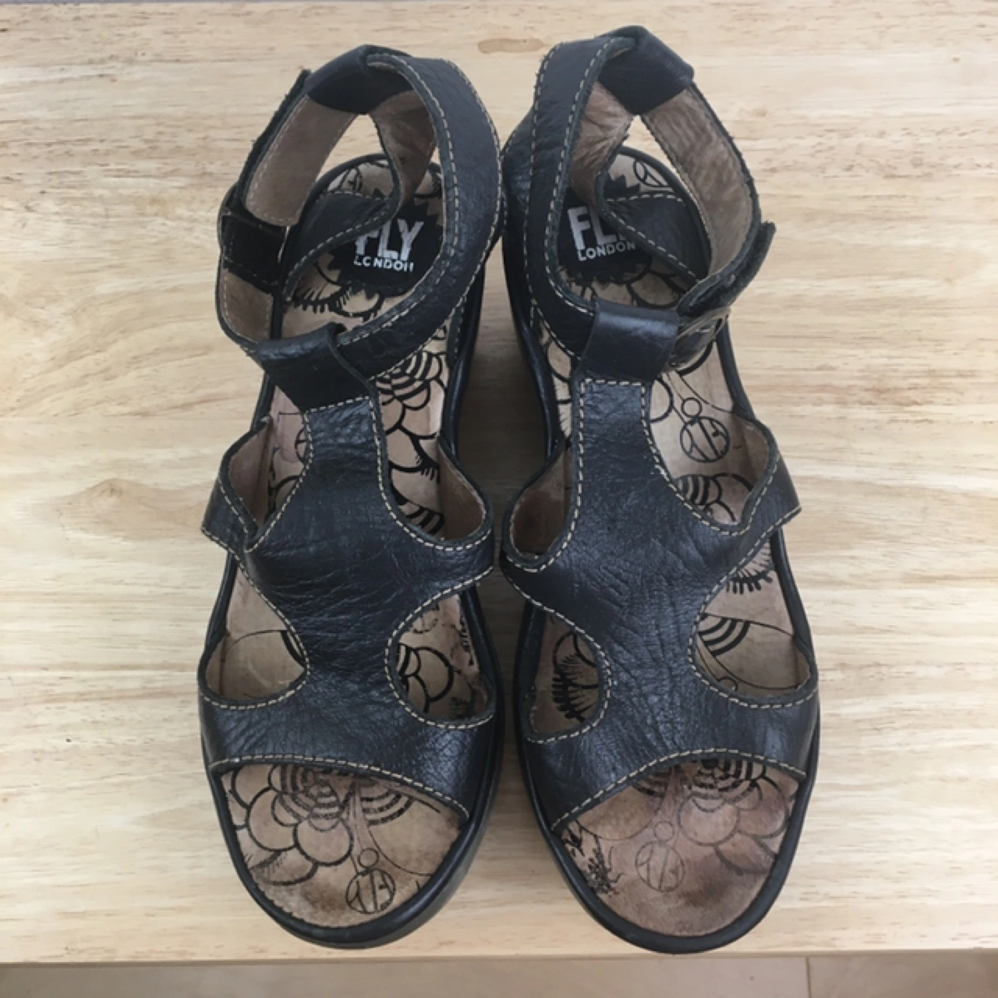 Pair of Fly London black leather wedge sandals. Cut-out design. Ankle velcro strap closure. Good condition.