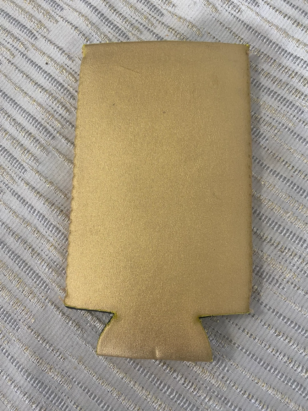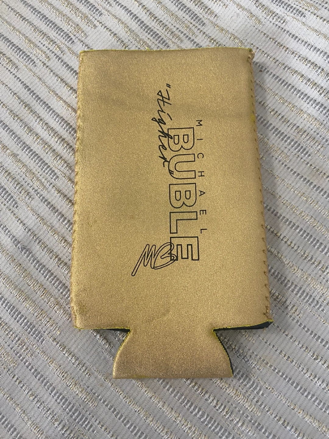Gold can cooler. Features Michael Bublé's signature and name. Keeps drinks cold.