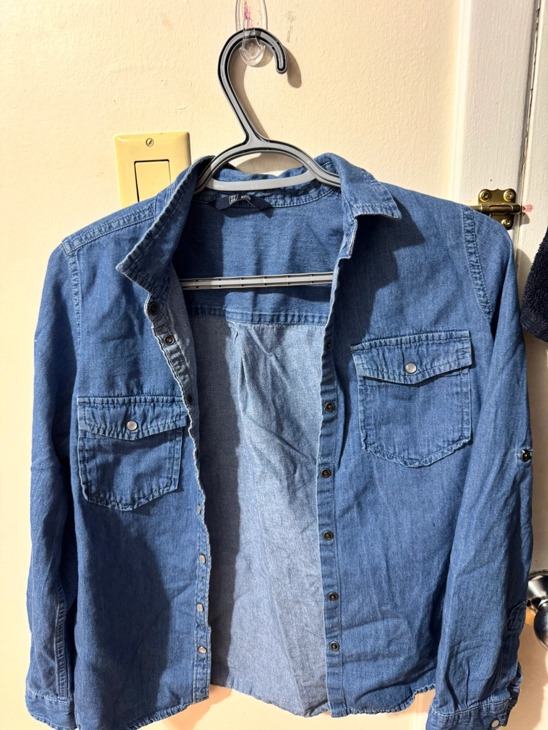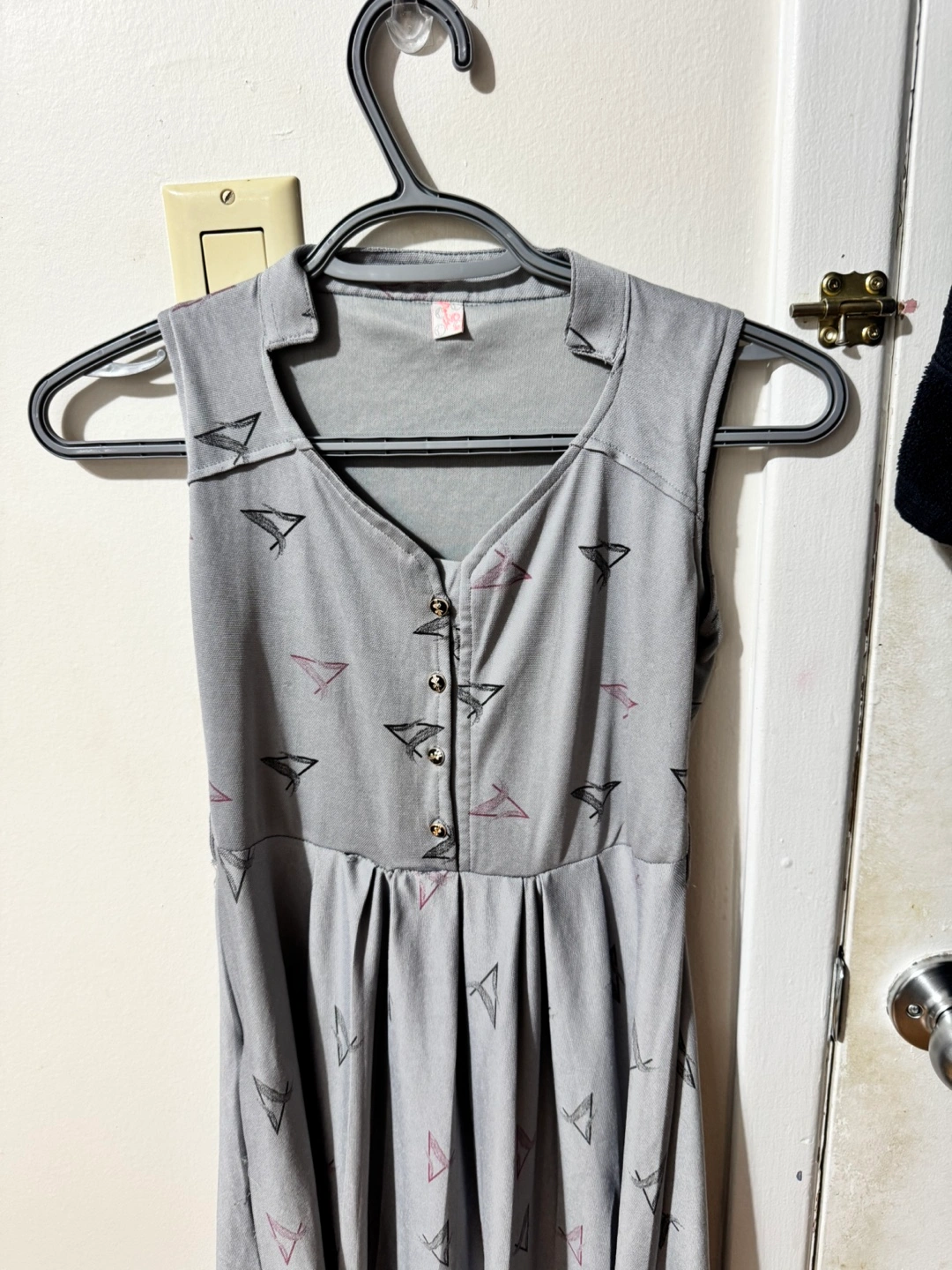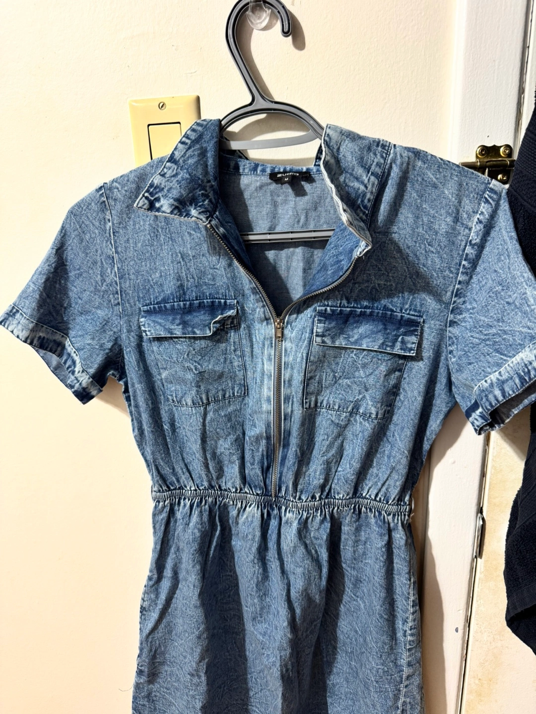 Bundle includes five women's clothing items. Black ribbed short-sleeve turtleneck top. Light wash denim zip-up jumper dress. Dusty rose long-sleeve polka dot top. Light wash denim button-up shirt. Grey sleeveless dress with origami bird print. Various sizes.