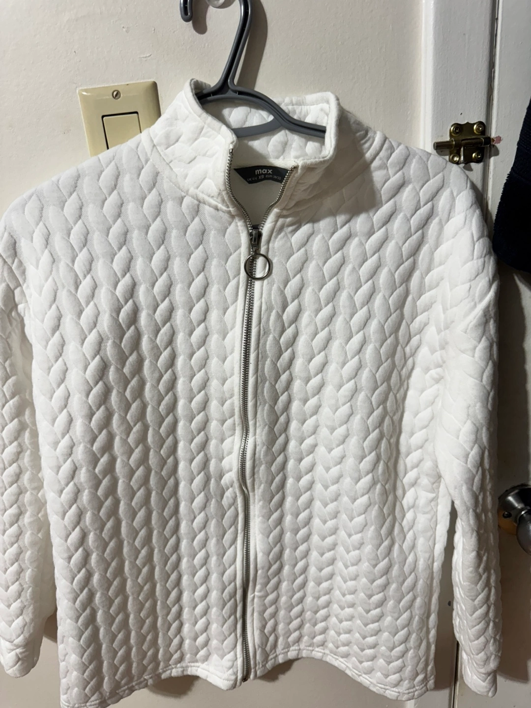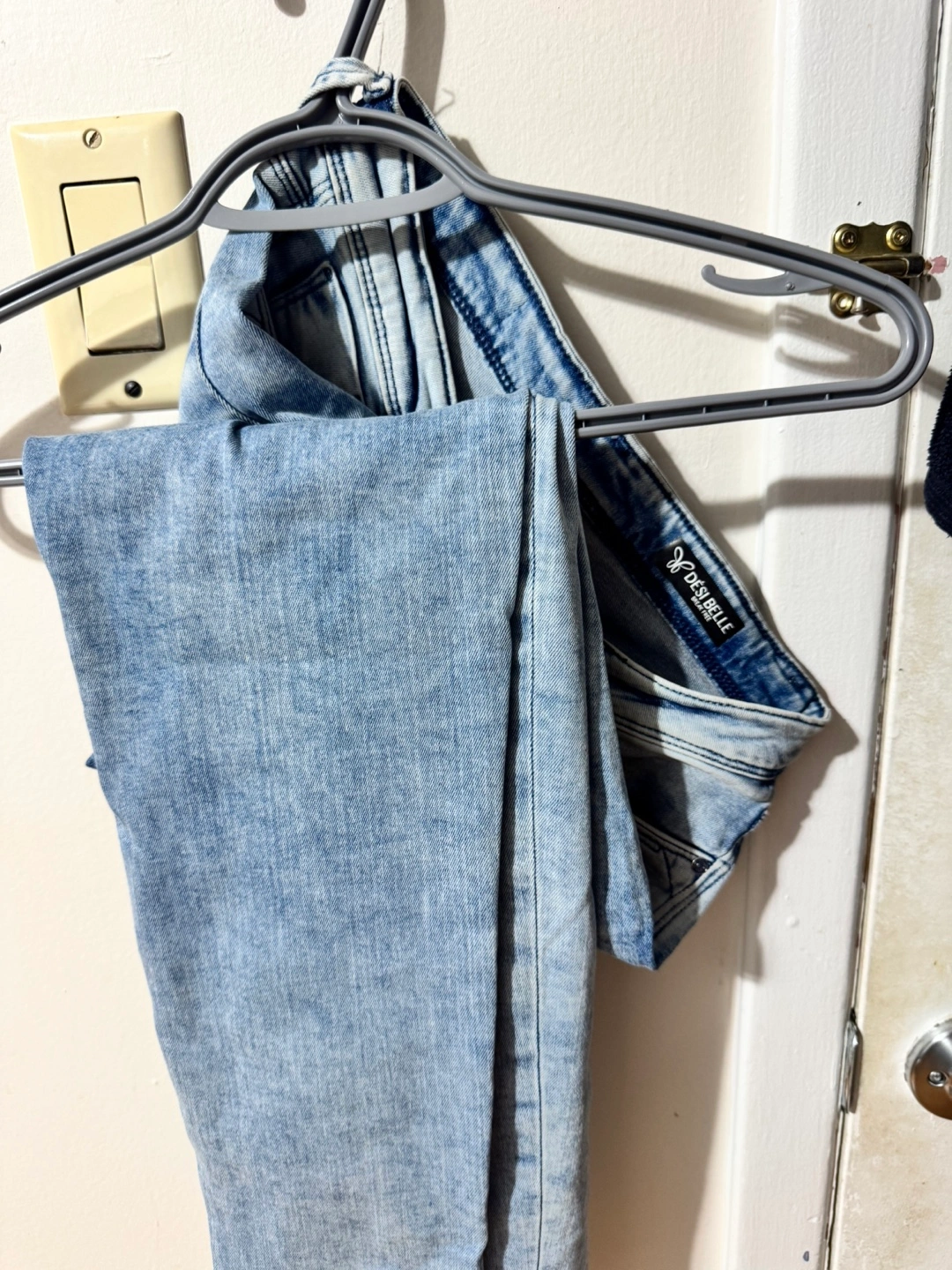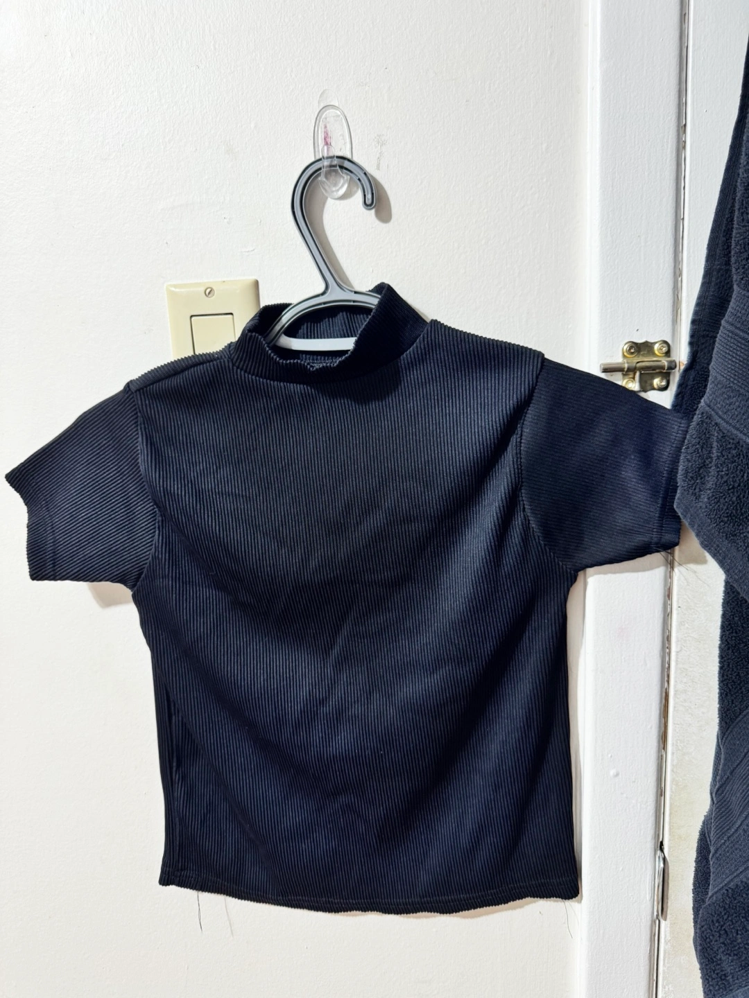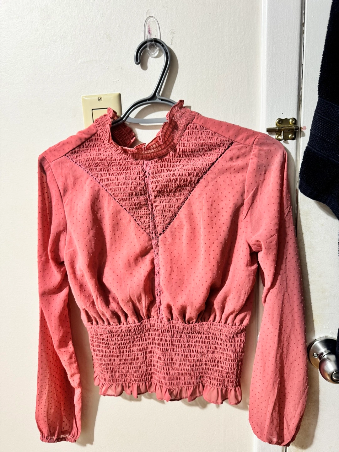 Bundle includes five women's clothing items. Black ribbed short-sleeve turtleneck top. Light wash denim zip-up jumper dress. Dusty rose long-sleeve polka dot top. Light wash denim button-up shirt. Grey sleeveless dress with origami bird print. Various sizes.