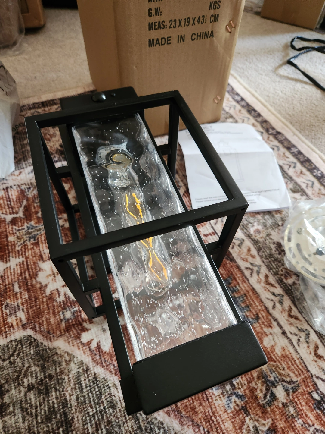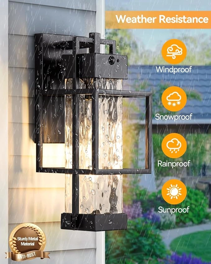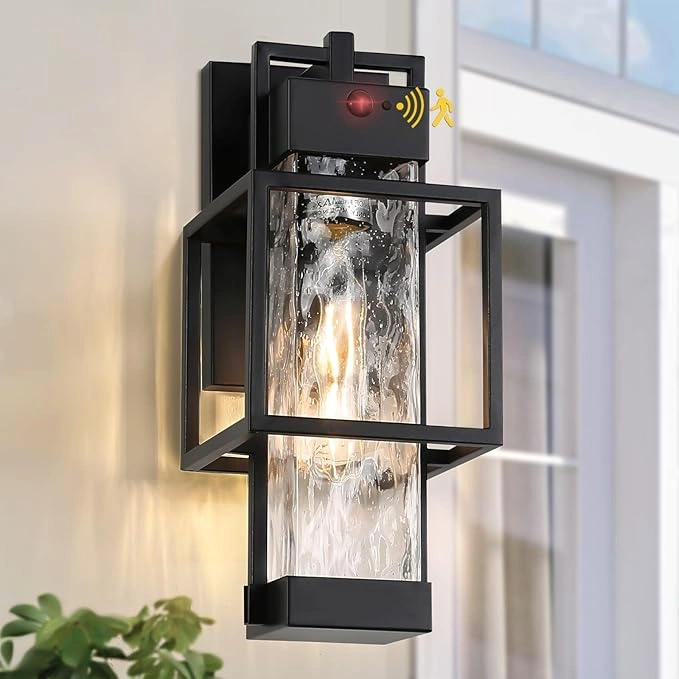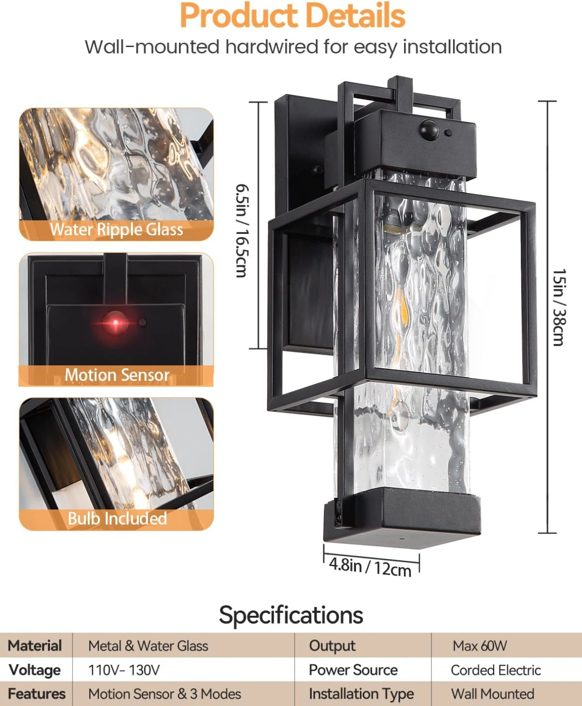 Modern outdoor wall-mounted light fixture. Features a motion sensor, water ripple glass, and black metal frame. Includes bulb. Easy installation. Weather resistant, windproof, snowproof, rainproof and sunproof.
