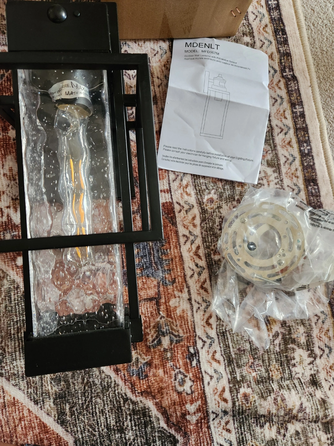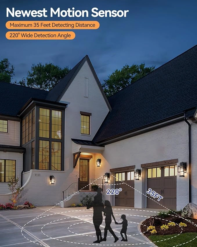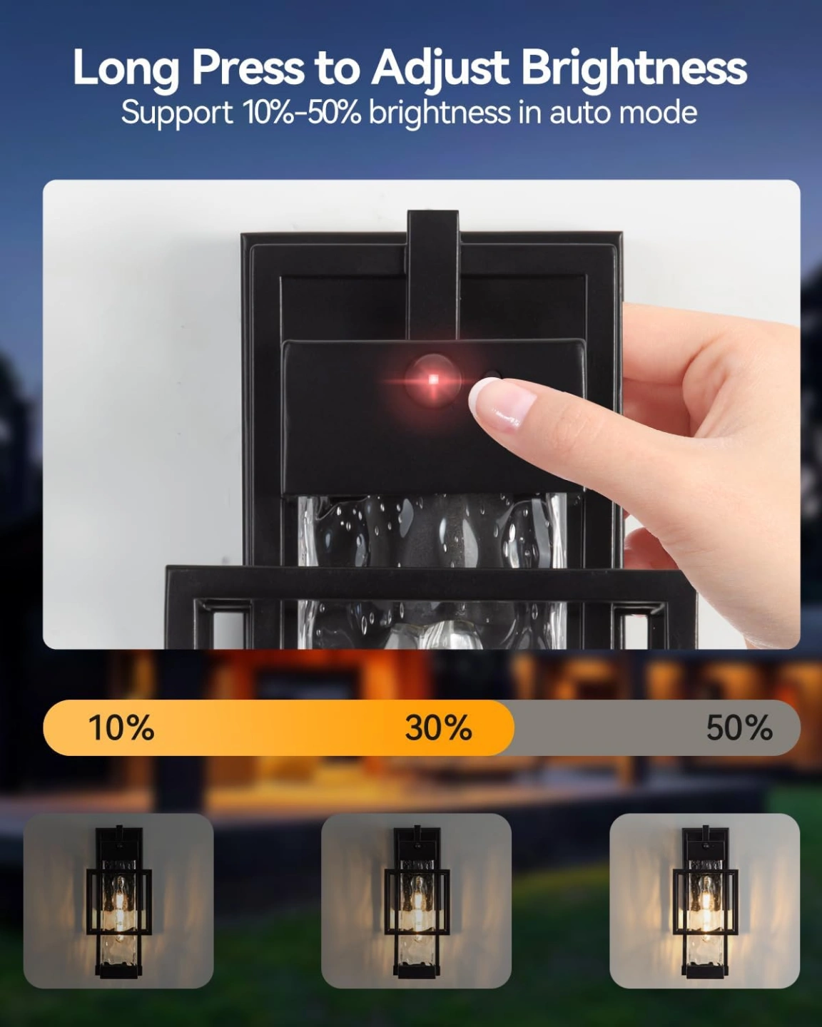 Modern outdoor wall-mounted light fixture. Features a motion sensor, water ripple glass, and black metal frame. Includes bulb. Easy installation. Weather resistant, windproof, snowproof, rainproof and sunproof.