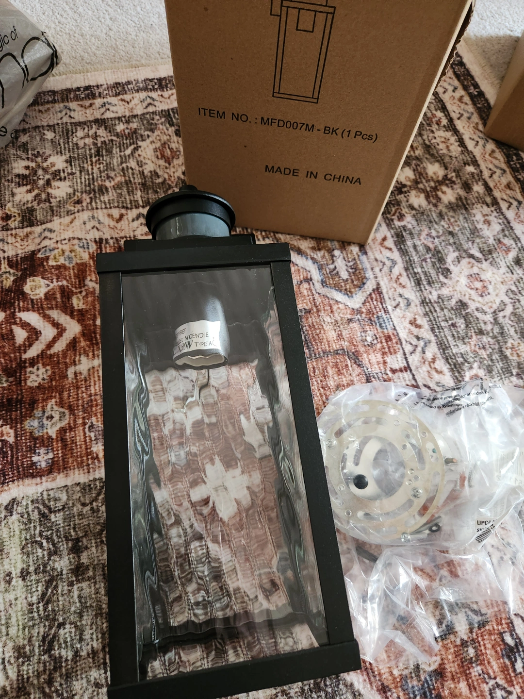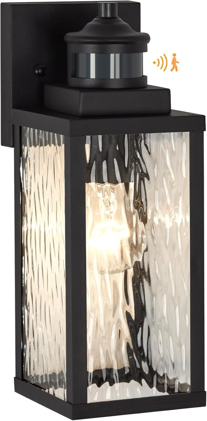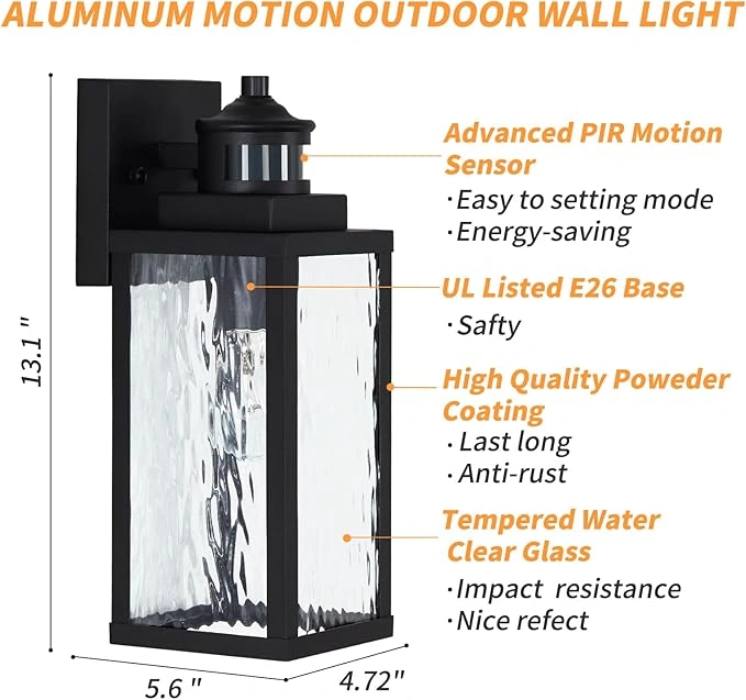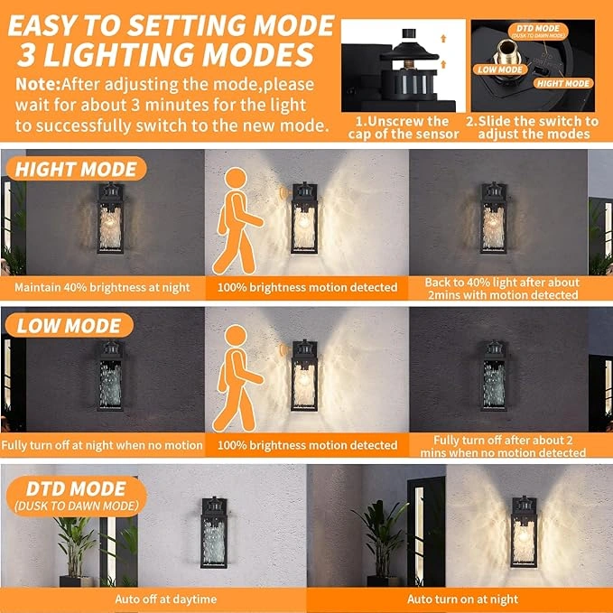 Black outdoor wall light fixture. Features motion sensor with three adjustable lighting modes. Waterproof, heat-resistant, storm-proof, and snow-proof. Includes mounting hardware.