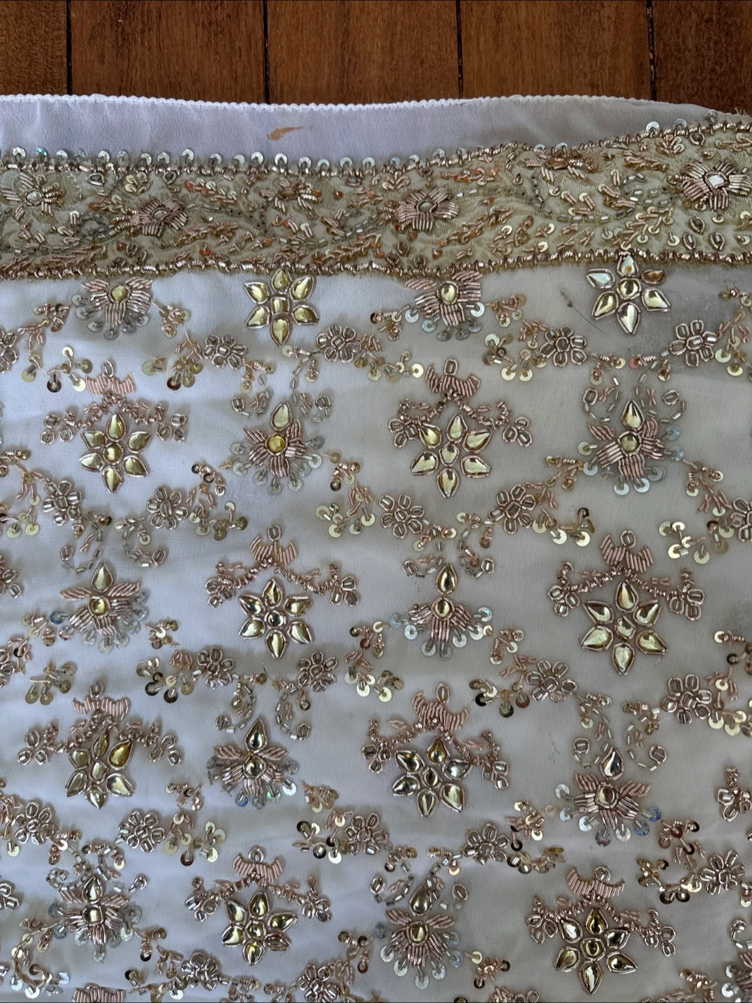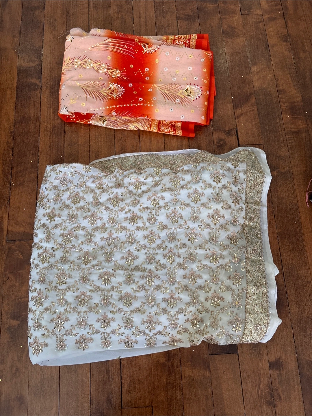 Gorgeous two-piece saree set. One saree features an ombre design, the other is ornately embroidered with sequins and beads. Stunning detail throughout. Perfect for special occasions.