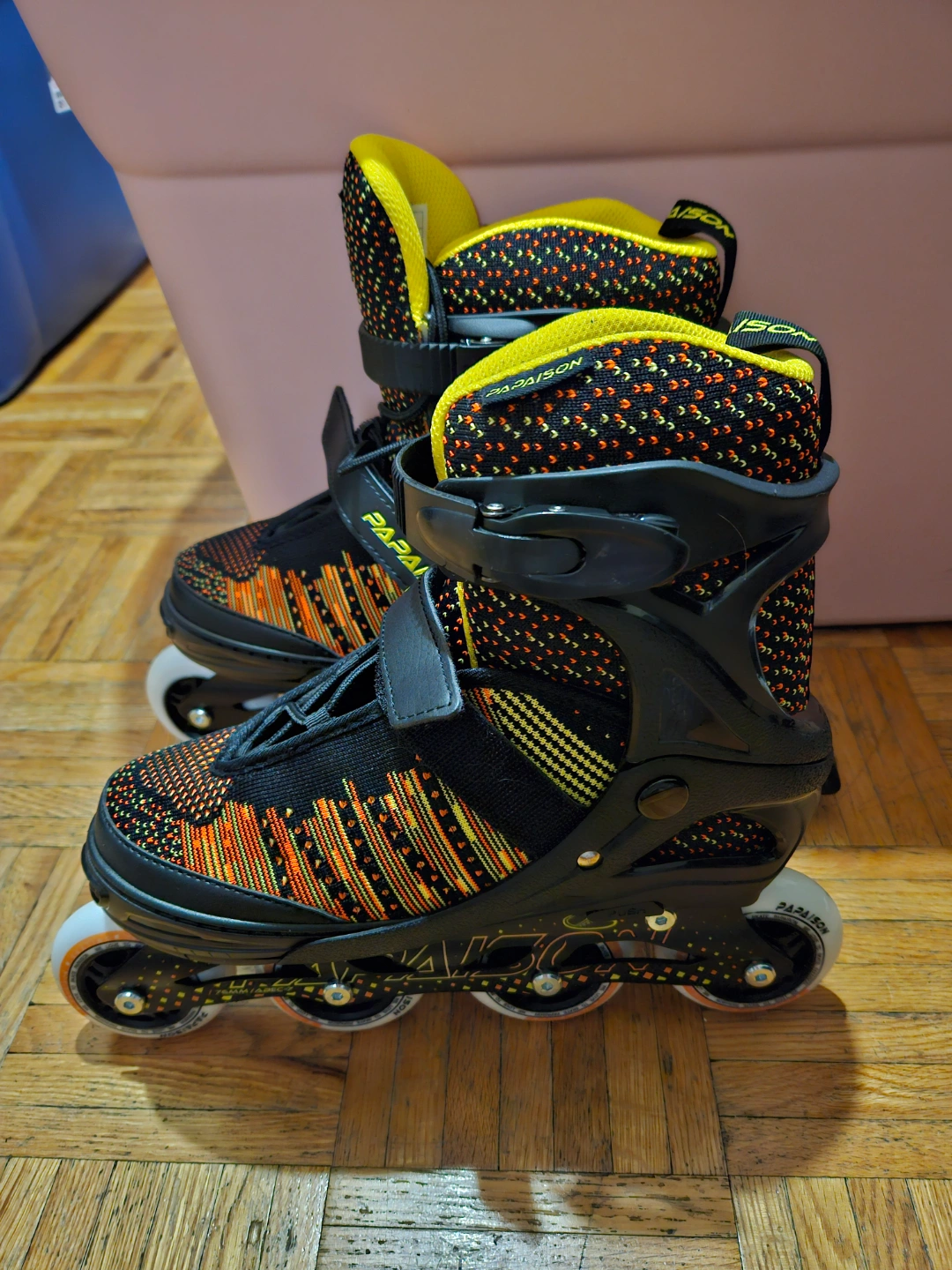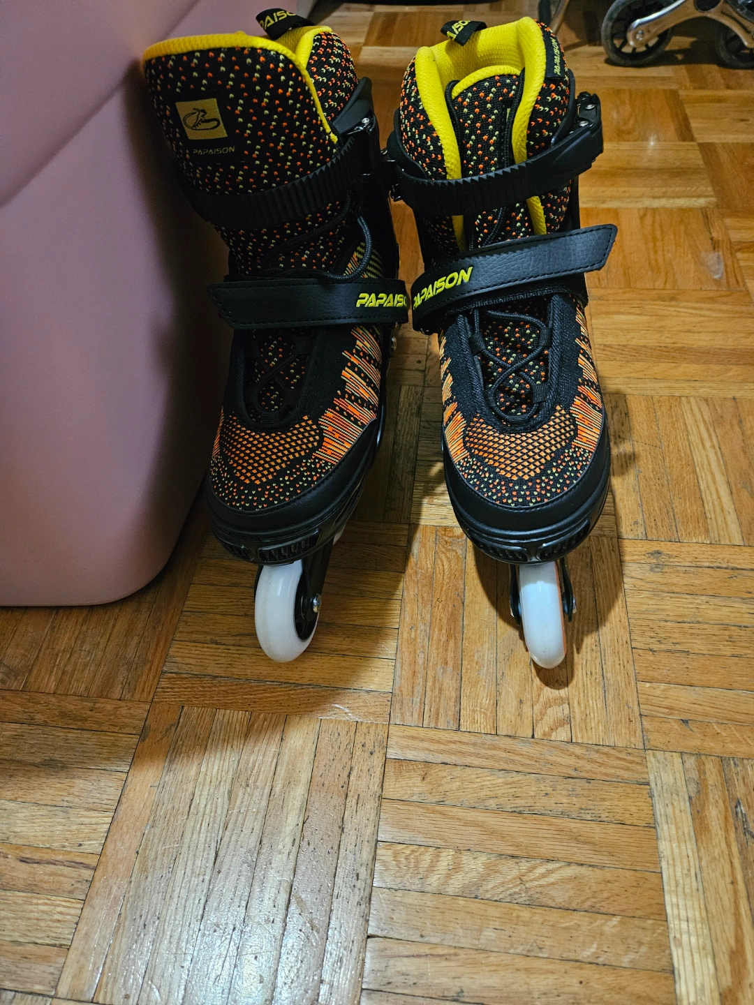Adjustable inline skates. Black, orange, and yellow colour scheme. Great for kids or adults. Fits size 6 to 8. Do not have box for it just the dust bags. Has light up wheels.