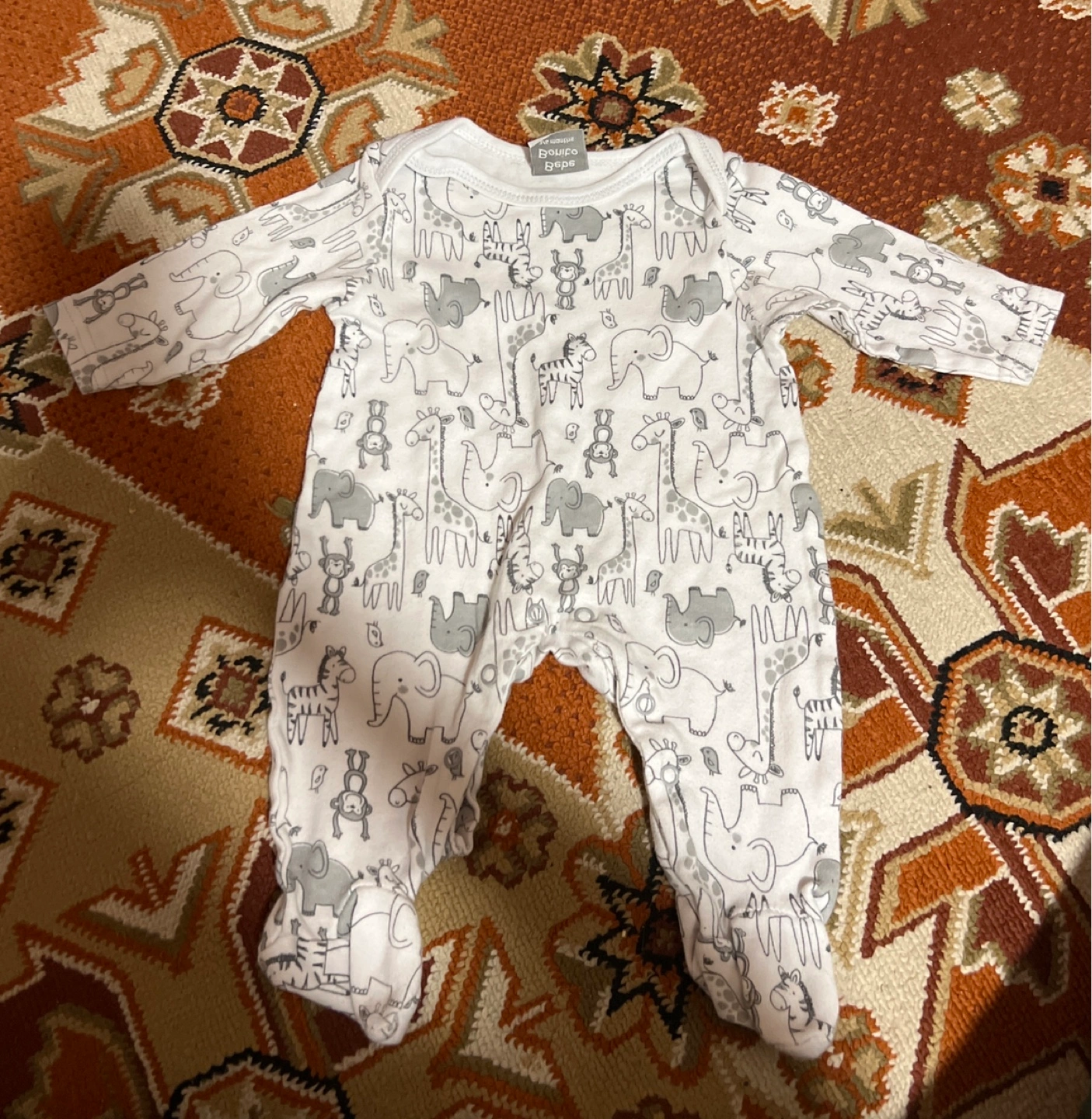Adorable baby onesie. Features a long-sleeved design and cute safari animal print. Suitable for newborns or infants.