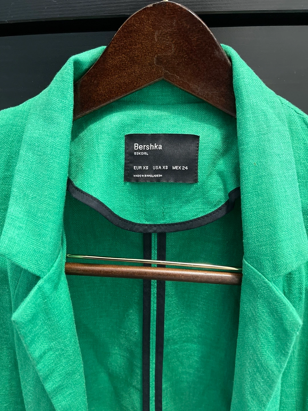 Lightweight green linen blazer. Size XS but fits to S-M. Features pockets and rolled-up sleeves. Open front.