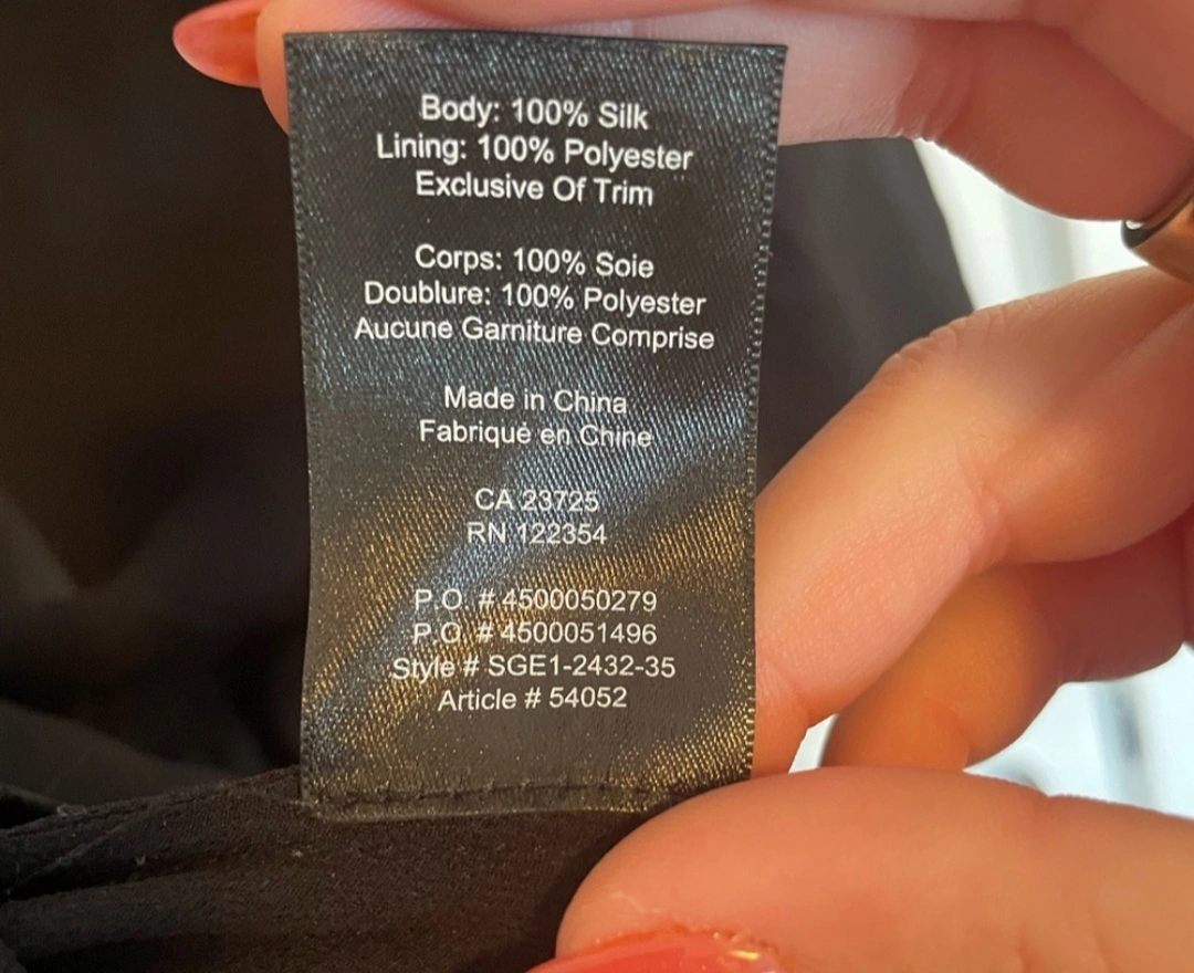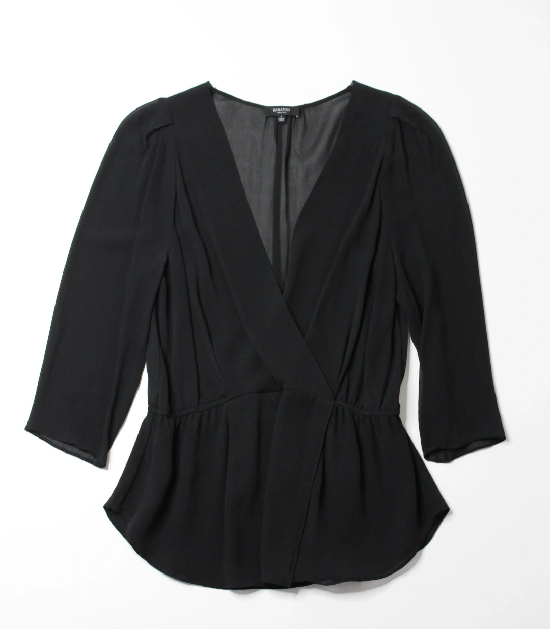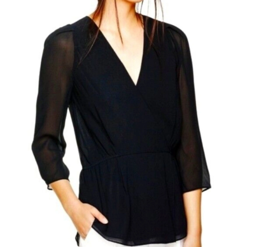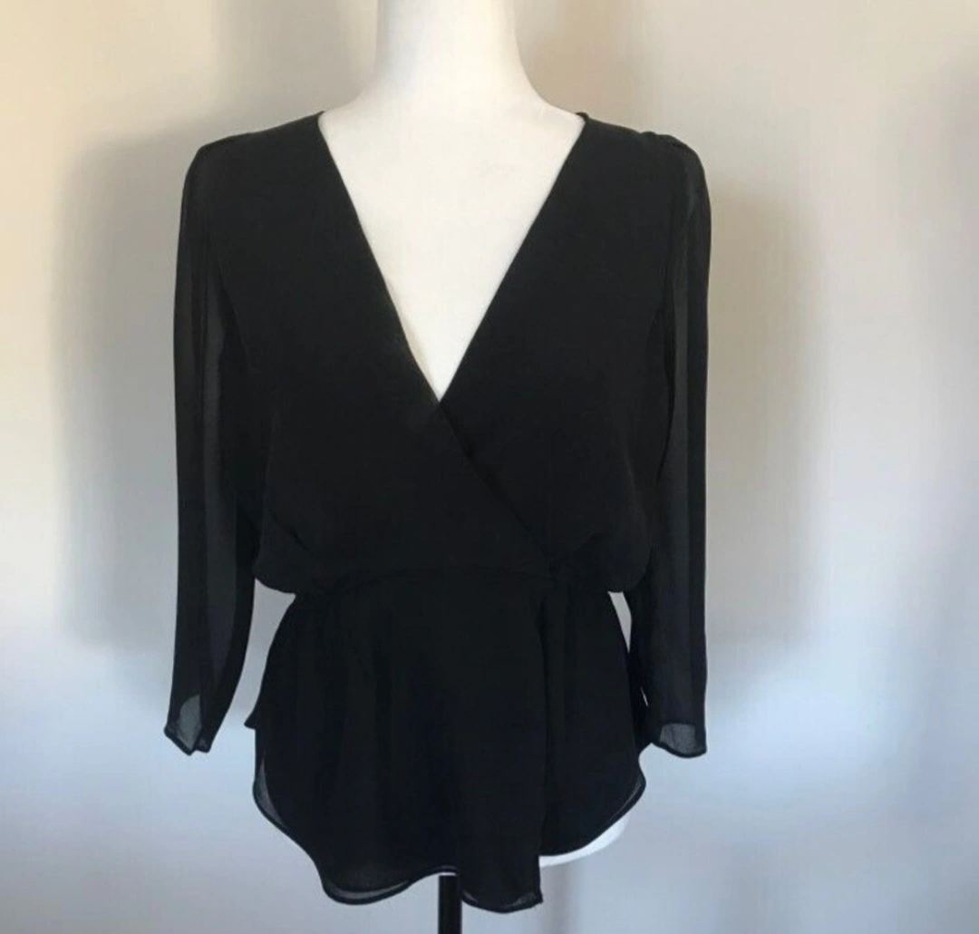 Beautiful black silk wrap blouse. Three-quarter sleeves. Sheer yoke. Elasticated waist. Made in China. New without tags retails $98 some stretch