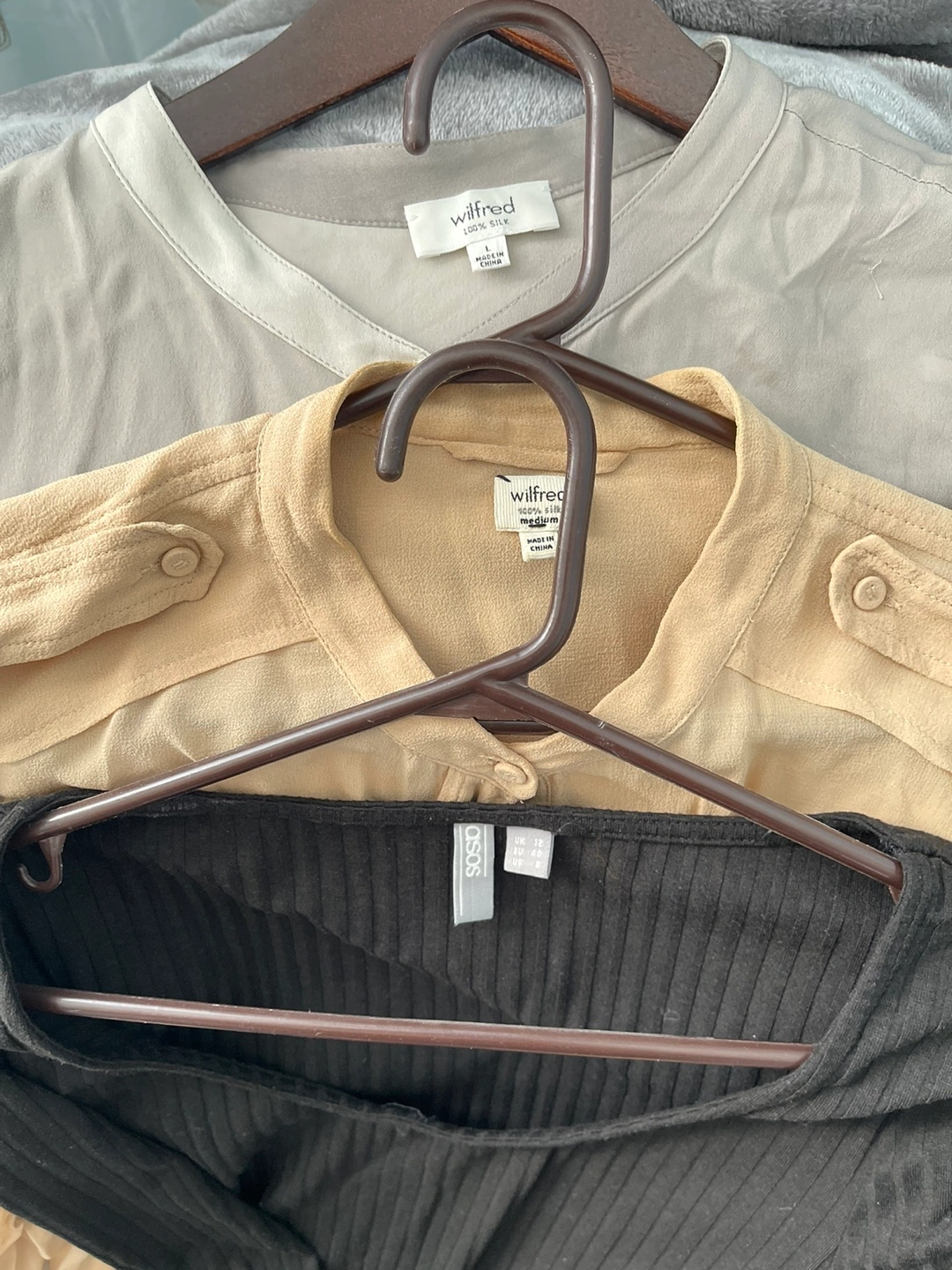 3 for $65. Bundle includes two Wilfred 100% silk dresses, one light grey size large and one beige size medium. Also includes a black ASOS ribbed long dress, UK-12, US-8.