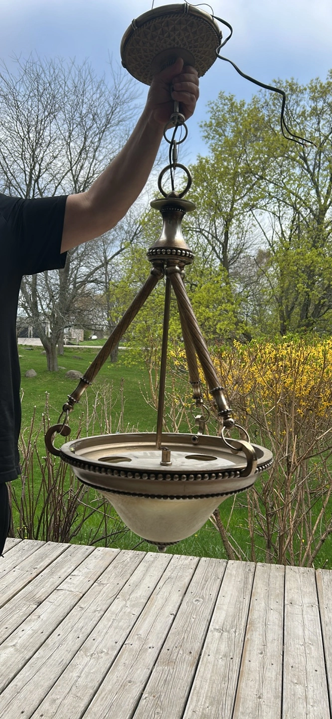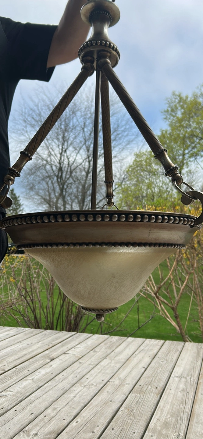 Beautiful chandelier, antique brass finish. Features a frosted glass shade.