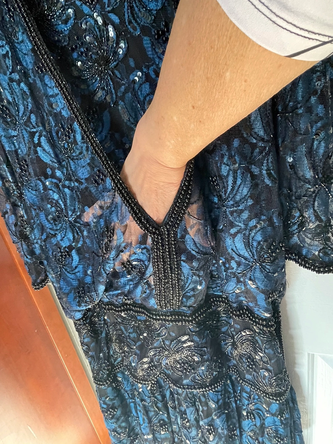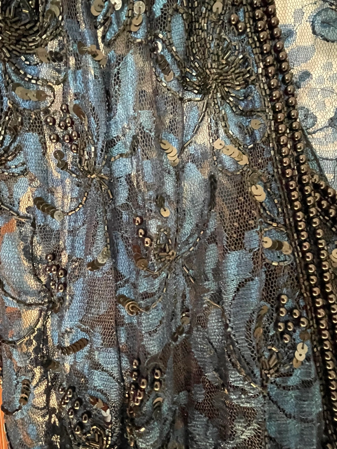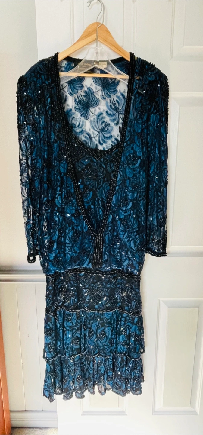 Stunning blue lace dress. Purchased for $400 Features sequins and beads. Layered design. Three quarter sleeves. V-neckline. Hook and eye closure at the back.