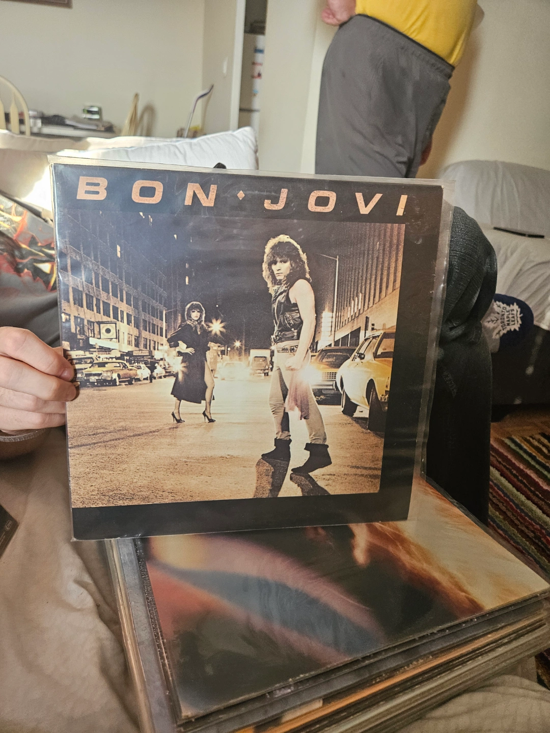 Vintage vinyl record. Album cover shows band members on a city street at night. Sleeve shows some wear.