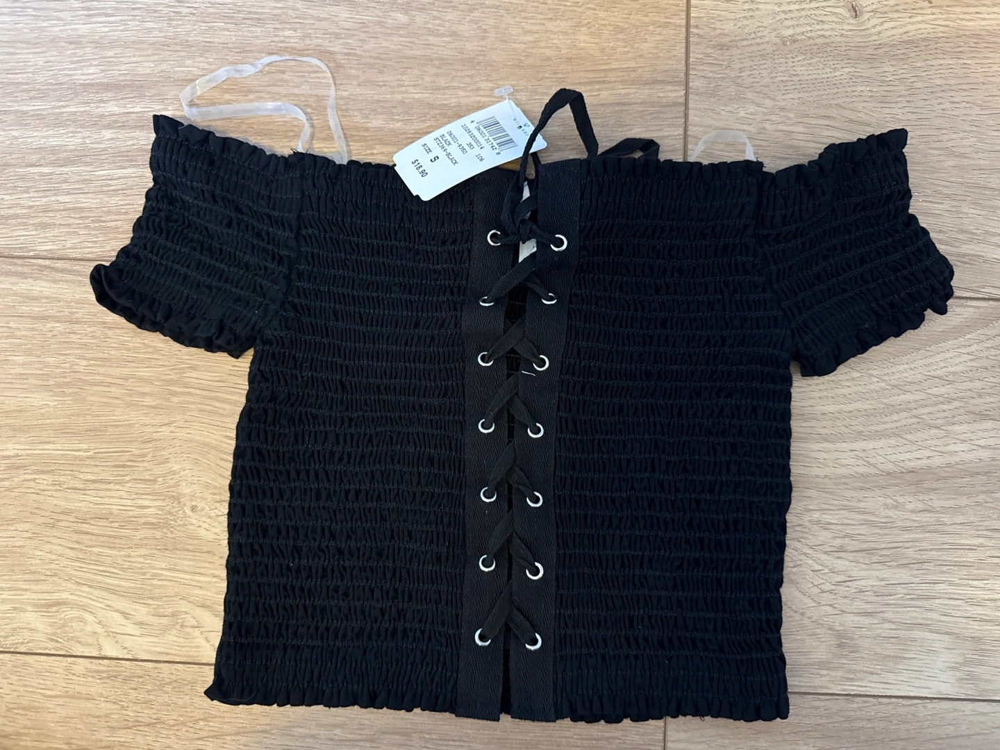 Cute black crop top. Features a smocked bodice and lace-up front detail. Short sleeves and off-the-shoulder neckline. Brand new with tags. Purchased in states original was $18.80 usd before tax