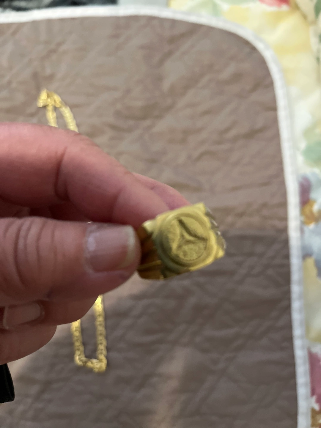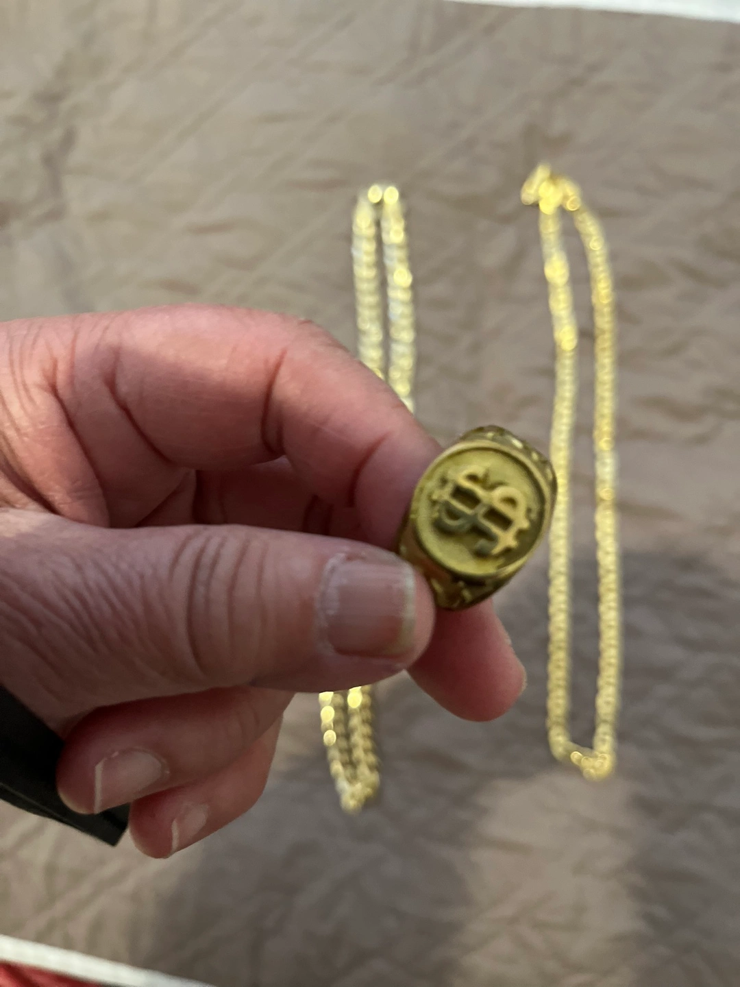 Two chains and two rings. One ring features a crest. Chains appear to be cuban link style. Not real gold. Nickel $20 each or buy 2 for $35