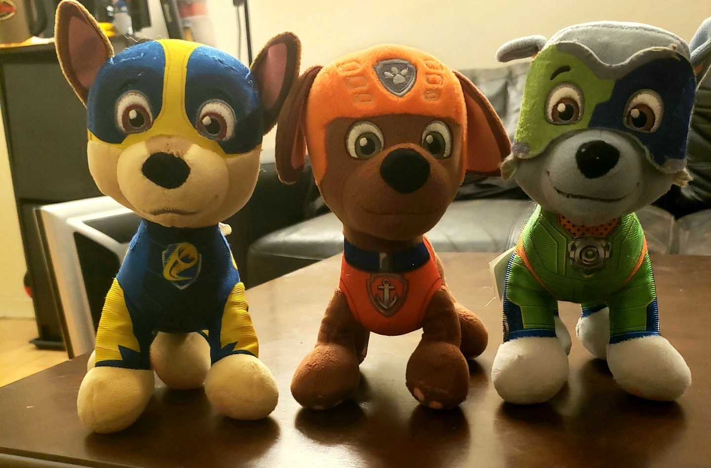Three adorable Paw Patrol Mighty Pups plush toys. Collectible characters in superhero costumes. Perfect for kids or collectors.