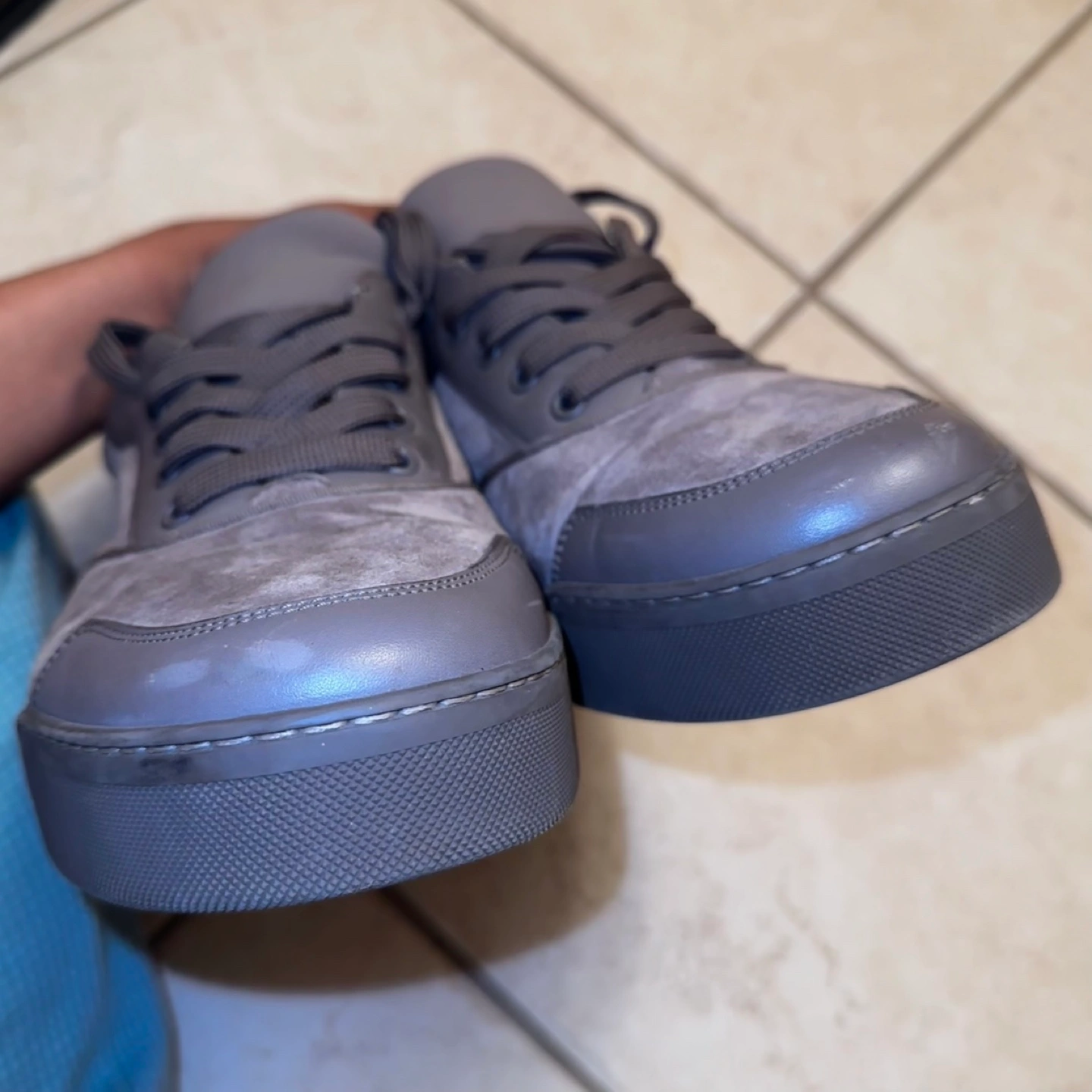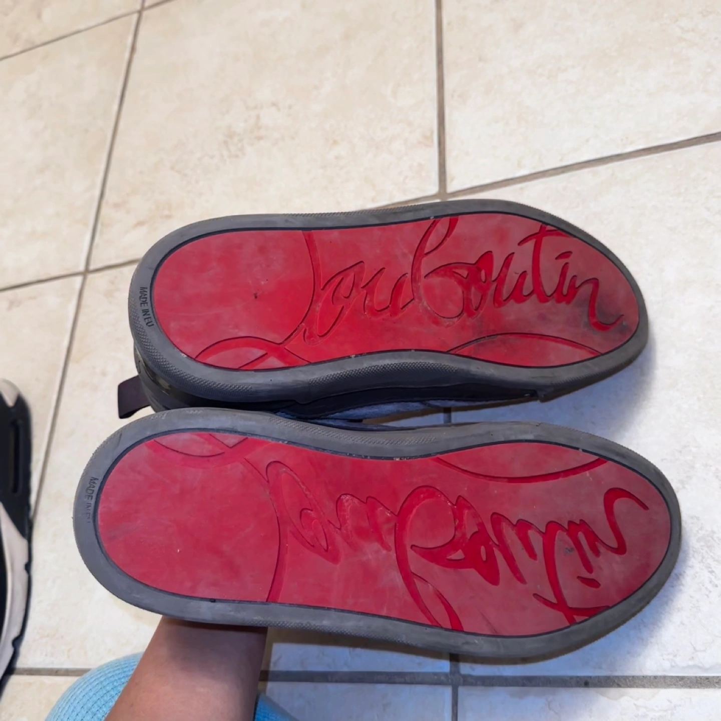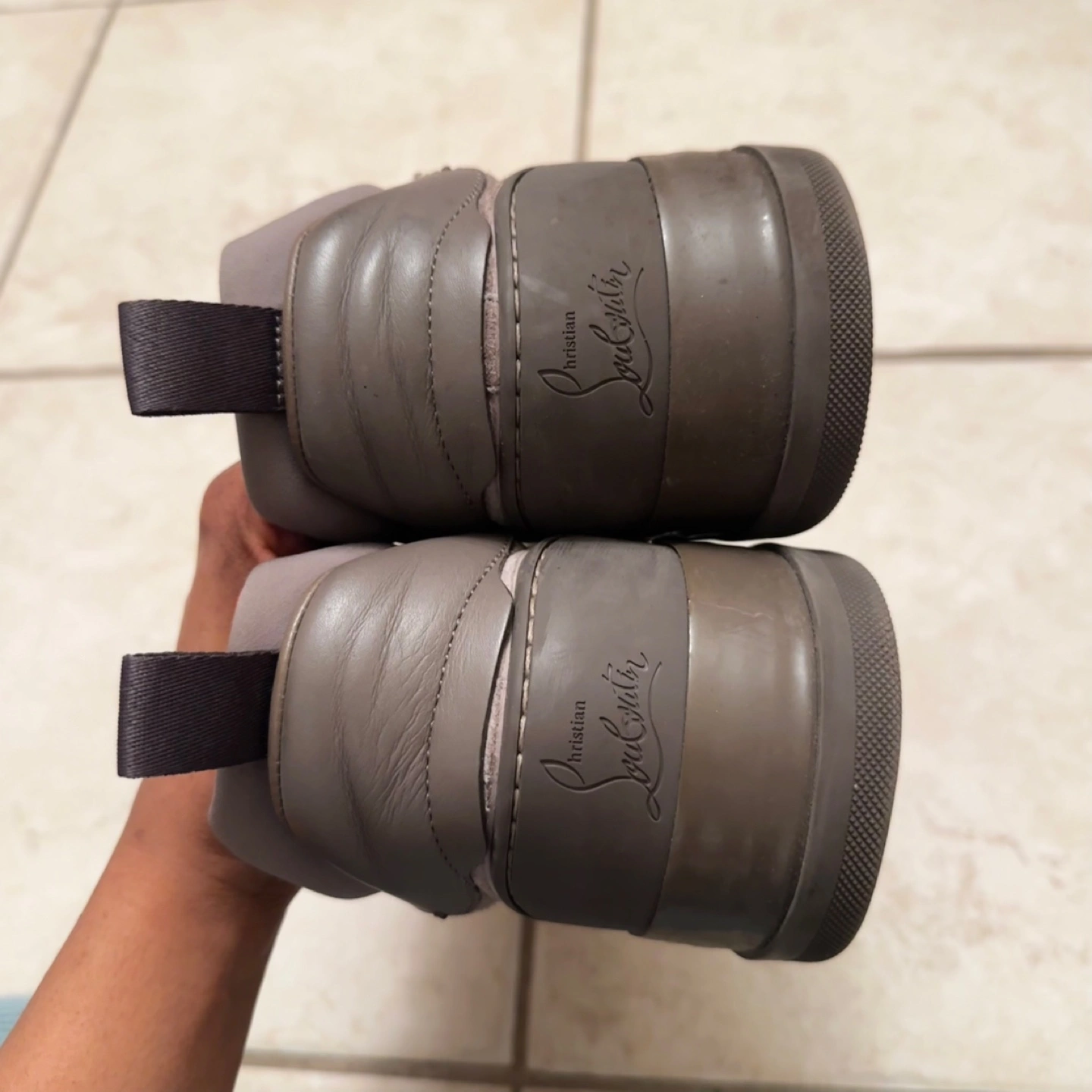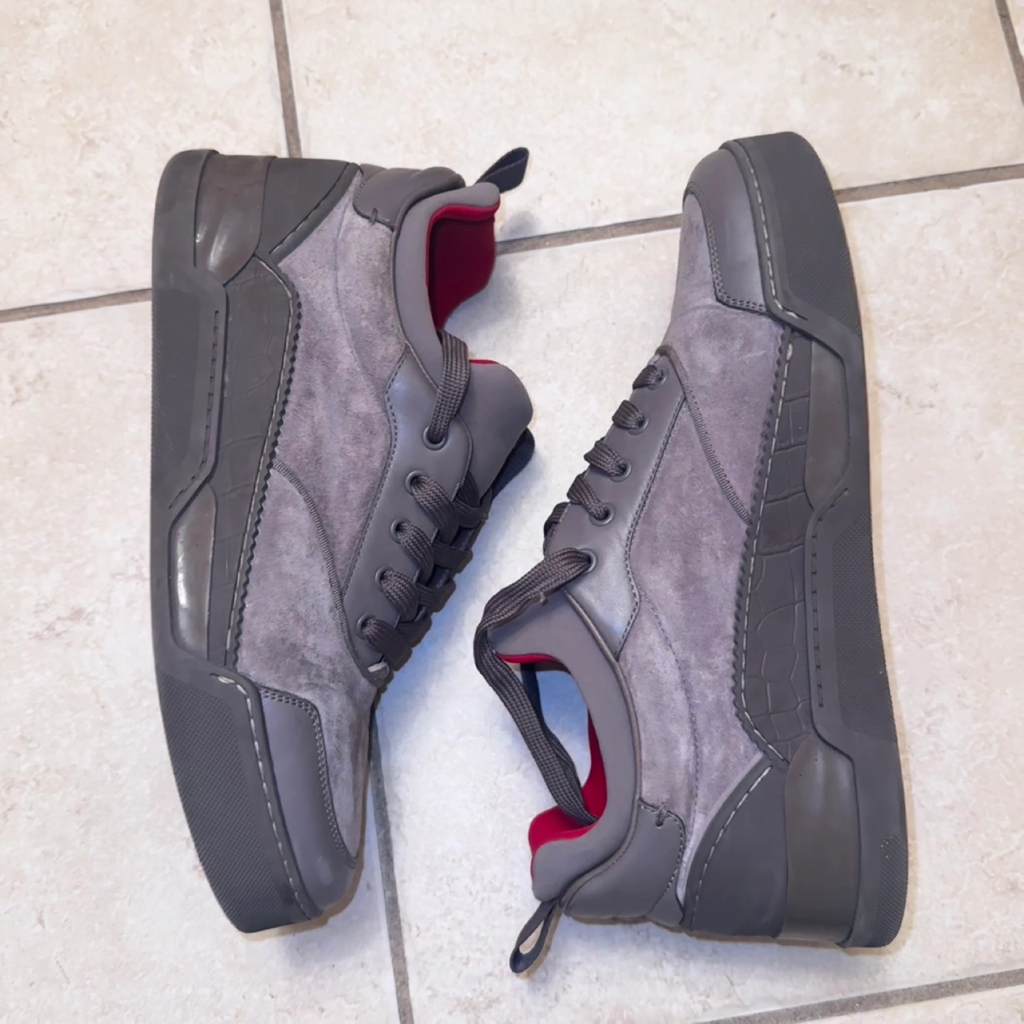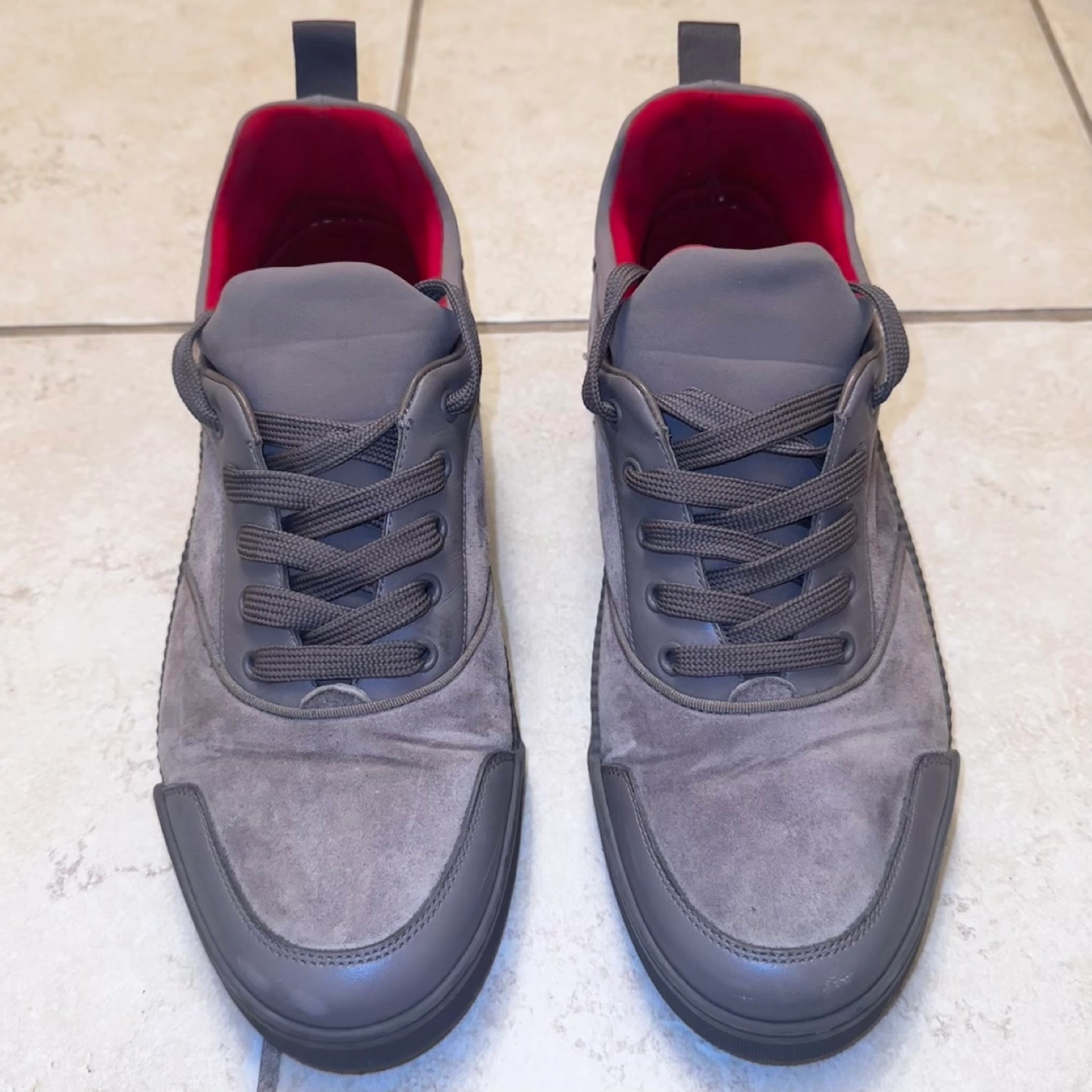 Pair of grey suede low-top sneakers. Red accents inside. Signature Louboutin red soles. Pre-owned. Size men’s 43 EU Made in eu Authentic No insoles! Comes as is, I don’t have time to clean them Moving sale!! ANY OFFERS PLEASE