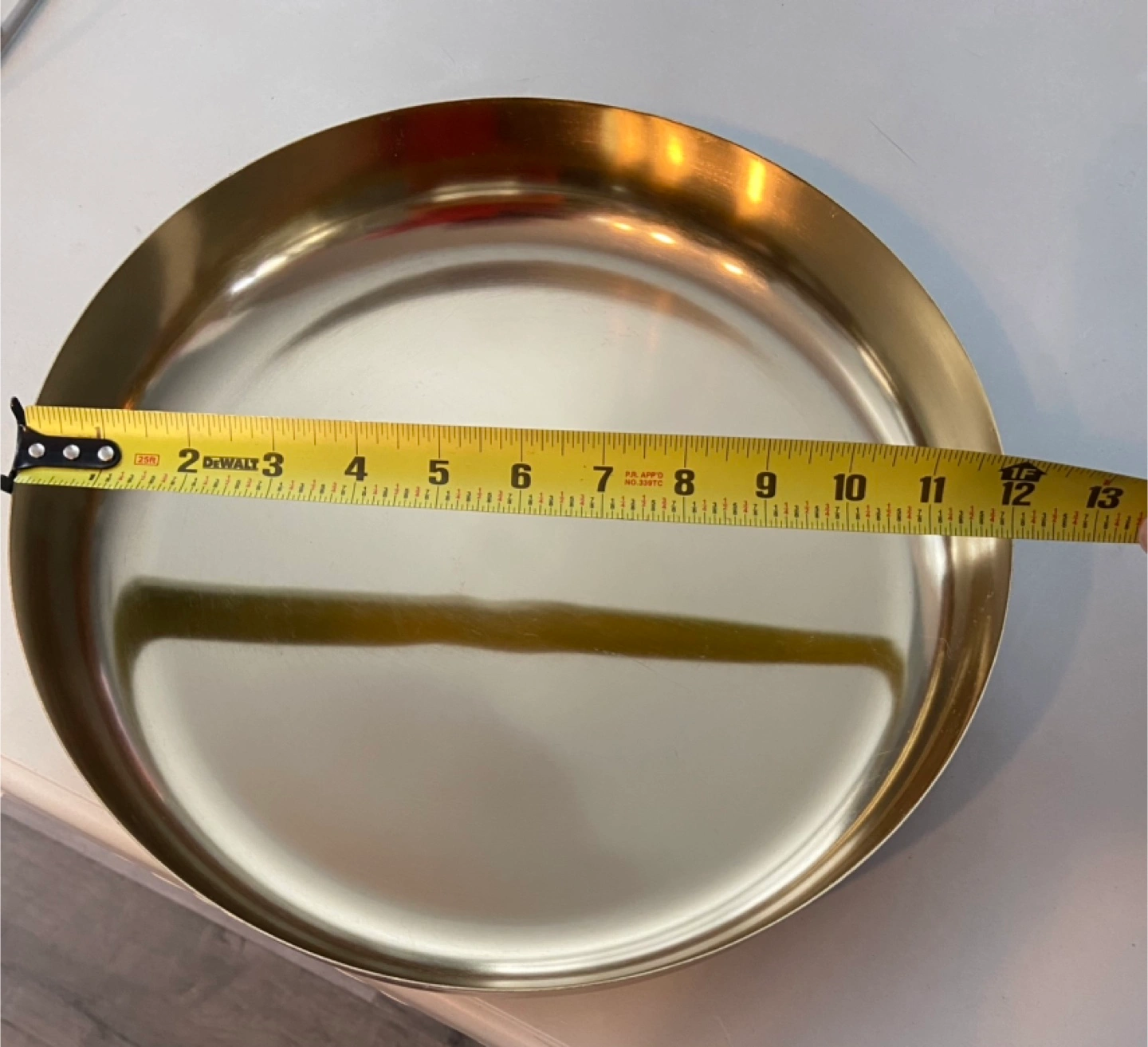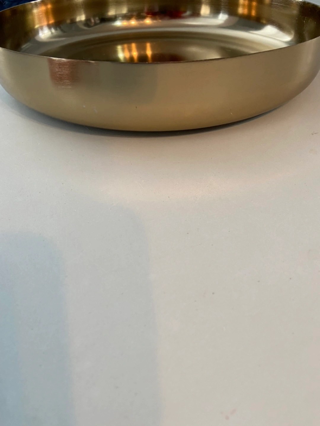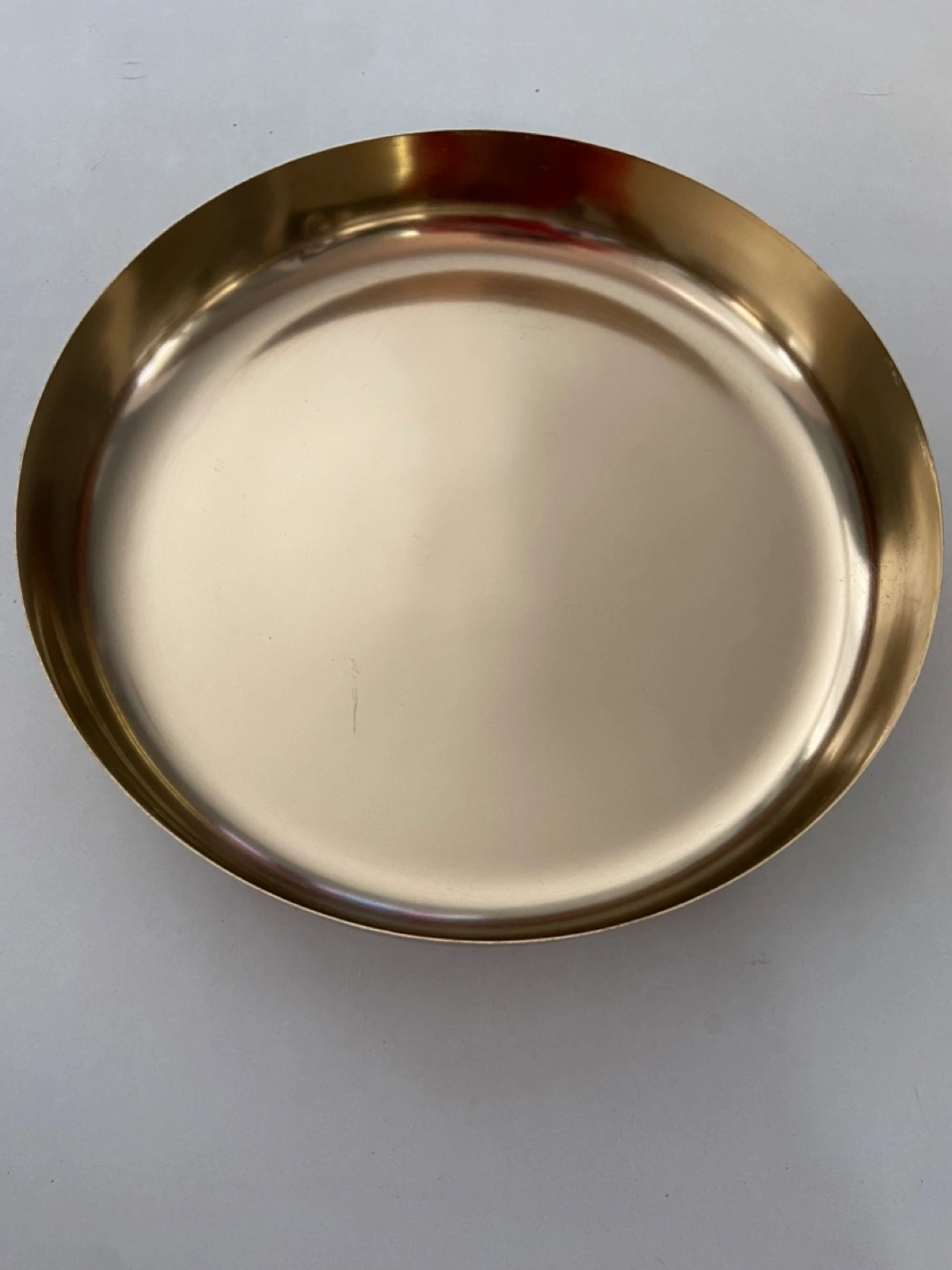 Large, round, gold-coloured metal tray. Perfect for serving or display. Measures approximately 12 inches in diameter.