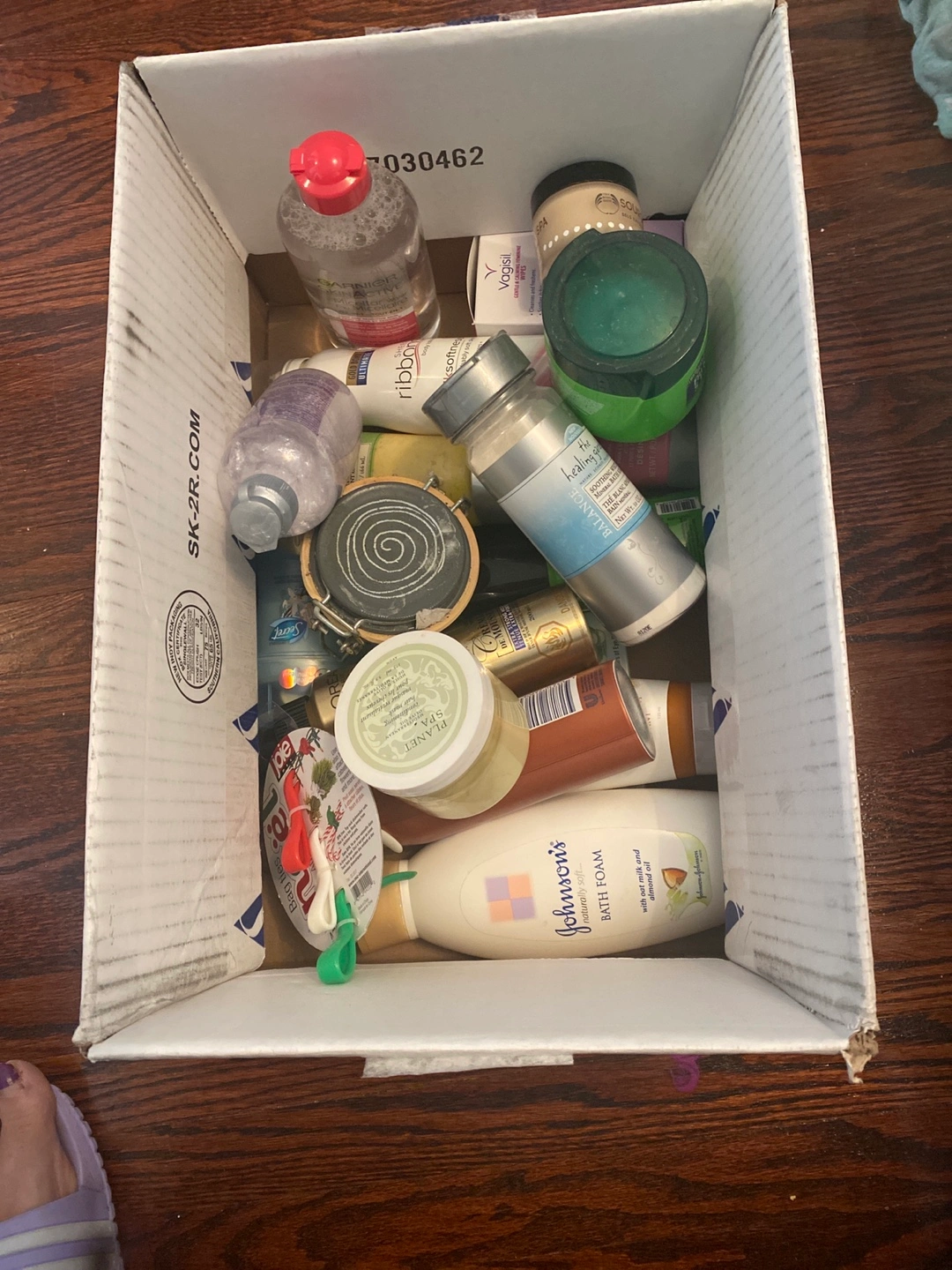 Variety of unopened and used bath and beauty items. Includes lotions, bath foam, face wash, and more. Some containers are slightly damaged.must take all