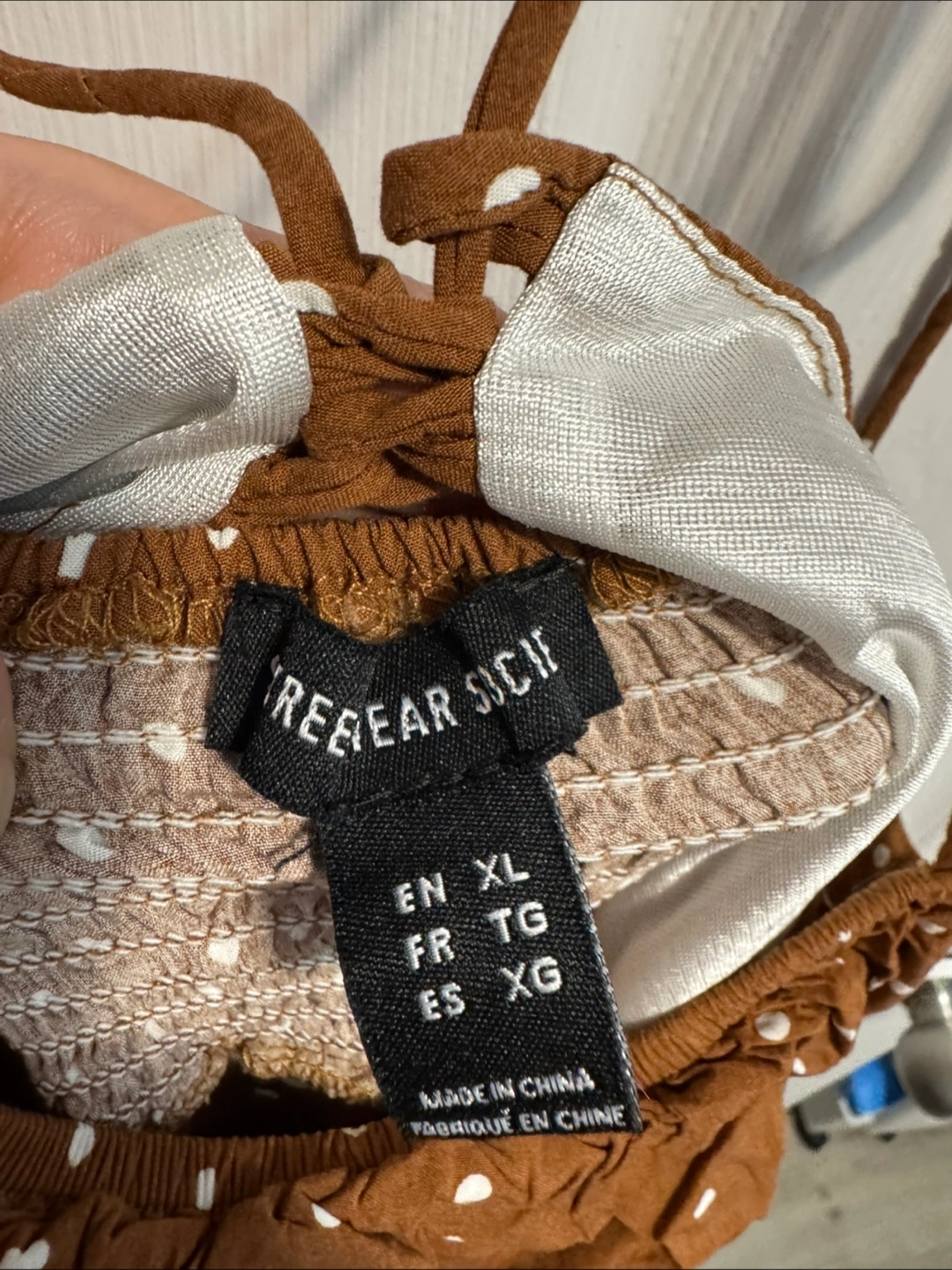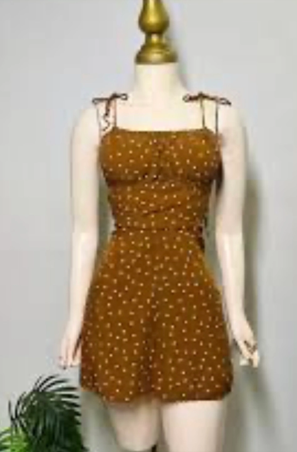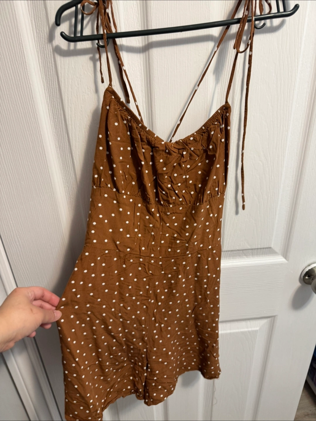 Adorable brown polka dot jumpsuit. Features adjustable straps. Size XL. Made in China.
