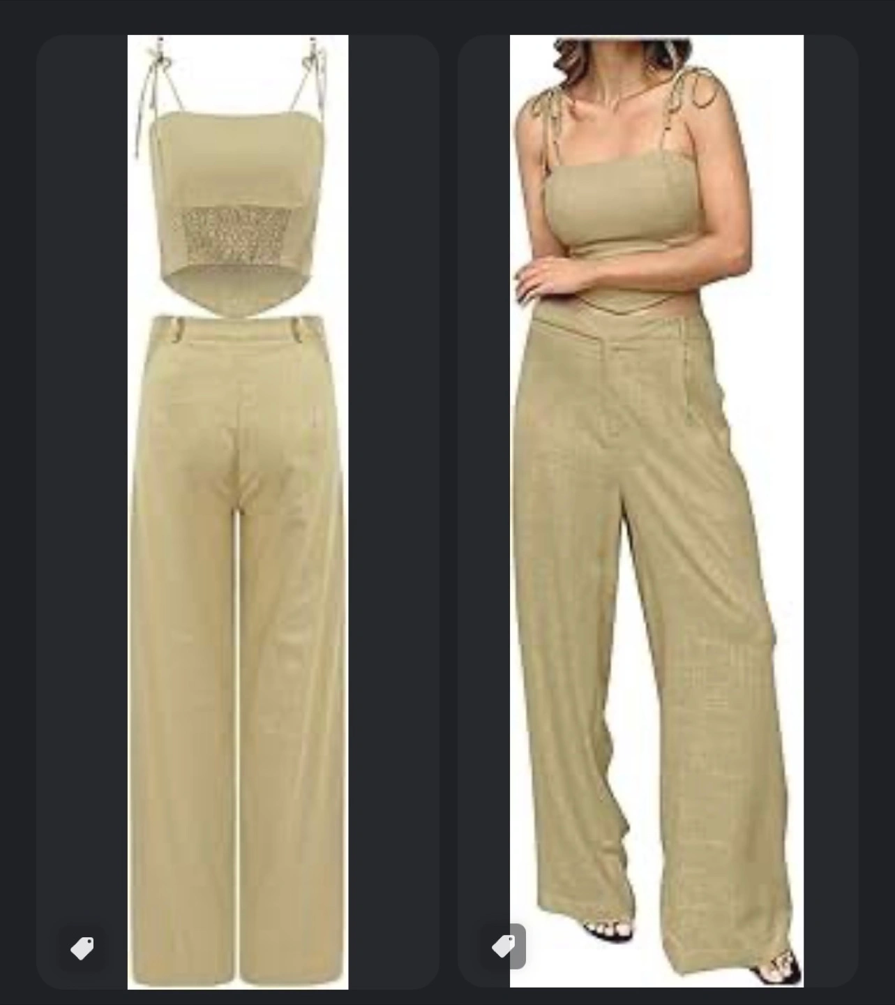 Lightweight linen two-piece set. Includes a cropped tank top and wide-leg pants. High-waisted pants feature side slits. Size large.