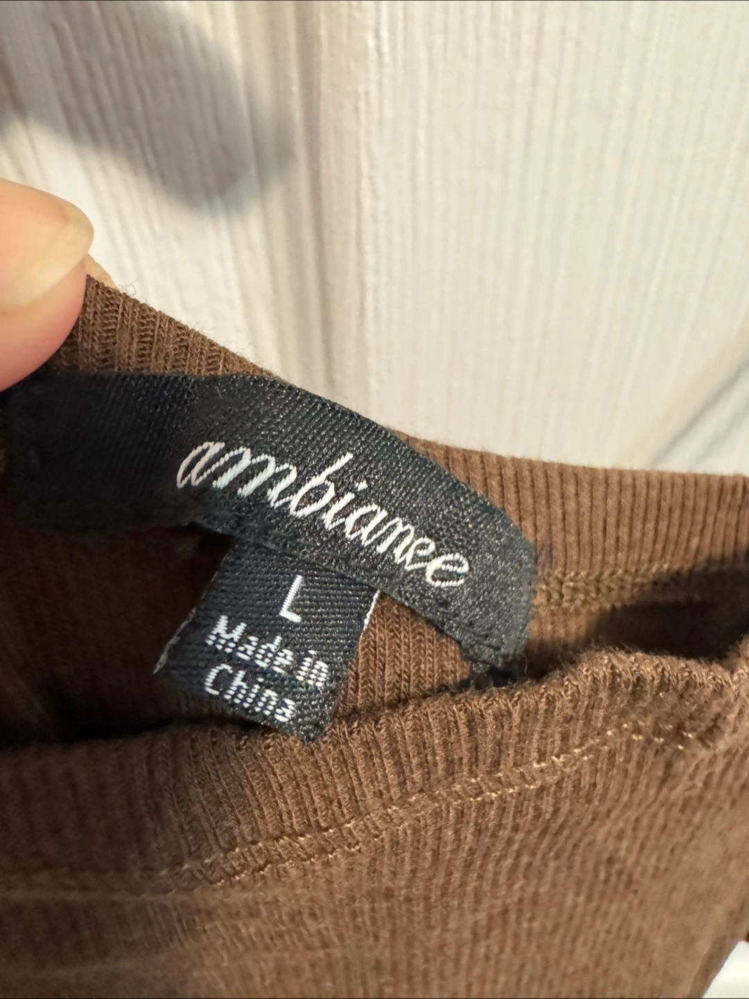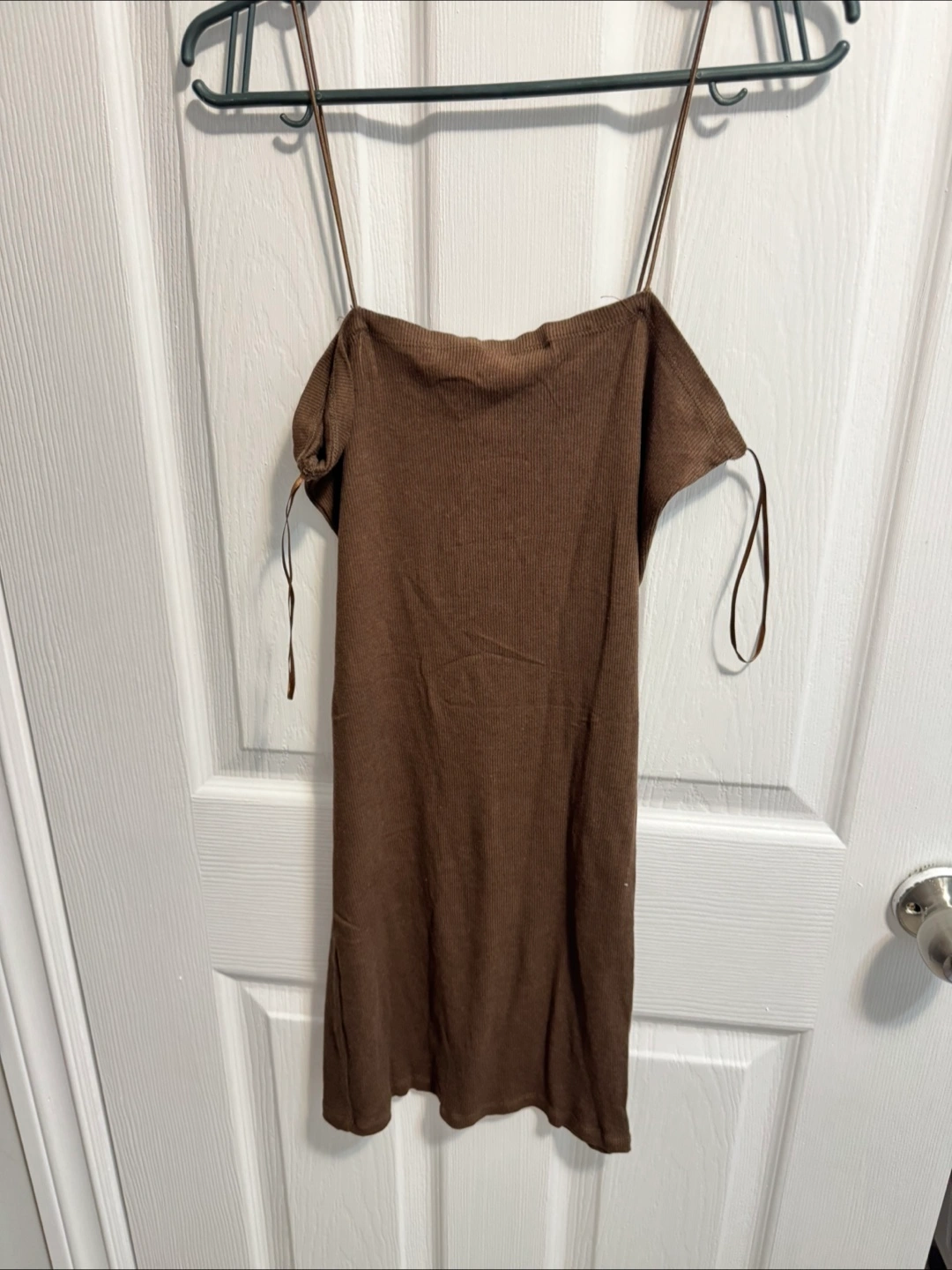 Brown ribbed mini slip dress. Spaghetti straps. Size large. Made in China.
