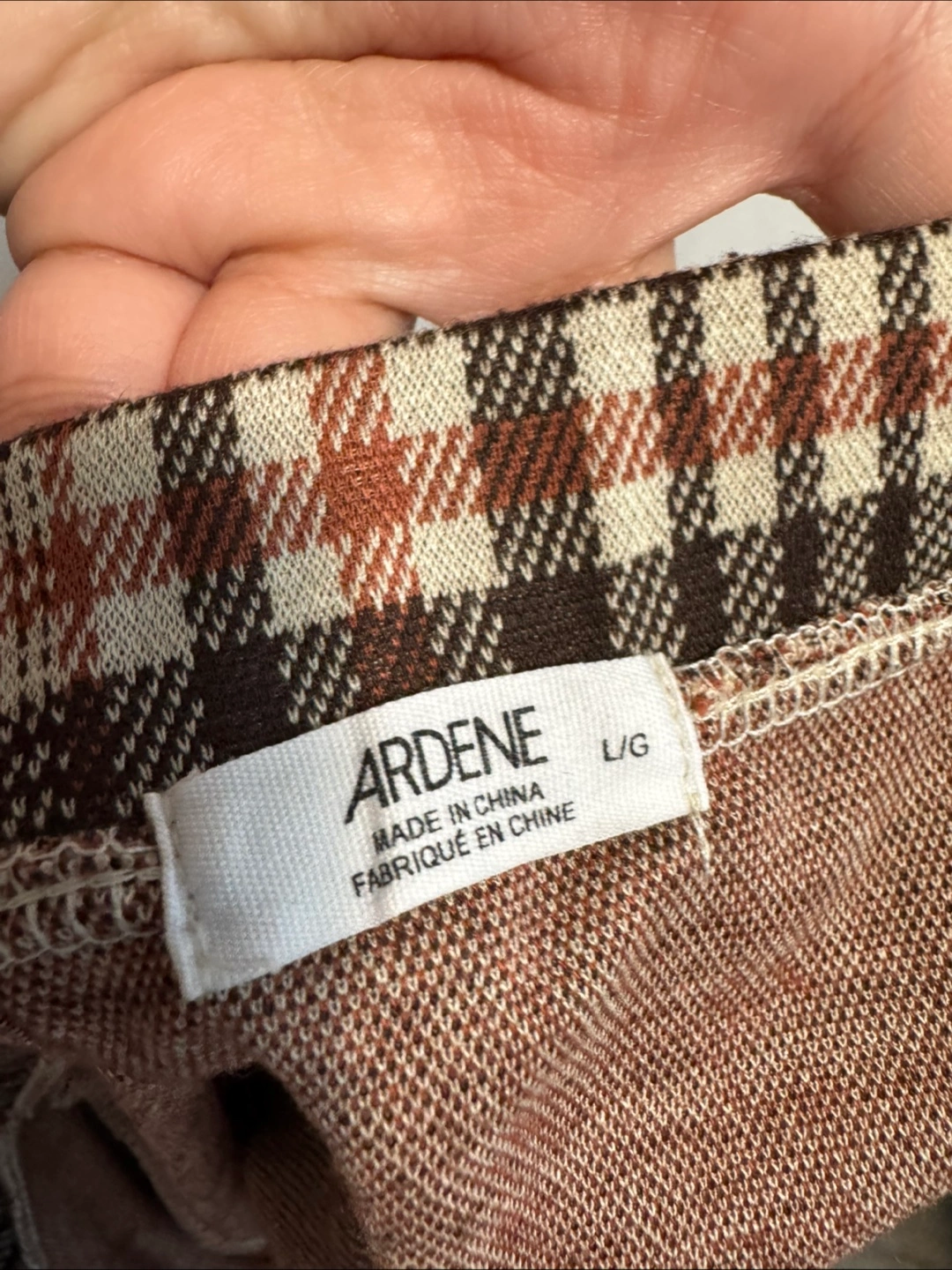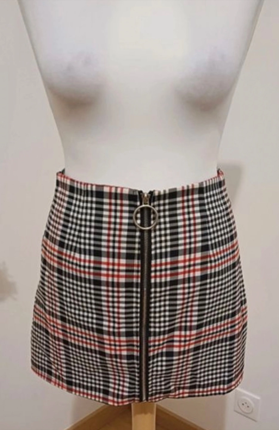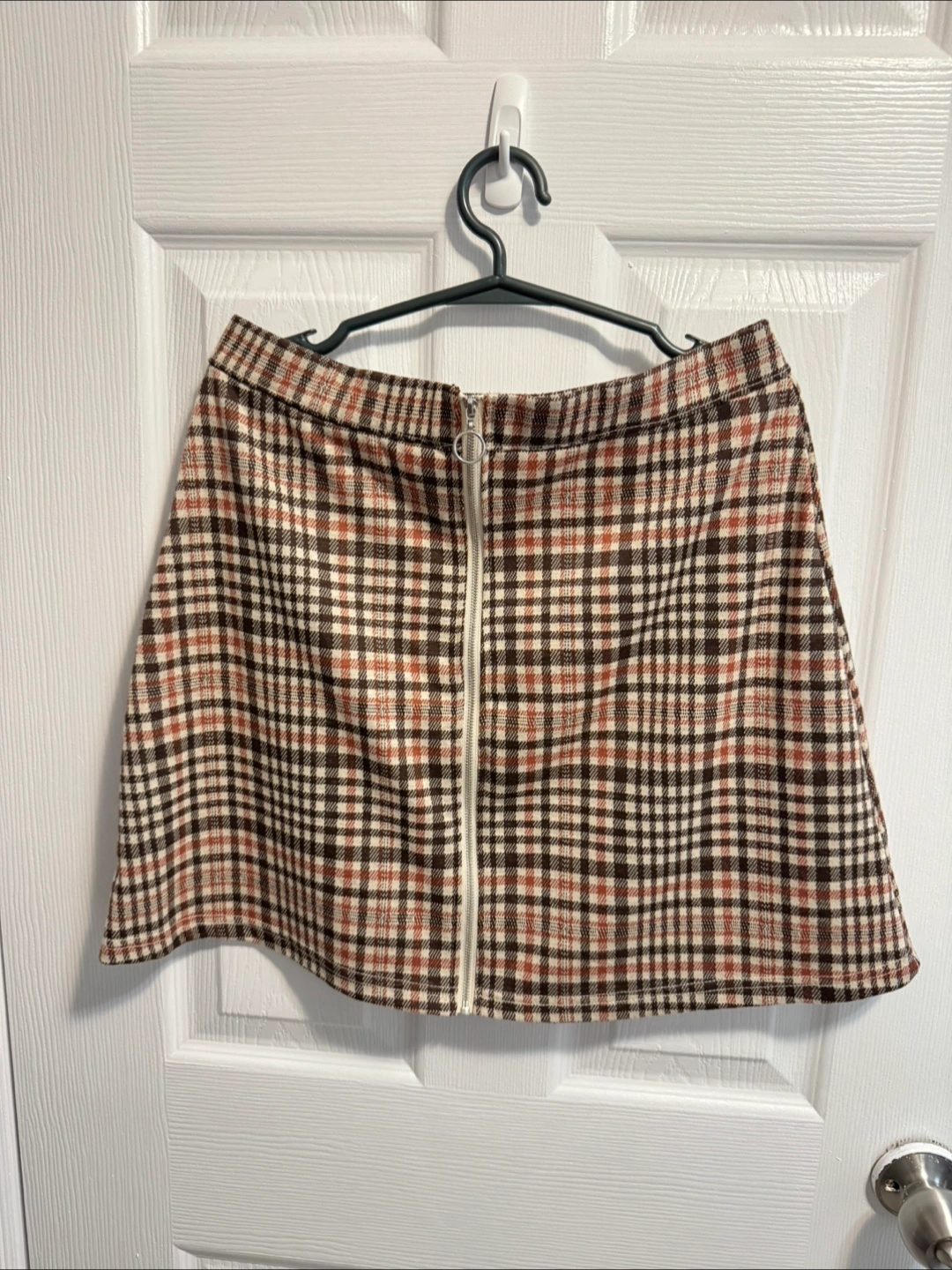 Cute mini skirt. Brown, beige and white plaid pattern. Features a zipper closure. Size L/G.