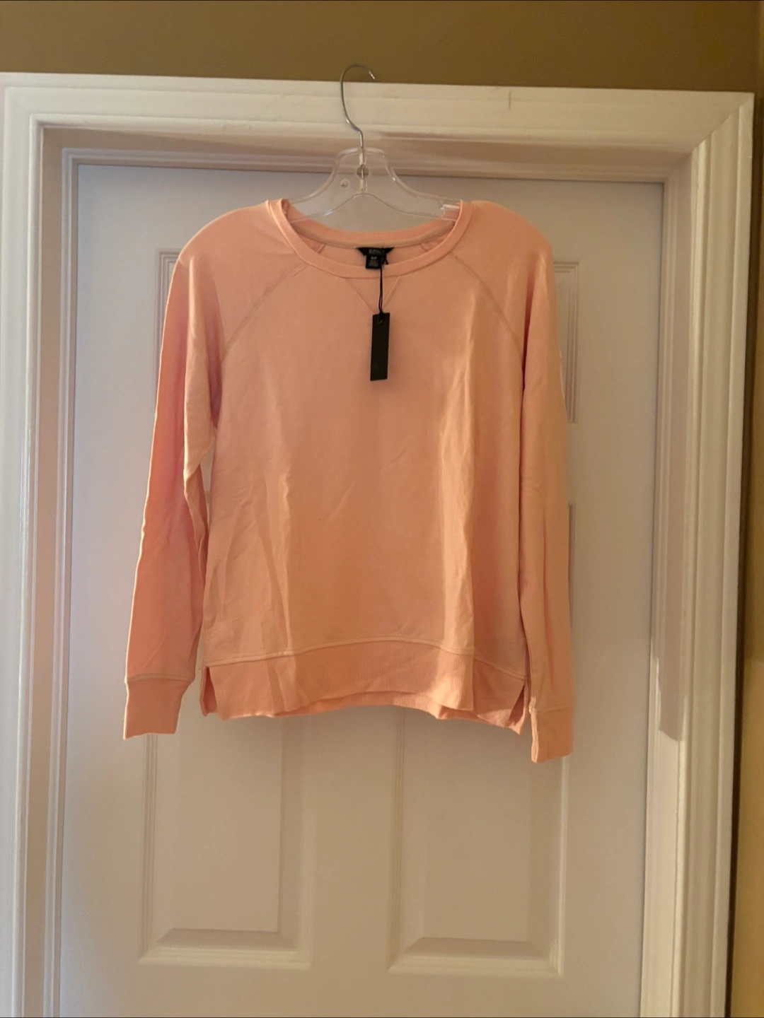 Peach-coloured sweatshirt. Long sleeves. Crew neck. Relaxed fit. Branding on sleeve. New with tags. Soft and comfortable fabric