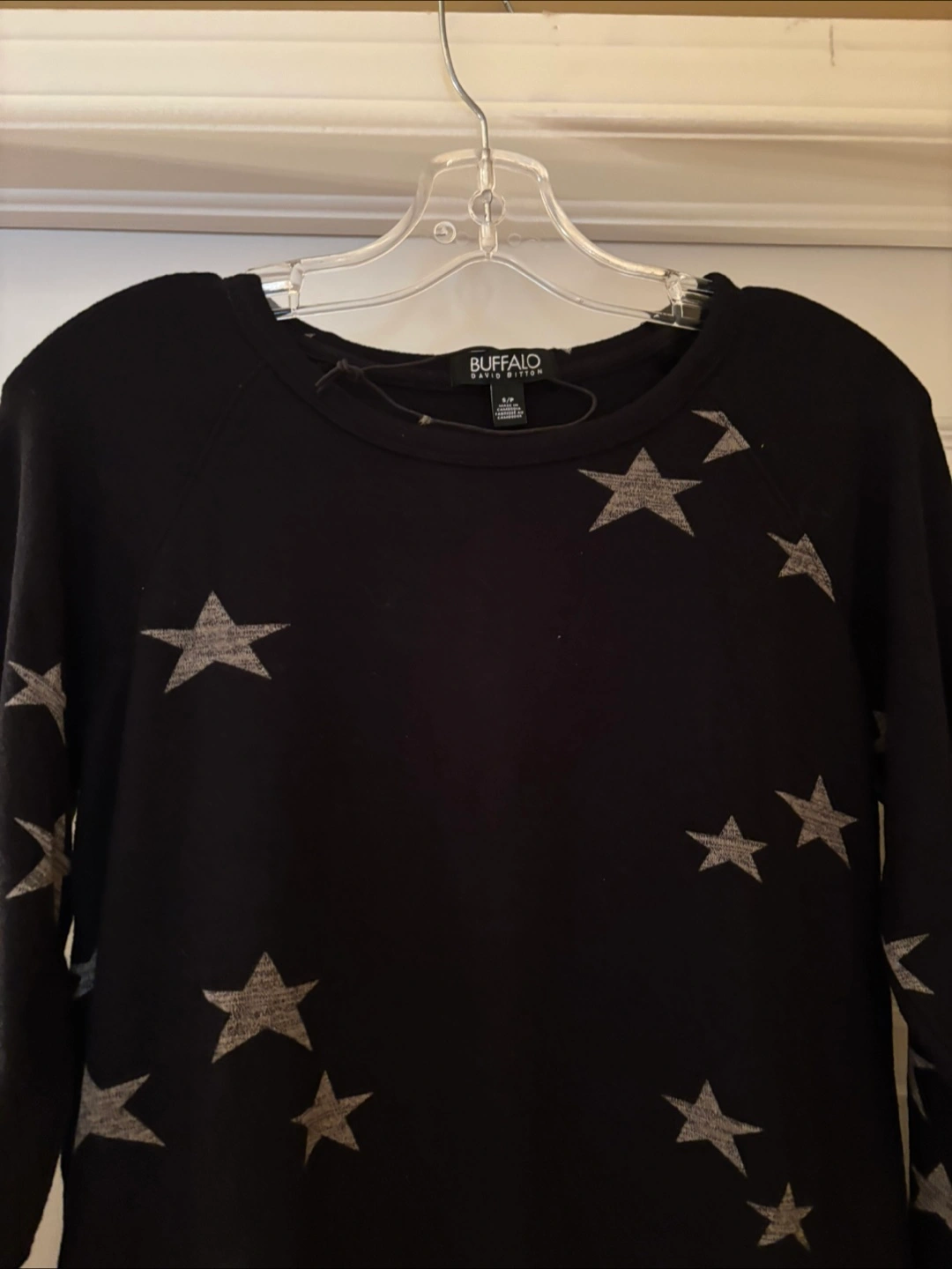 Black long-sleeved sweater. Features grey stars. Relaxed fit. Size small. Soft and comfortable fit and feel New
