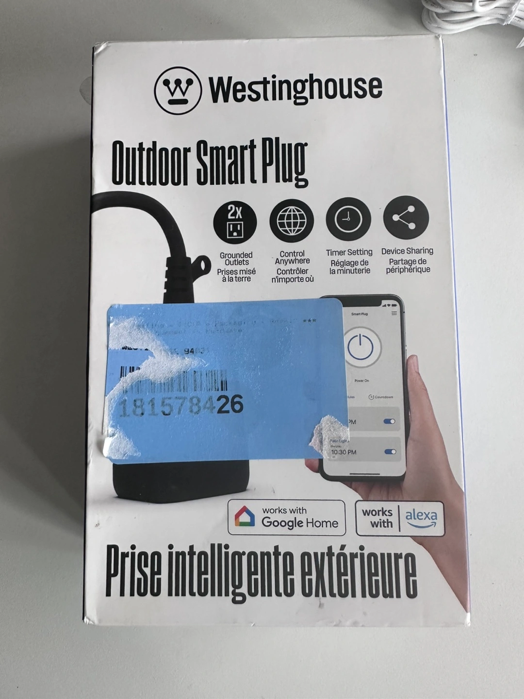 Smart outdoor plug, 2 grounded outlets. Control timer setting and device sharing. Easy setup. Works with Google Home and Alexa.