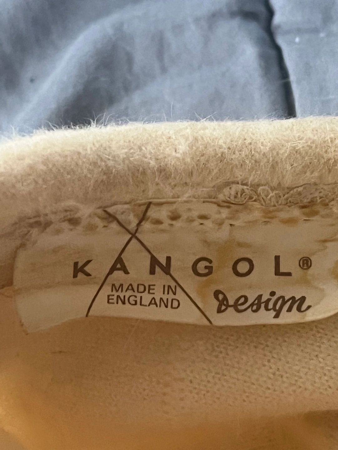 Cream-coloured women's hat. Soft, fluffy material. Features a ribbon detail and button accent. Made in England.