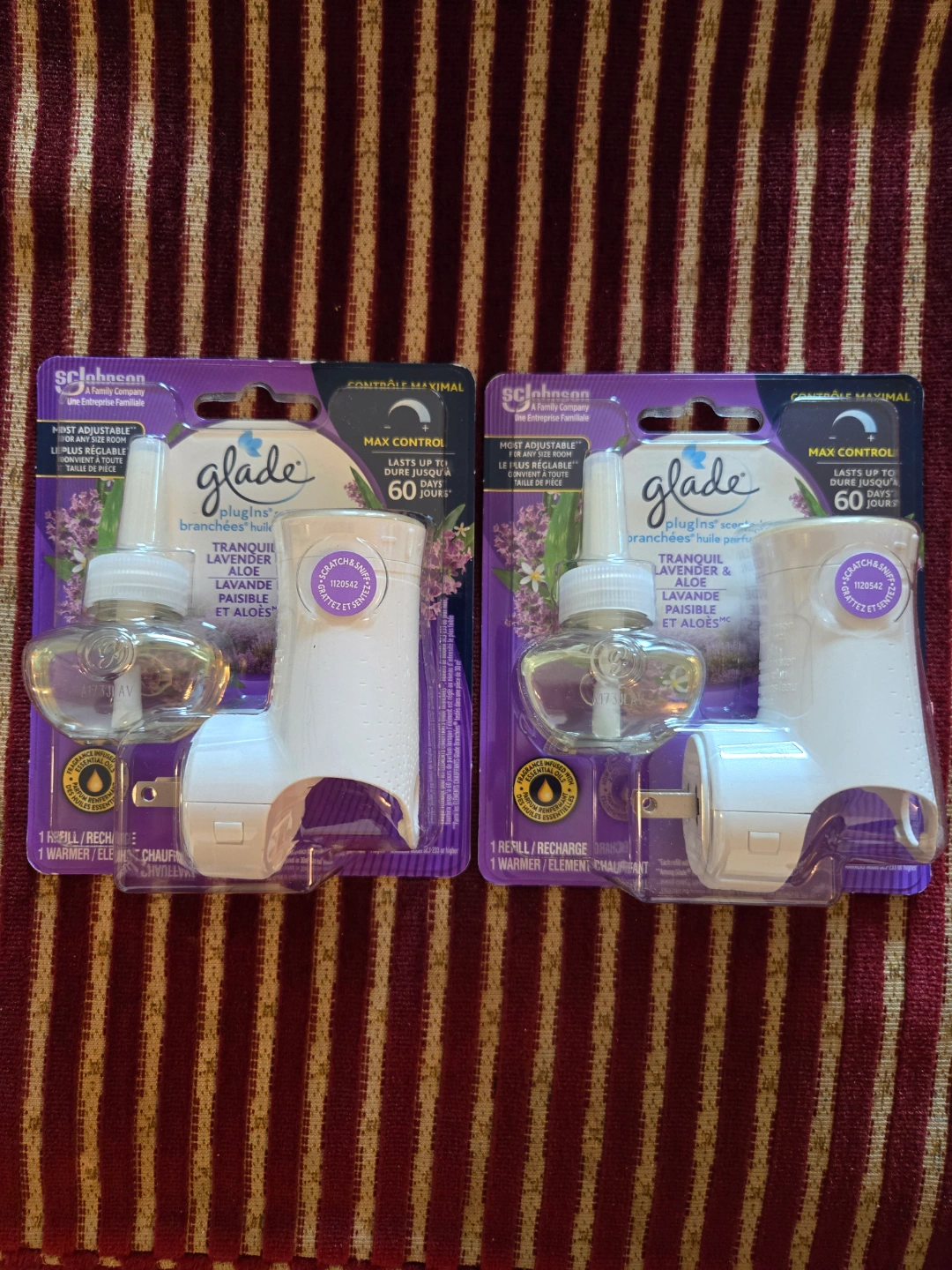 Two Glade Plugins scented oil warmers. Tranquil Lavender & Aloe scent. Includes one refill and warmer per pack. Max control.