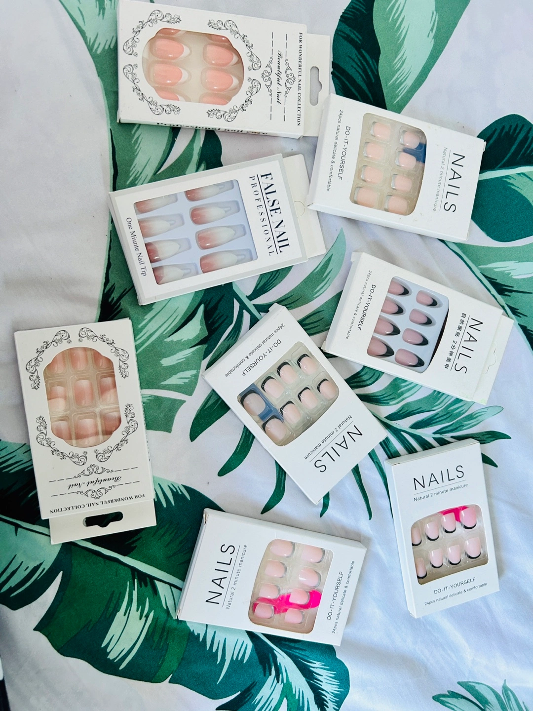 Multiple sets of false nails. Various colours and styles. Perfect for nail enthusiasts. Includes glue-on nails.