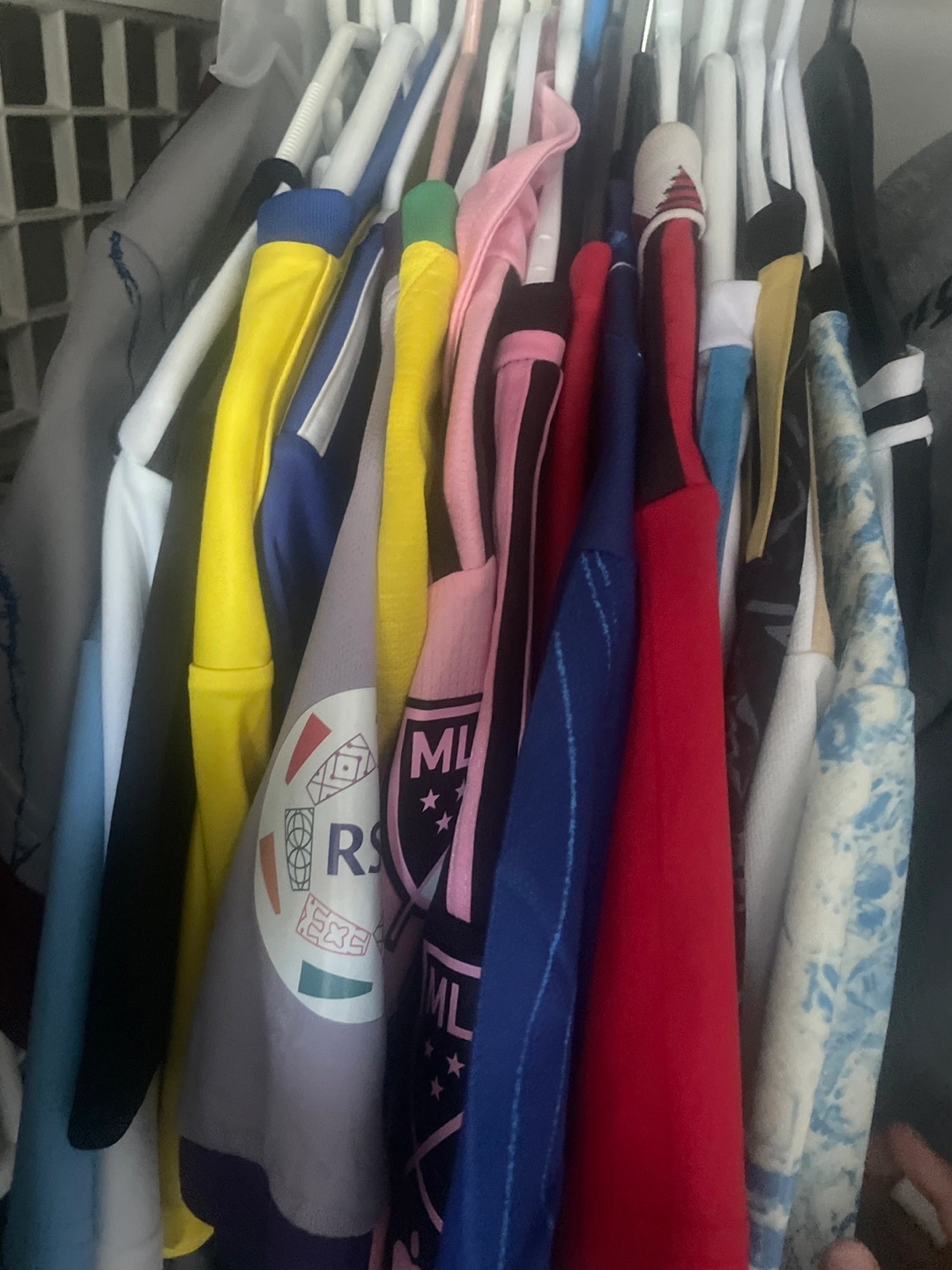 Large bundle of various jerseys. Different colours and styles. Some appear to be soccer jerseys, Good for a bulk purchase or for someone looking for variety.