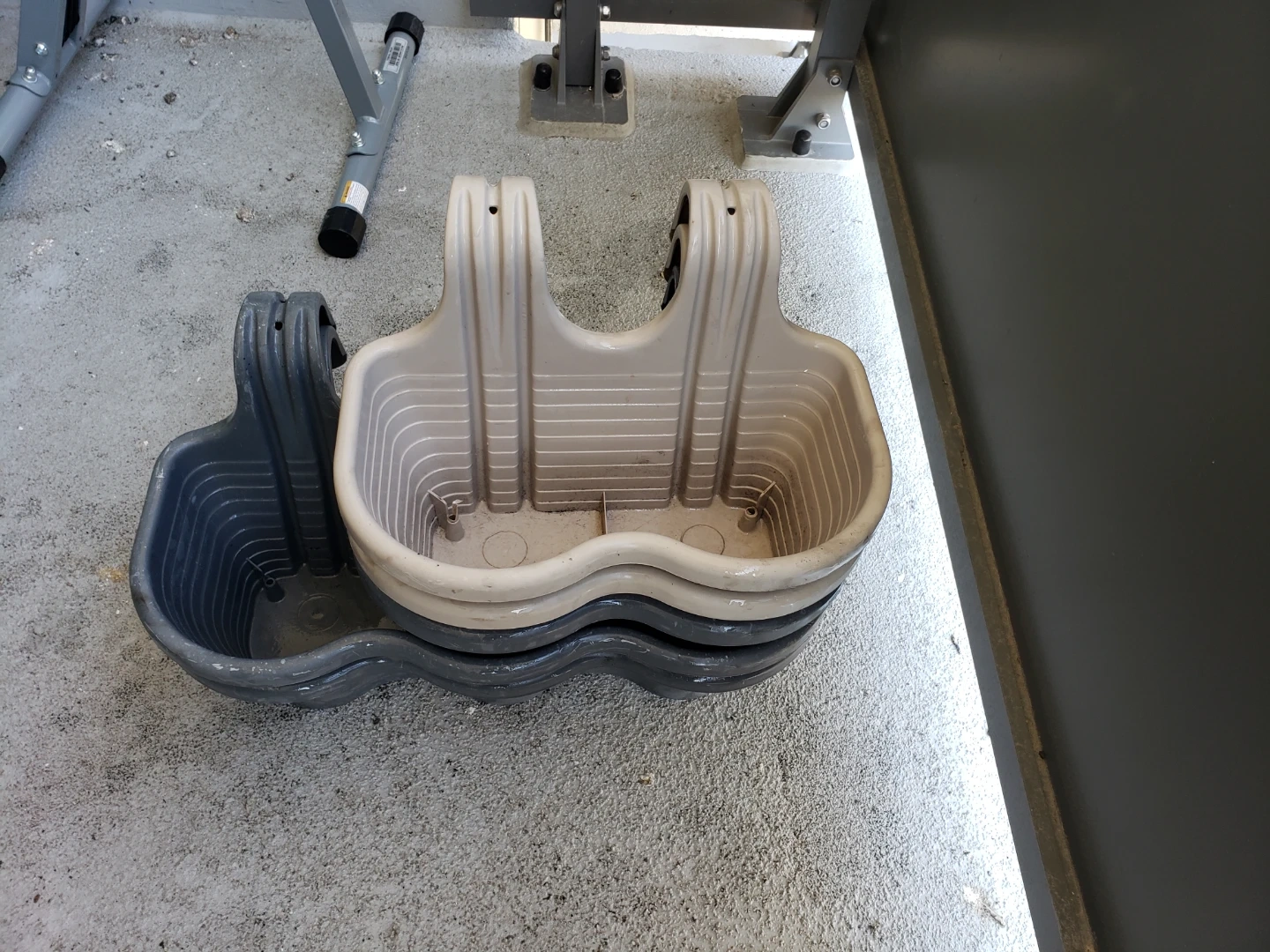 five plastic hanging planters..Great for herbs or flowers. Durable plastic construction. Ready for your balcony garden.used only one Season