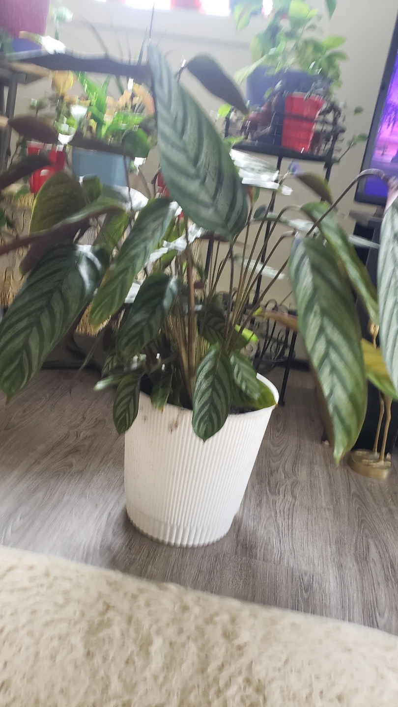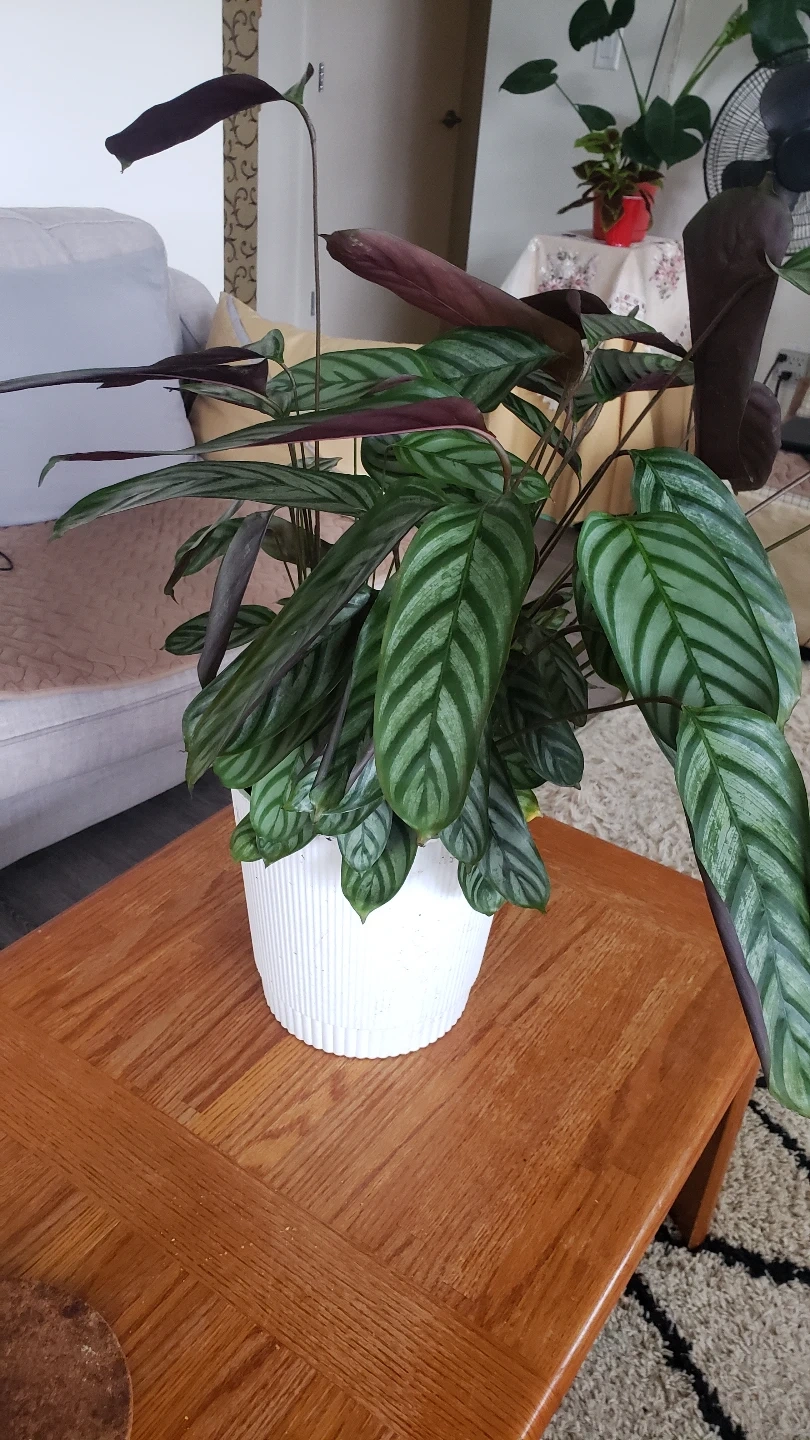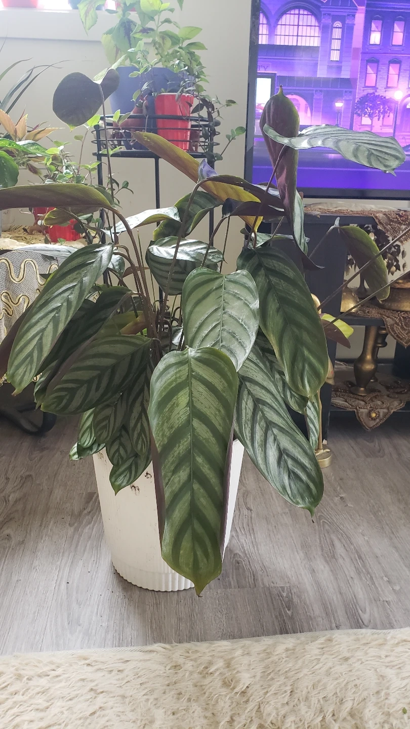 Large, healthy Calathea Ornata in a white pot. Beautiful green and burgundy leaves. Great addition to any home.