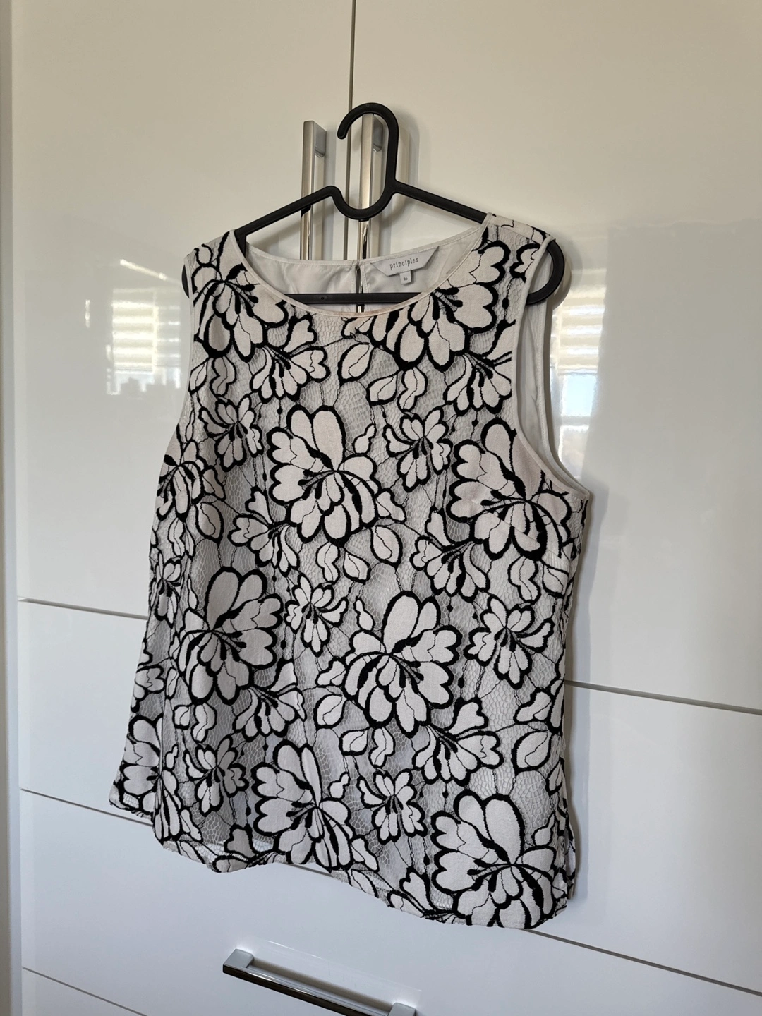 Women's sleeveless blouse. Floral pattern, black and white. Looks great with pants or a skirt.