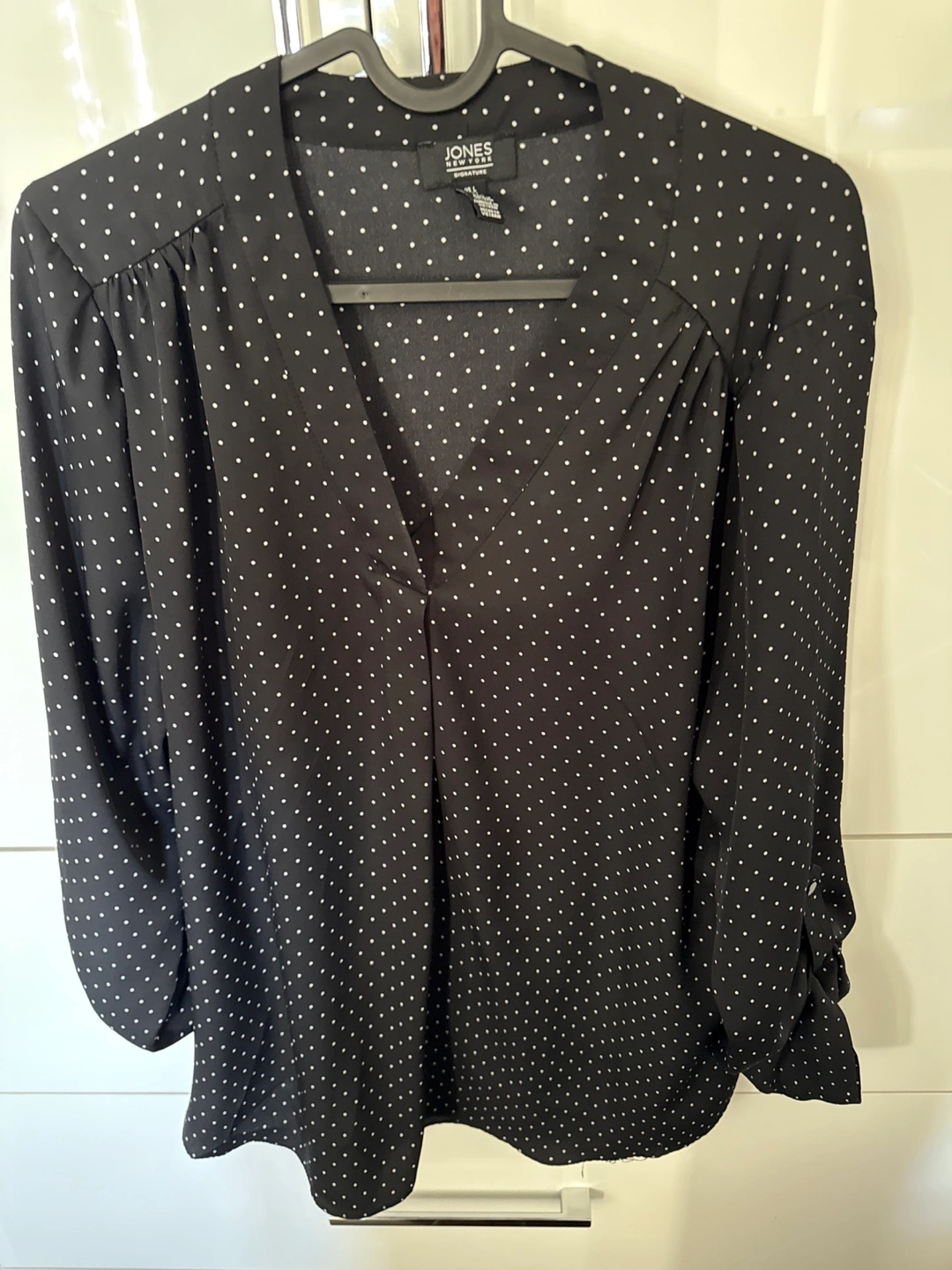 Black and white polka dot blouse. Three-quarter sleeves. V-neck. Relaxed fit. Excellent for work or casual wear.