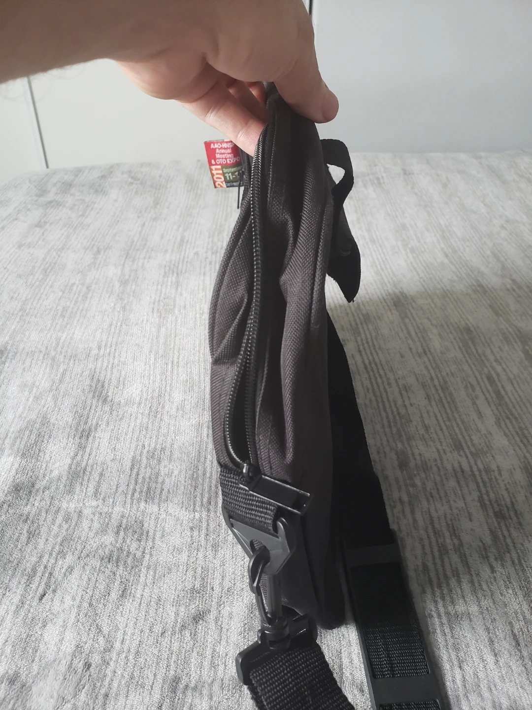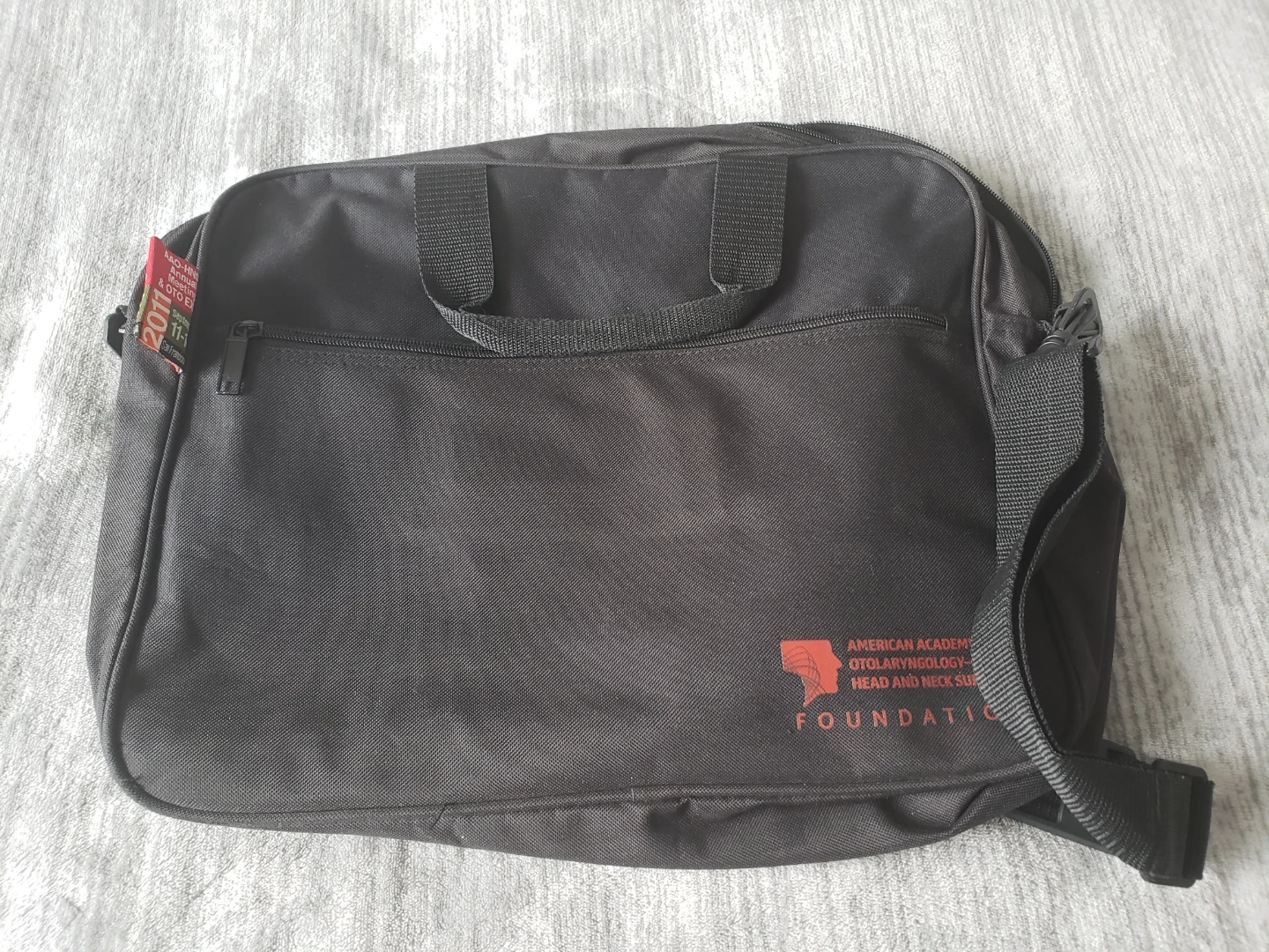 Black fabric messenger bag. Features a zippered main compartment, smaller zippered pocket, top handles and adjustable shoulder strap.