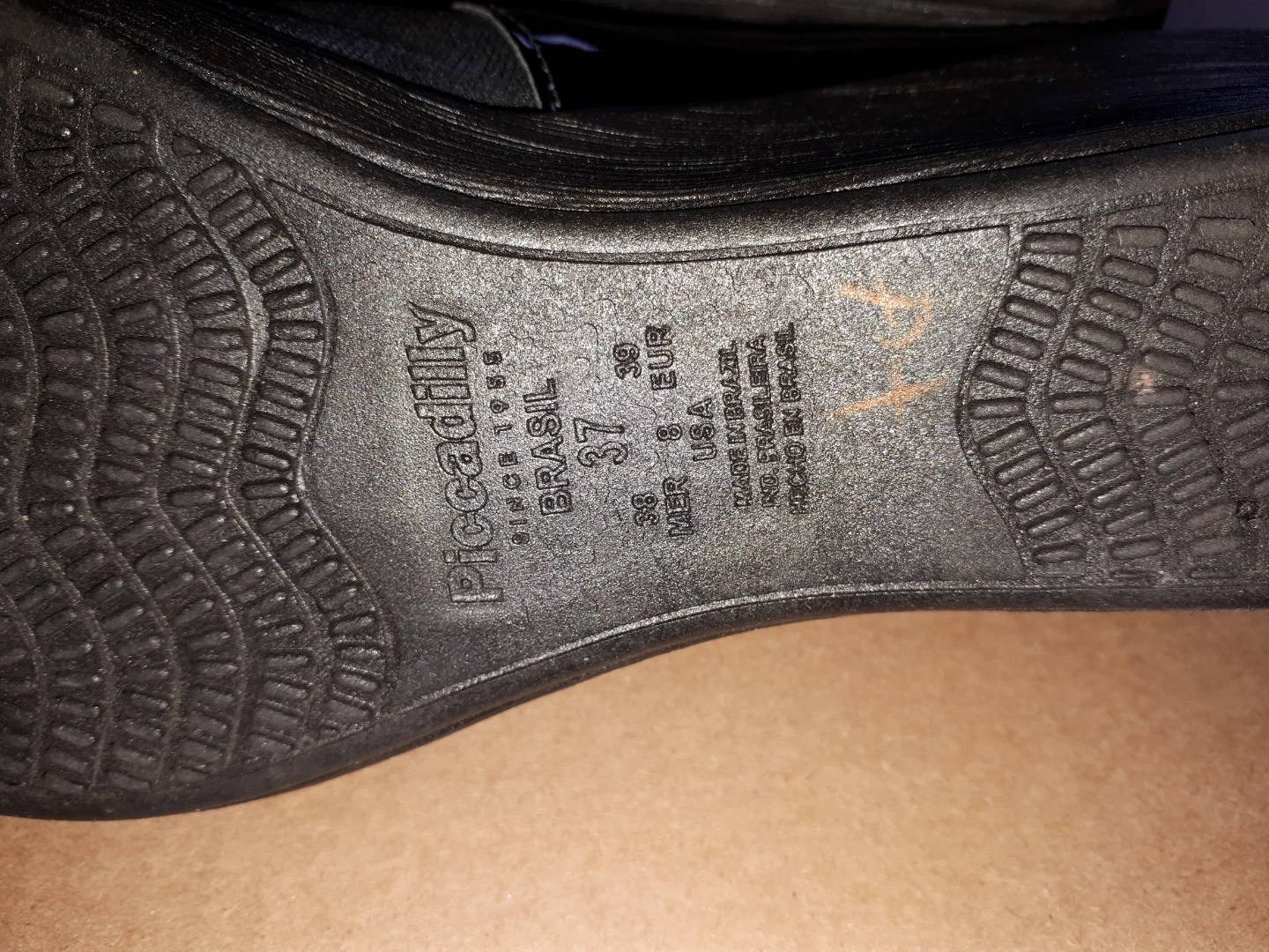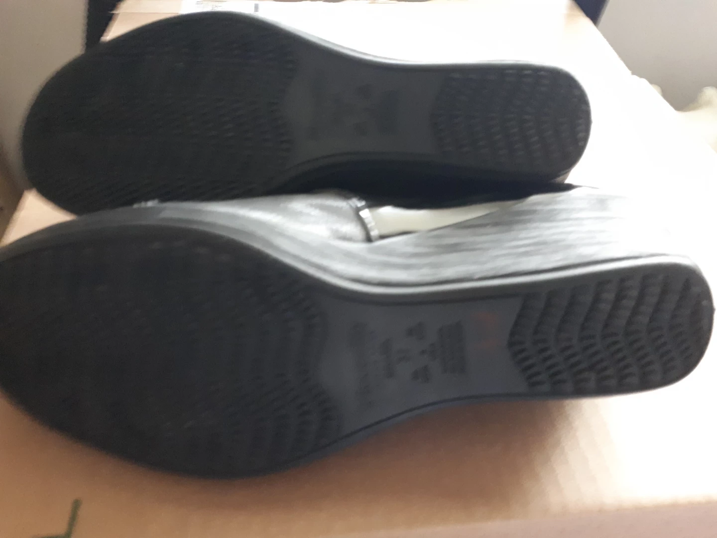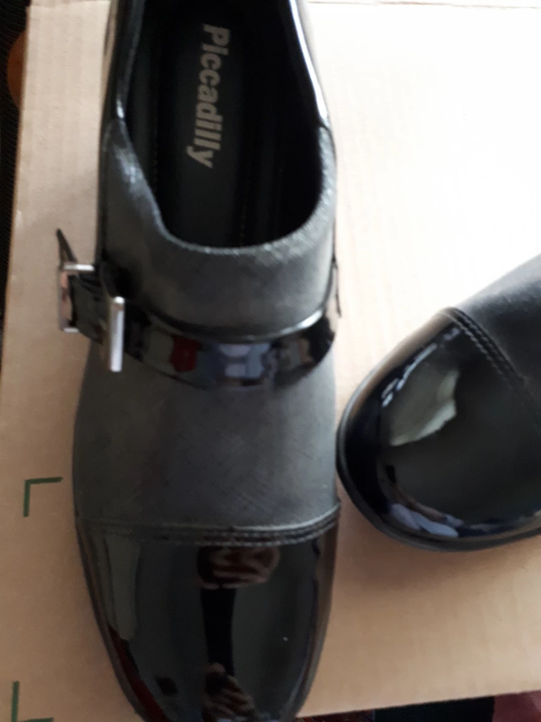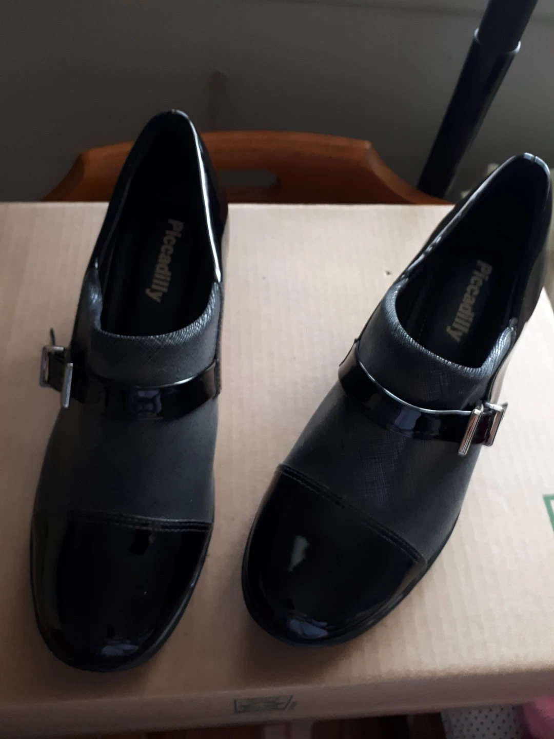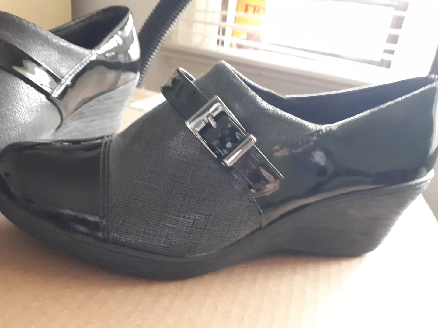 Pair of black women's shoes. Wedge heel. Size 8. Buckle detail. Patent leather and fabric upper.