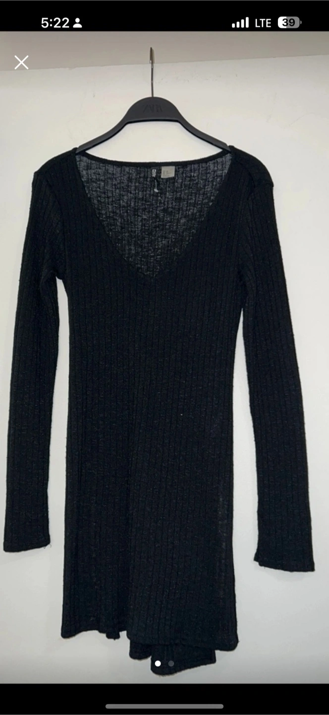 Long sleeve mini dress. Ribbed fabric. V-neck. Black.
